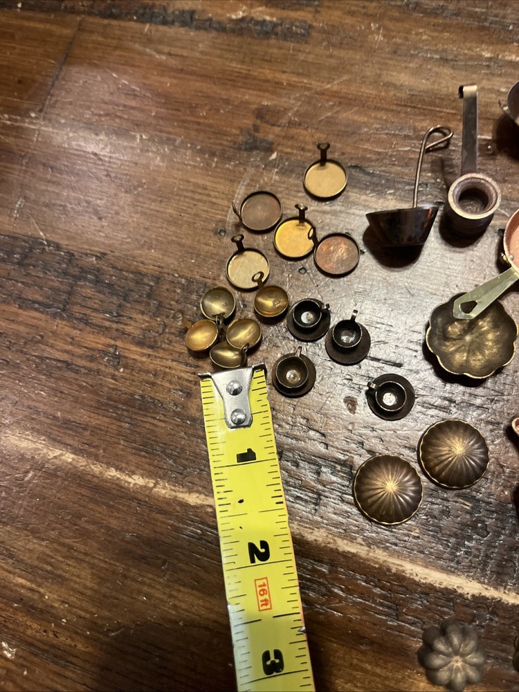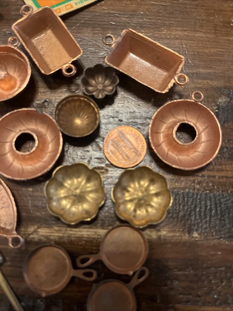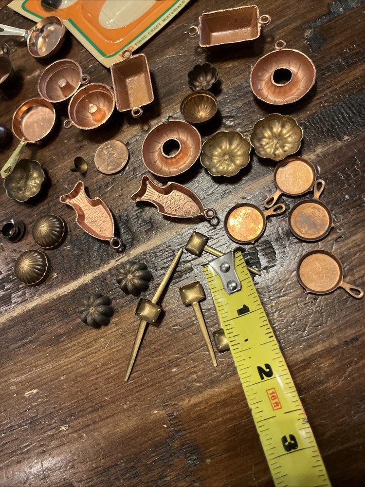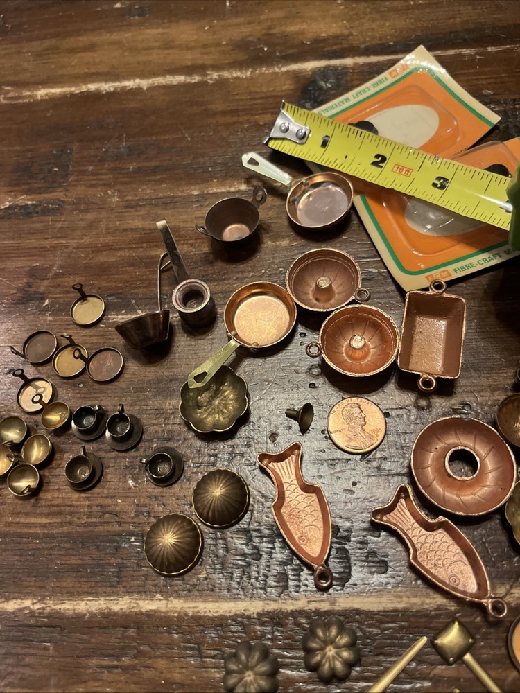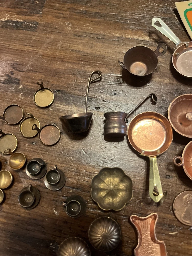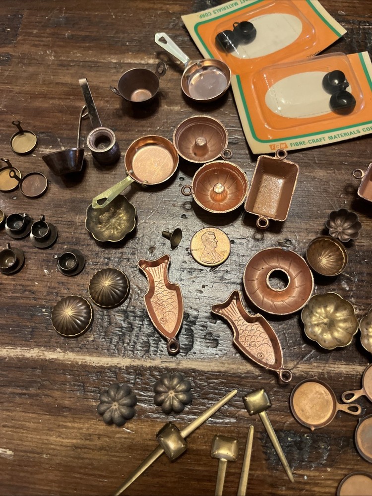 This VTG 48 Pc Miniature Copper and Metal Accessories Lot is perfect for adding a touch of vintage charm to your dollhouse kitchen. With a variety of kitchenware items included, such as metal cookstools, copper pots and pans, and vintage utensils, this lot is ideal for creating a realistic and detailed kitchen scene. Suitable for ages 16 and up, these miniatures are sure to enhance the ambiance of your dollhouse or diorama setting.