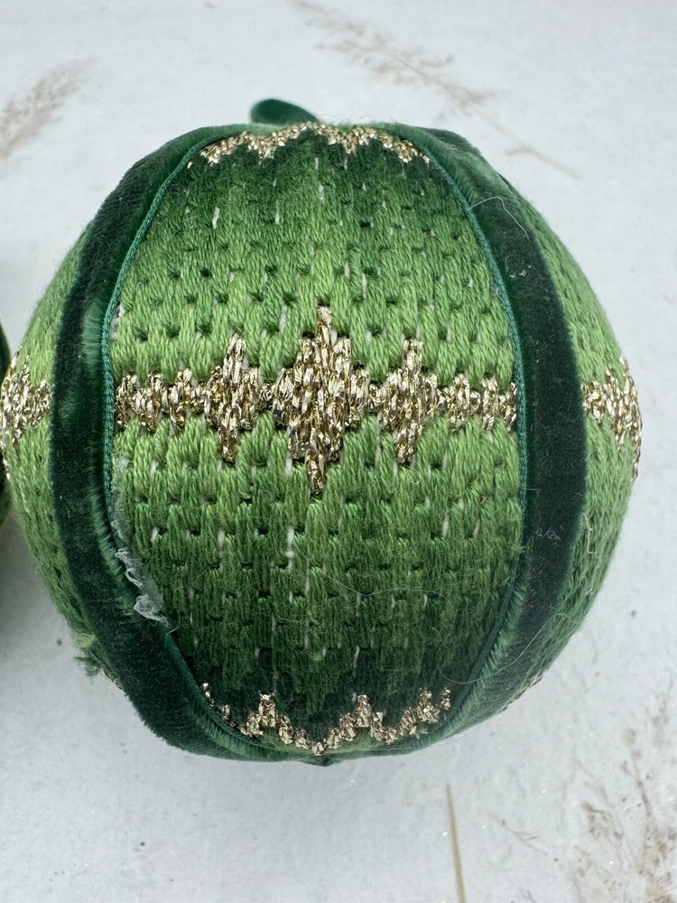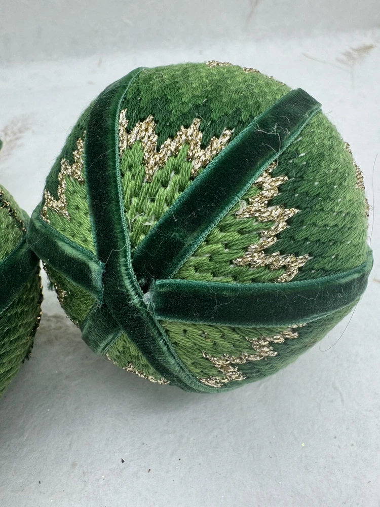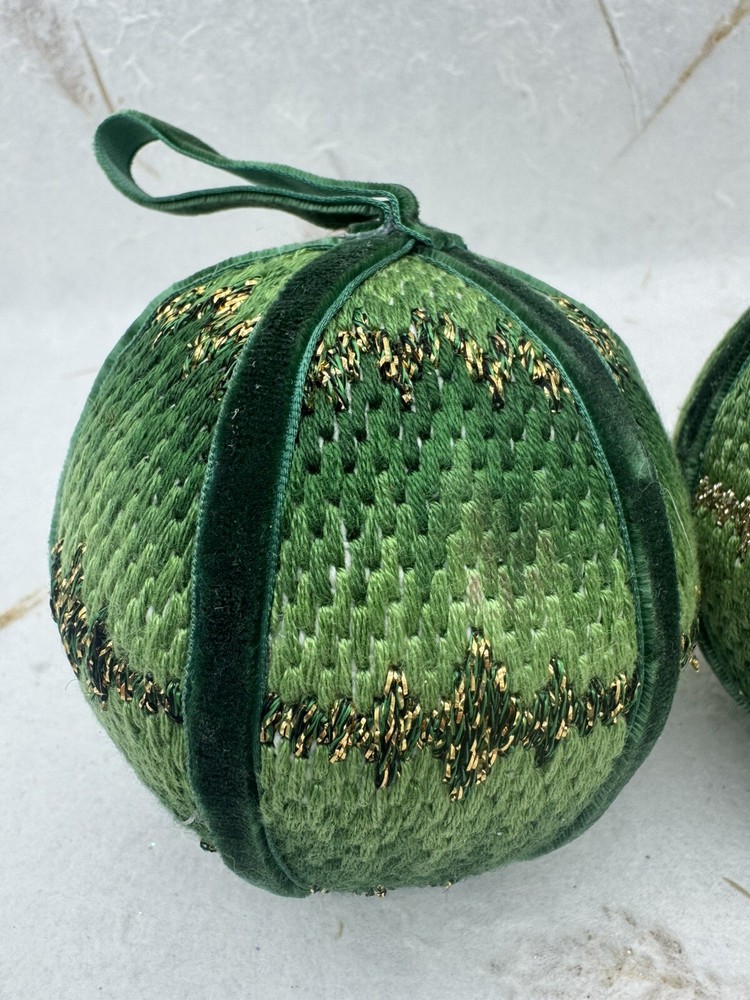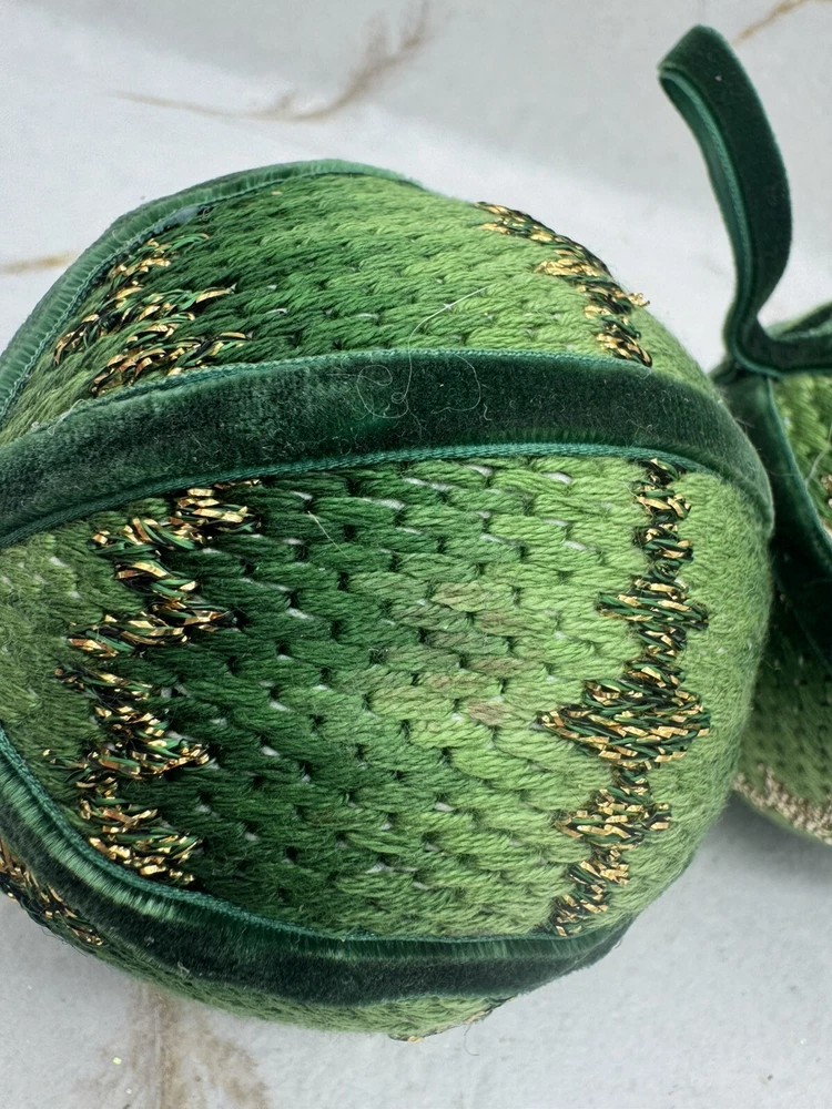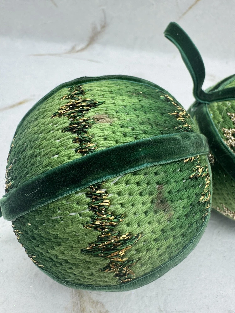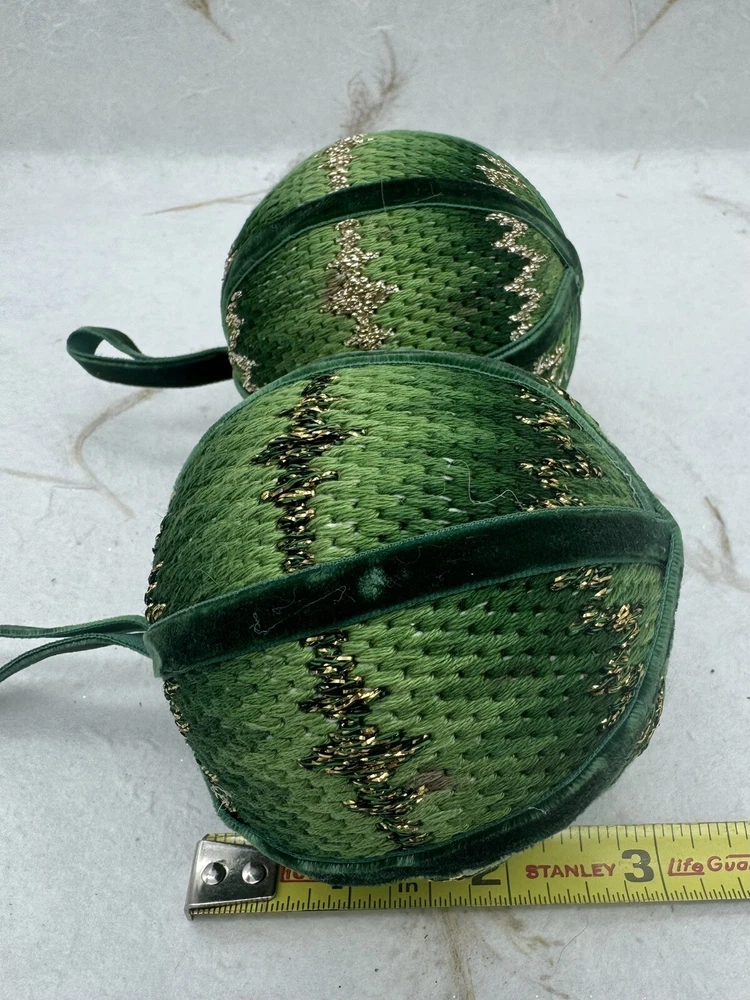π Add some vintage charm to your Christmas decorations with this lot of two handmade crocheted sweater ornaments. π These round balls have a 3-inch diameter and feature a knit sweater pattern with velvet ribbon accents. π The green and gold color combination adds a festive touch to any holiday display. π These ornaments are perfect for collectors or anyone looking for a unique and personalized holiday decoration. π They are vintage and handmade, making each one-of-a-kind. Whether you're adding them to your ornament collection or using them as a thoughtful gift, these crocheted sweater balls are sure to bring joy and warmth to any Christmas occasion. ππ Preowned vintage condition. NOTE: one has minor discoloration/stain. SOLD AS IS π Please view photos for closer inspection and more details. Thanks for shopping π