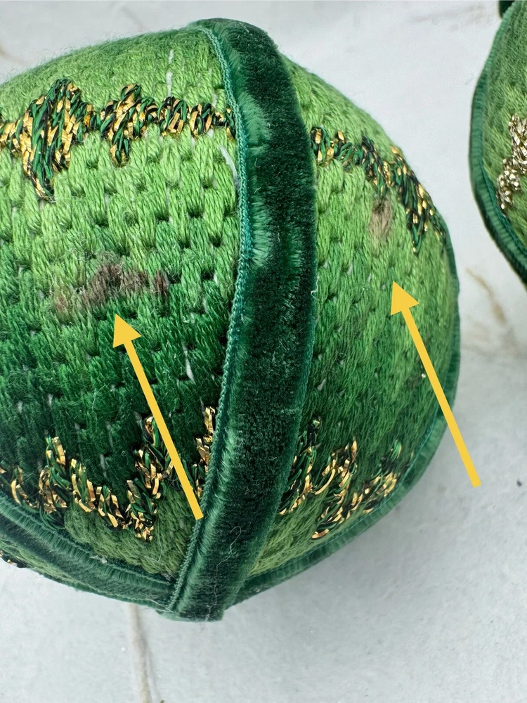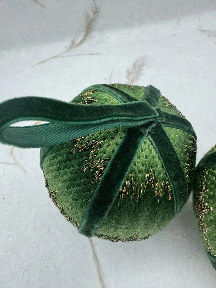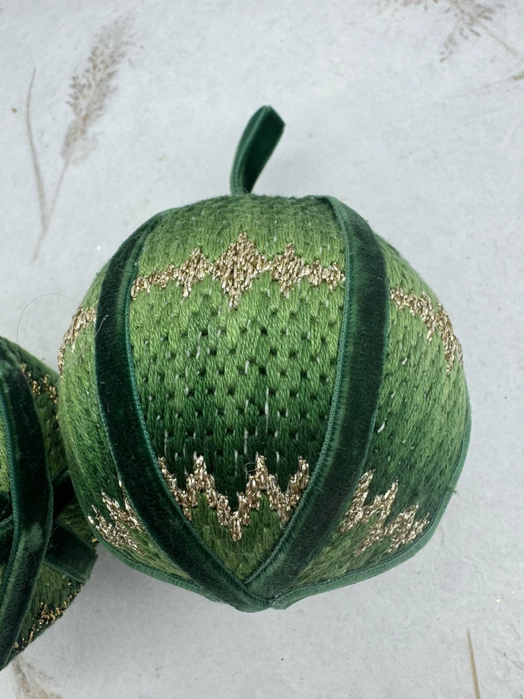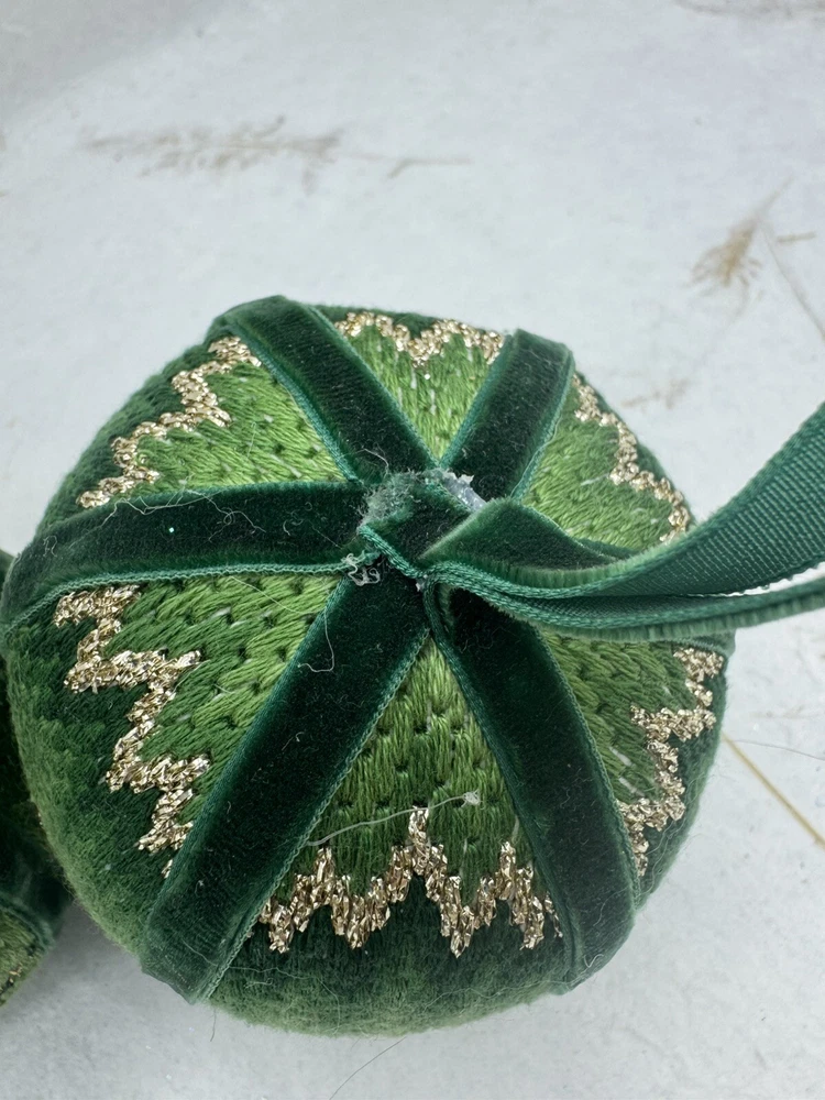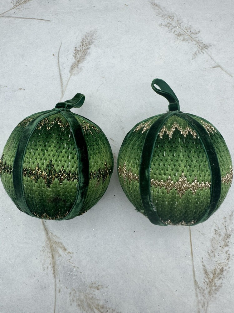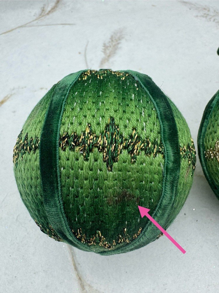 π Add some vintage charm to your Christmas decorations with this lot of two handmade crocheted sweater ornaments. π These round balls have a 3-inch diameter and feature a knit sweater pattern with velvet ribbon accents. π The green and gold color combination adds a festive touch to any holiday display. π These ornaments are perfect for collectors or anyone looking for a unique and personalized holiday decoration. π They are vintage and handmade, making each one-of-a-kind. Whether you're adding them to your ornament collection or using them as a thoughtful gift, these crocheted sweater balls are sure to bring joy and warmth to any Christmas occasion. ππ Preowned vintage condition. NOTE: one has minor discoloration/stain. SOLD AS IS π Please view photos for closer inspection and more details. Thanks for shopping π