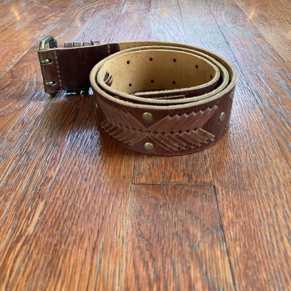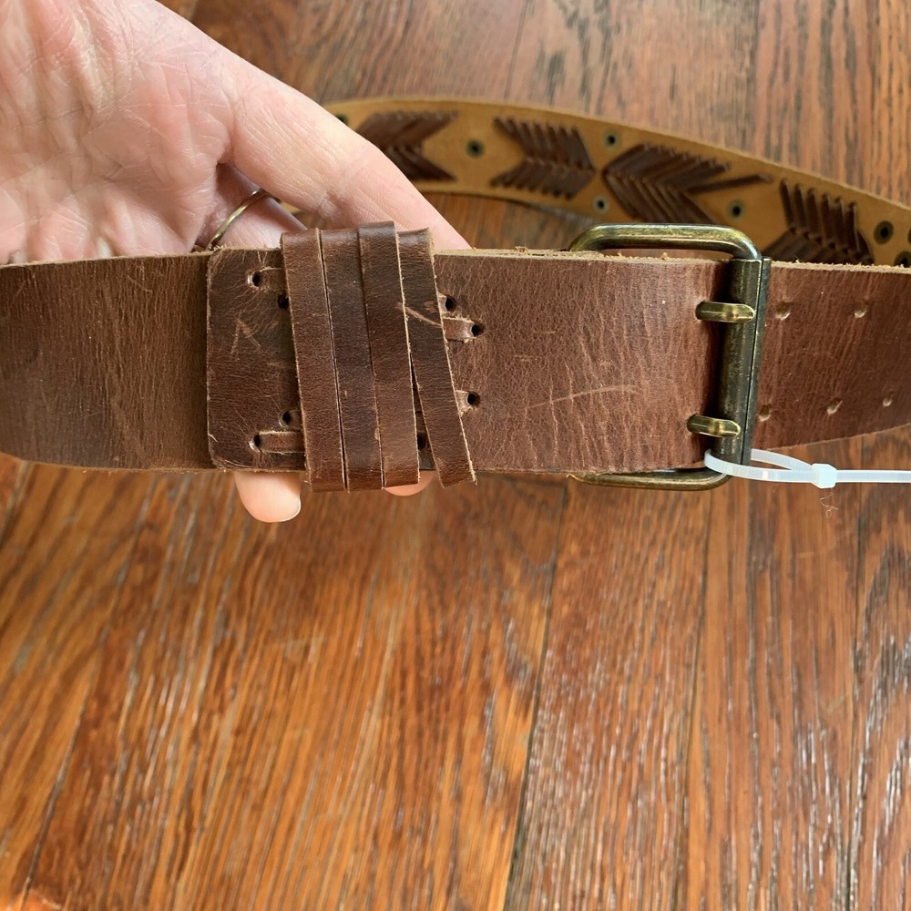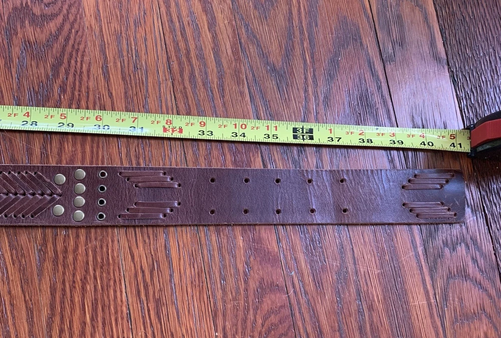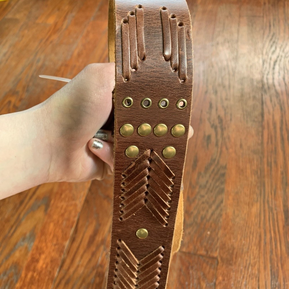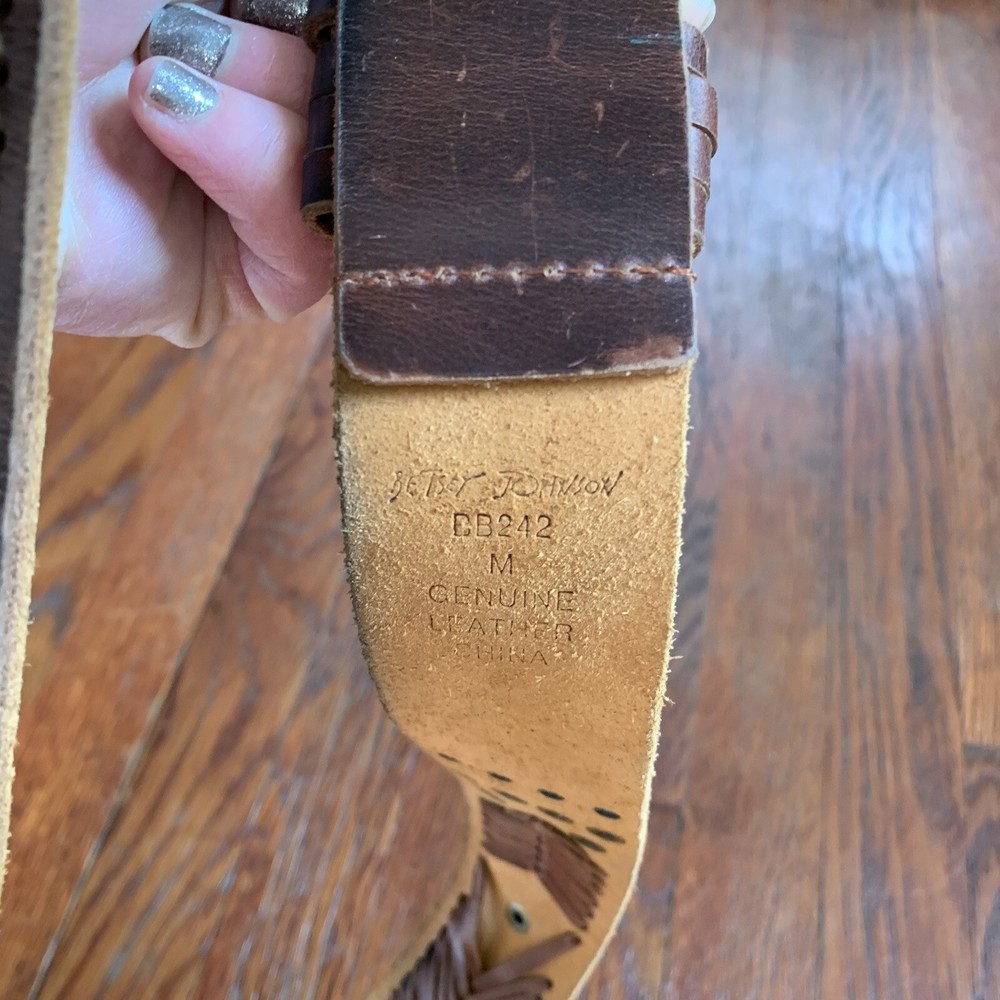 This vintage Betsey Johnson belt from the 90s is made of genuine brown leather with brass hardware. The belt features embellishments such as studs, giving it a boho style. It is a medium-sized belt with an adjustable buckle, making it suitable for regular-sized women. This Y2K studded belt adds a touch of retro and edgy flair to any outfit, perfect for those looking for a unique accessory with a vintage vibe. In EXCELLENT CONDITION!