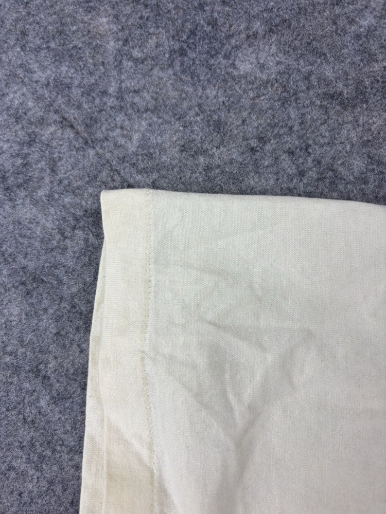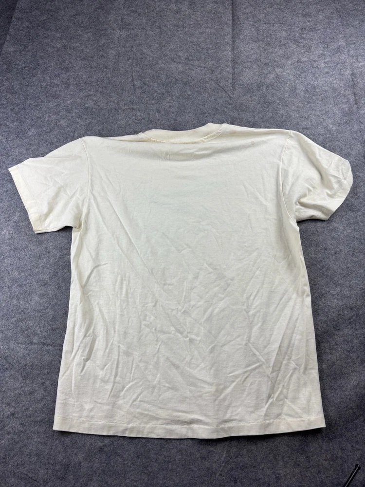 See stains** The VTG 90s Hanes Heavyweight 50/50 Single Stitch Cactus Petes Casino Players Club T-Shirt is a vintage piece featuring a graphic print design with a sailboat motif. Made of cotton material and manufactured between 1990-1999, this beige shirt is machine washable and has a crew neckline with short sleeves. The regular fit and size L make it a comfortable and classic addition to any 90s-themed wardrobe. Made in the United States by the Hanes brand, this T-shirt is a unique and stylish choice for any man looking to add a retro touch to his outfit.