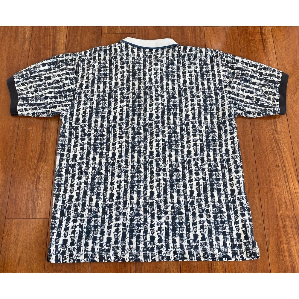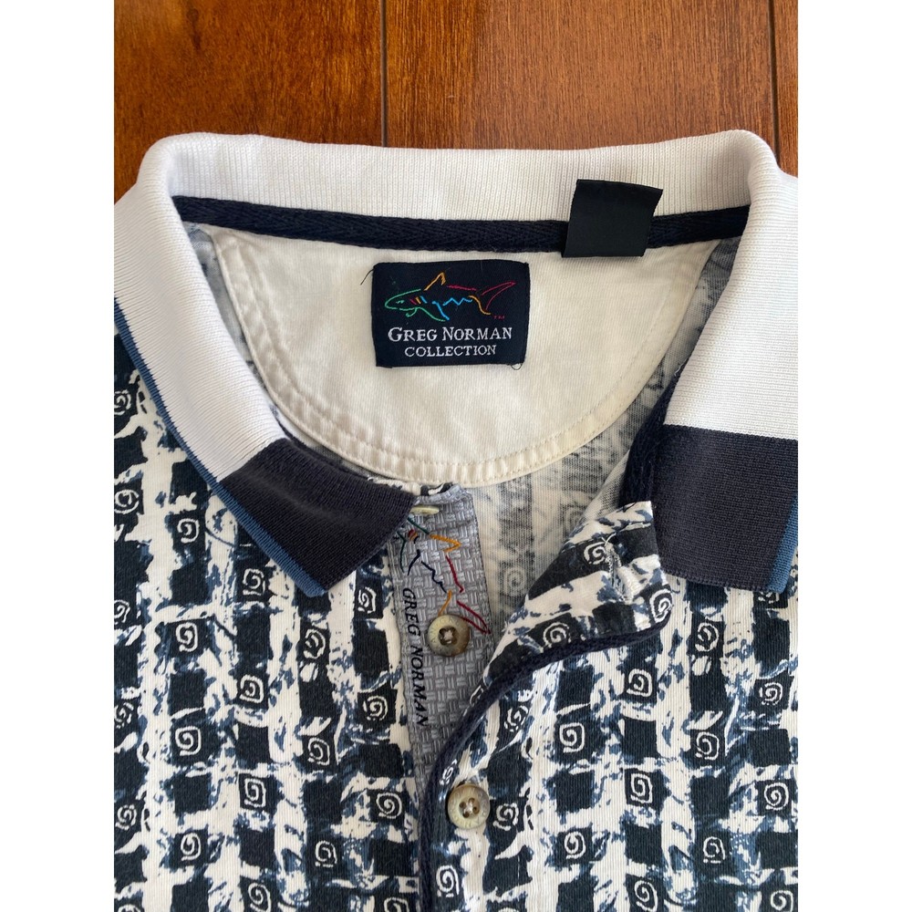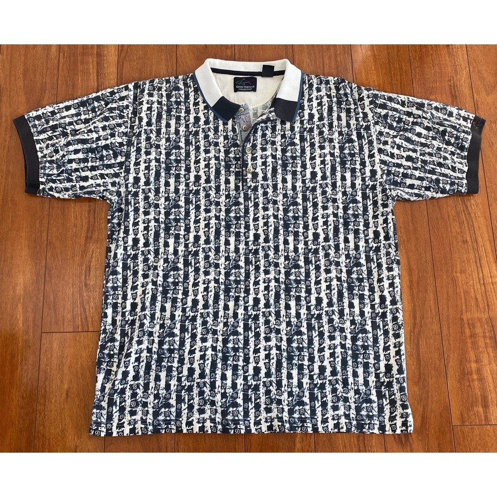 Please read all of description and check measurements before purchase! This listing is for a VTG 90s RETRO Greg Norman abstract graphic polo golf shirt. Size large (see below for exact measurements) and made of 100% cotton. Used and in good condition. If you have any questions please do not hesitate to ask and thanks for looking :) Measurements: Chest Width (pit to pit): 23.5" Length (collar to hem): 28" Sleeve Length (armpit to end of sleeve): 6.5"