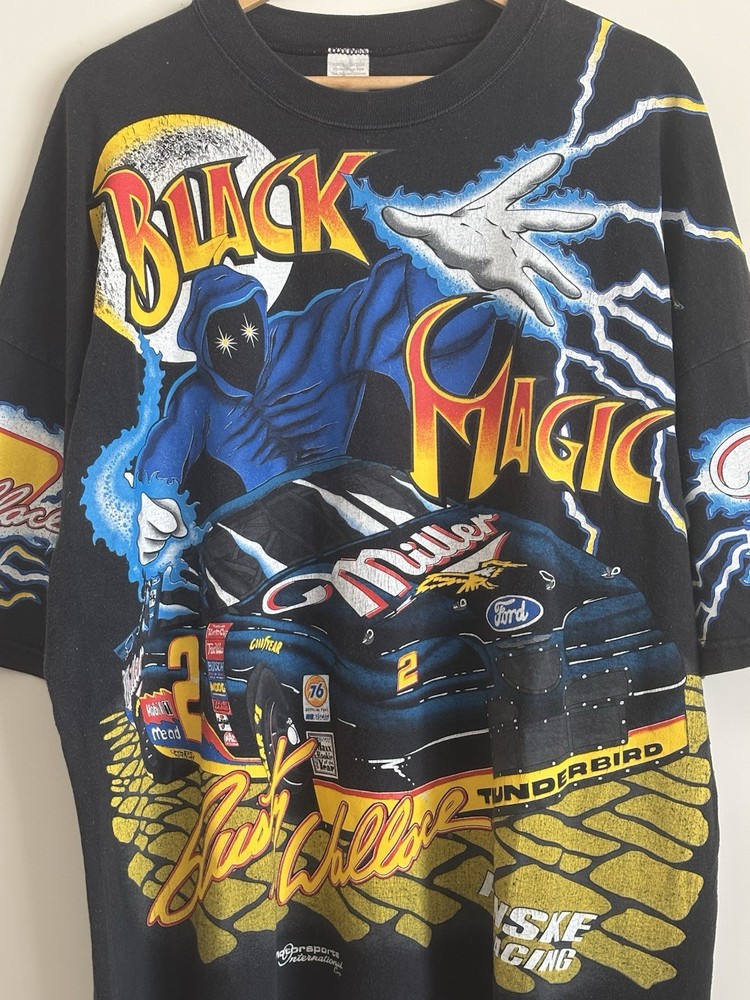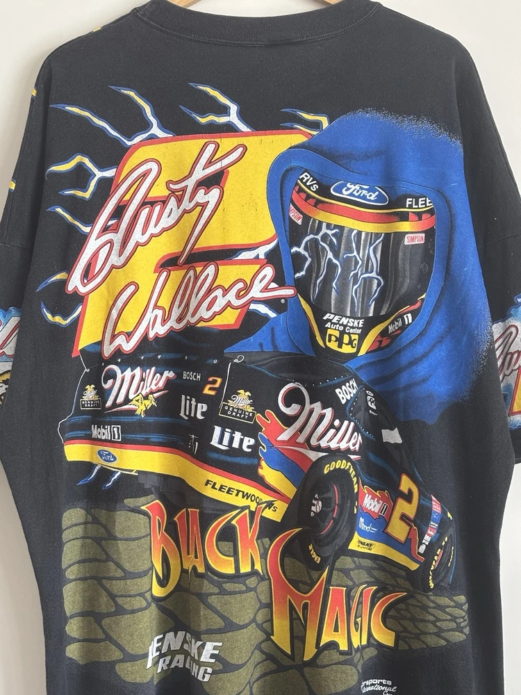 One of the most beautiful Nascar all over prints you will find online. Featuring Rusty Wallace “The Black Magic”. The tshirt is in a very good condition. No visible flaws. Please see all the pictures. Measurements: Length: 31” Width: 28” Size: 2XL