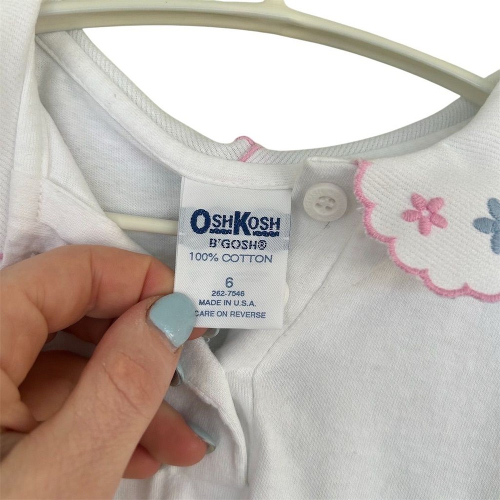 Brighten up your little one's wardrobe with this charming OshKosh B'gosh blouse. Crafted from 100% cotton, this long-sleeve top features a delightful floral pattern that adds a touch of whimsy to any outfit. The scallop collar and elasticized cuffs provide a sweet, classic look, perfect for casual outings or family gatherings during the fall season. Pair it with jeans or a skirt for a versatile ensemble. This blouse is machine washable for easy care. The item is in good condition but has some flaws. Discoloration from age noted please review photos Keywords: OshKosh B'gosh, girls blouse, floral pattern, long sleeve, scallop collar, elasticized cuffs, fall fashion, casual wear, machine washable, size 6, white blouse, cotton blouse, girls clothing, floral theme, kids fashion. Brand: OshKosh B'gosh Color: White Department: Girls Size: 6 Type: Blouse Sleeve length: Long Sleeve Theme: Floral Material: 100% Cotton Pattern: Floral Features: Elasticized Cuffs, Scallop Collar Season: Fall Occasion: Casual Garment care: Machine Washable Smoke free household. Pet friendly household. Please see pictures for measurements. Feel free to reach out with any questions and we’ll try to answer as best we can.