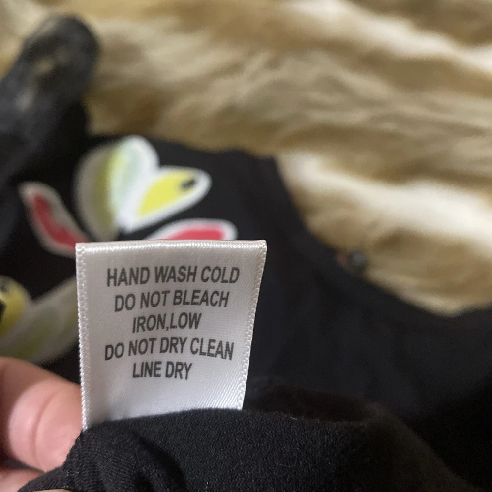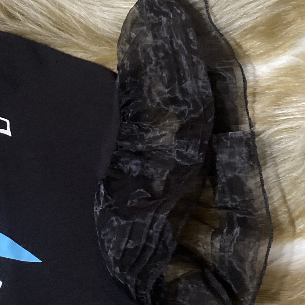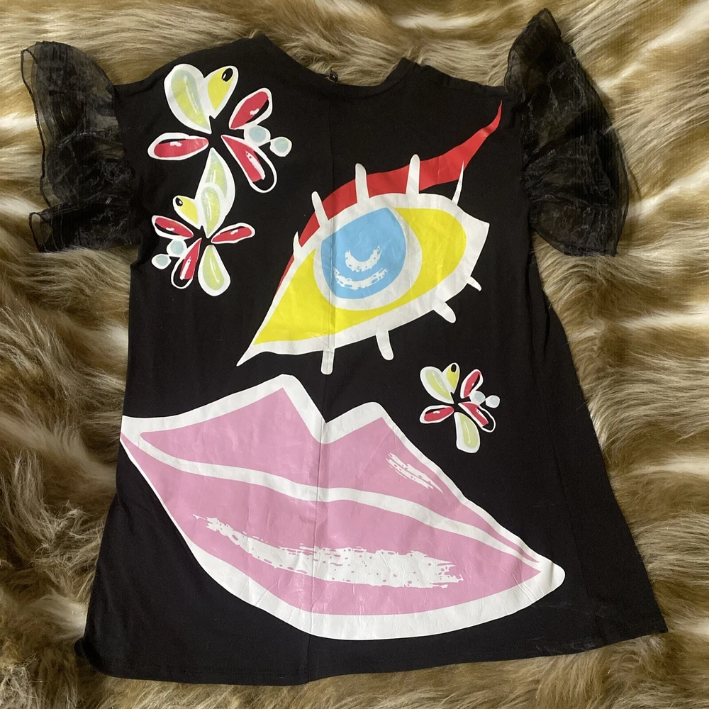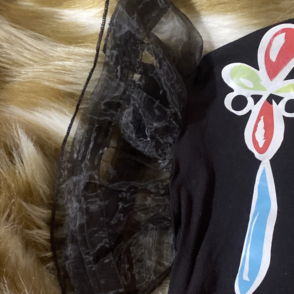 Super cool top, not sure if it’s vintage or not. Black shirt with black sheer ruffle sleeves and amazing abstract face art. Size is medium.