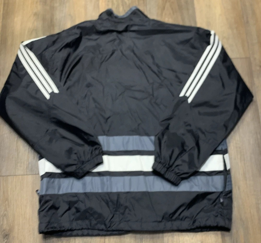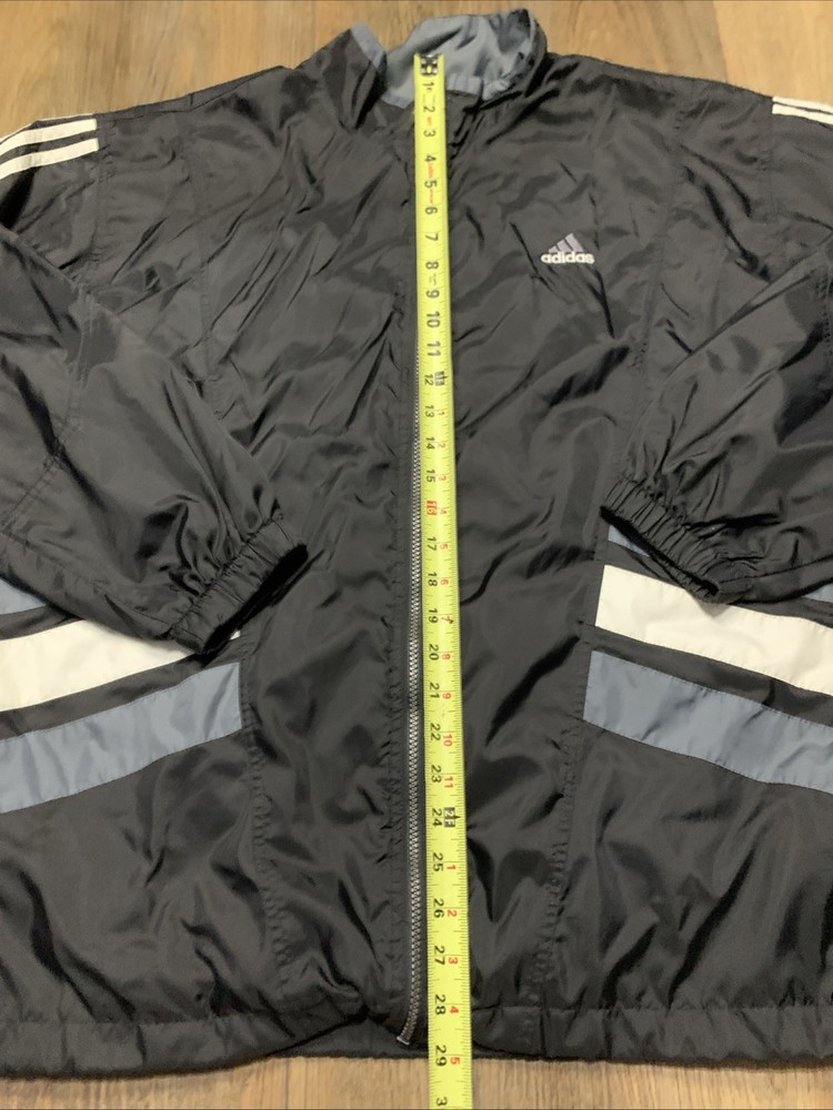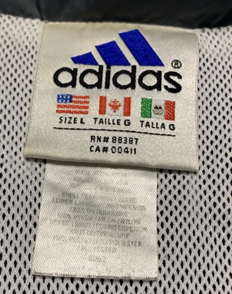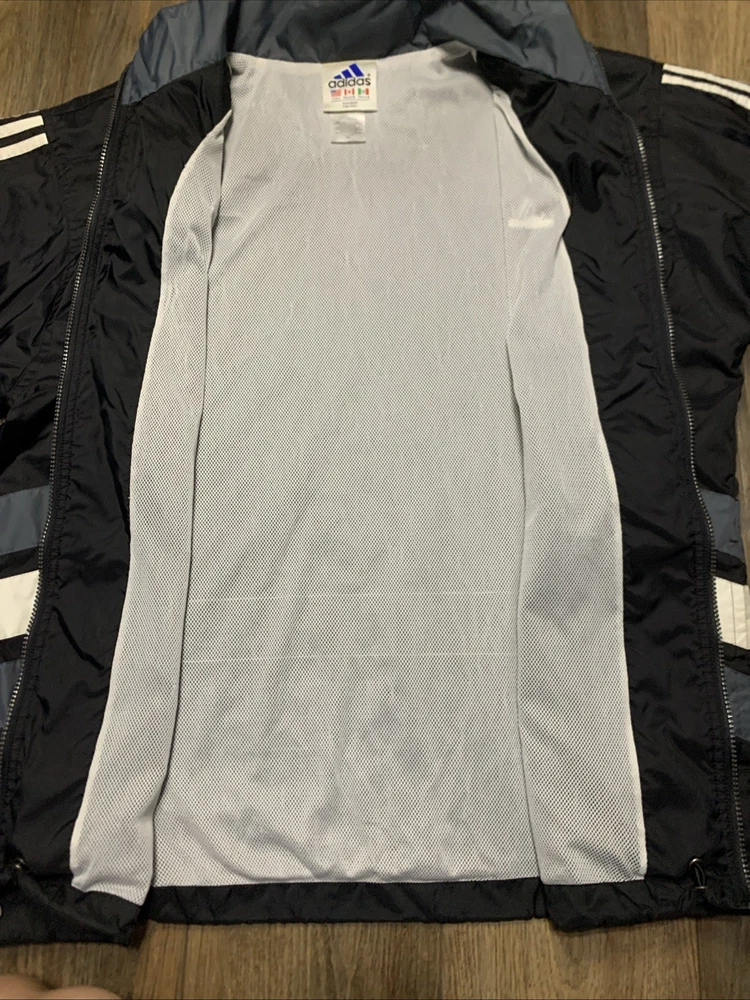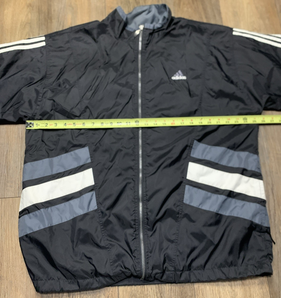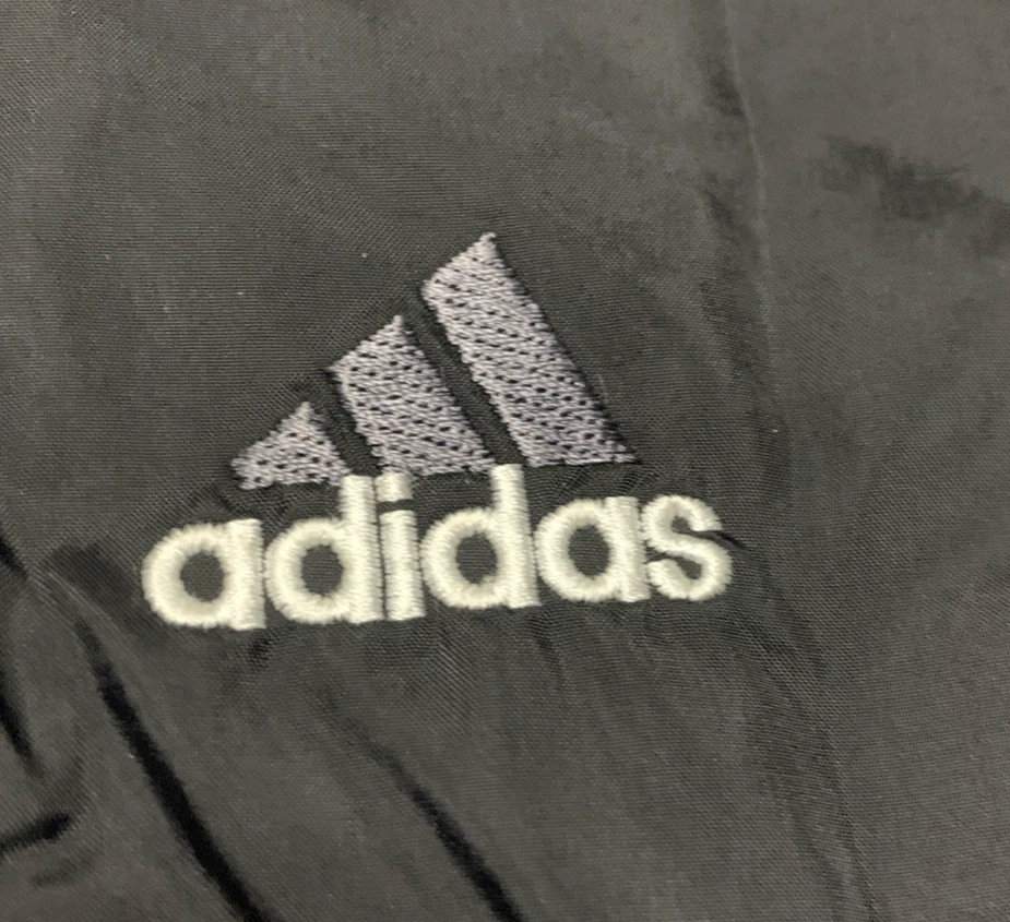 This VTG Adidas 90s Men's Full Zip Jacket is a vintage windbreaker with an embroidered logo and stripe pattern, perfect for a casual or travel occasion. Made of durable nylon with a softshell fabric type, this mid-length jacket features a stand-up collar and a full zip closure for ease of wear. The multicolor design and retro 90s theme make it a stylish choice for the winter, fall, and spring seasons. With a regular fit and polyester lining and insulation, this jacket offers both comfort and performance for activities like gym training, walking, and running.