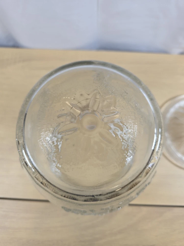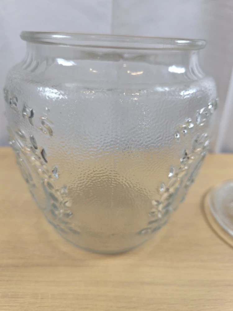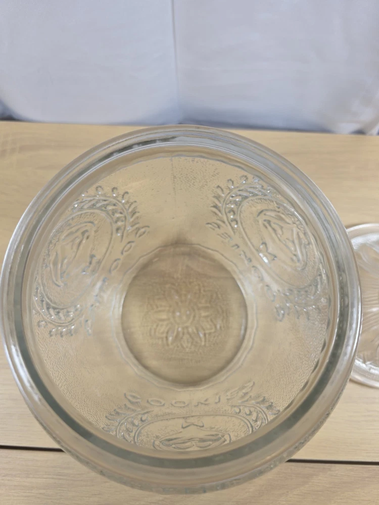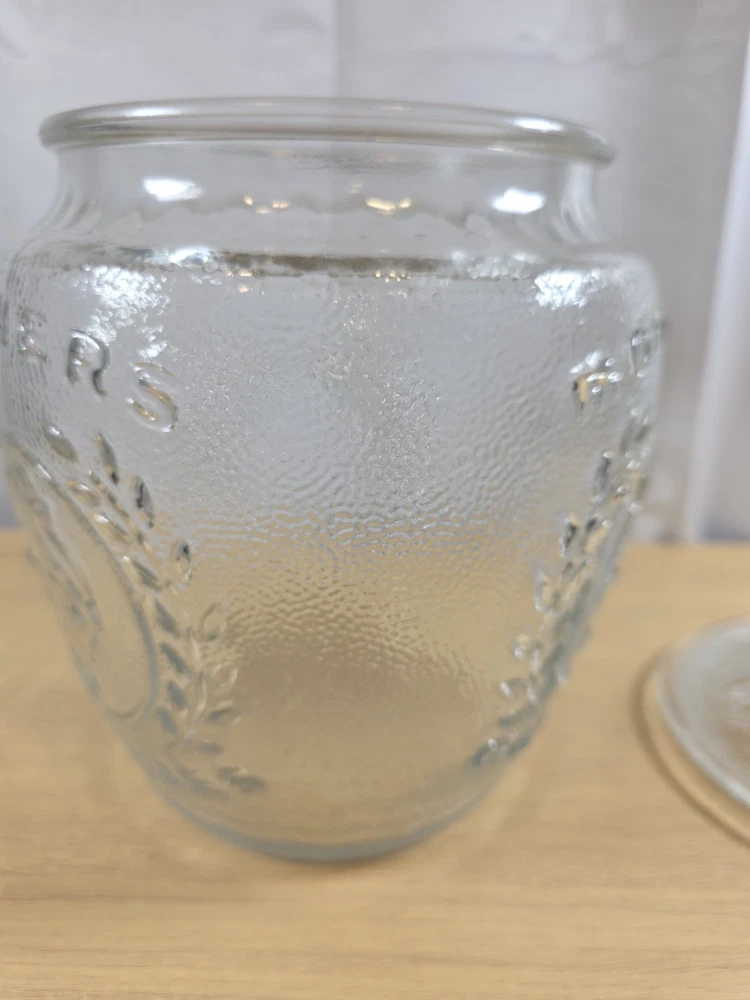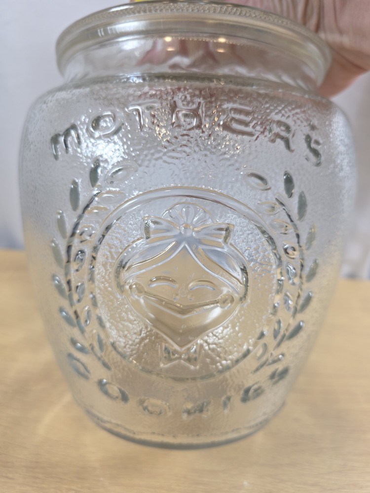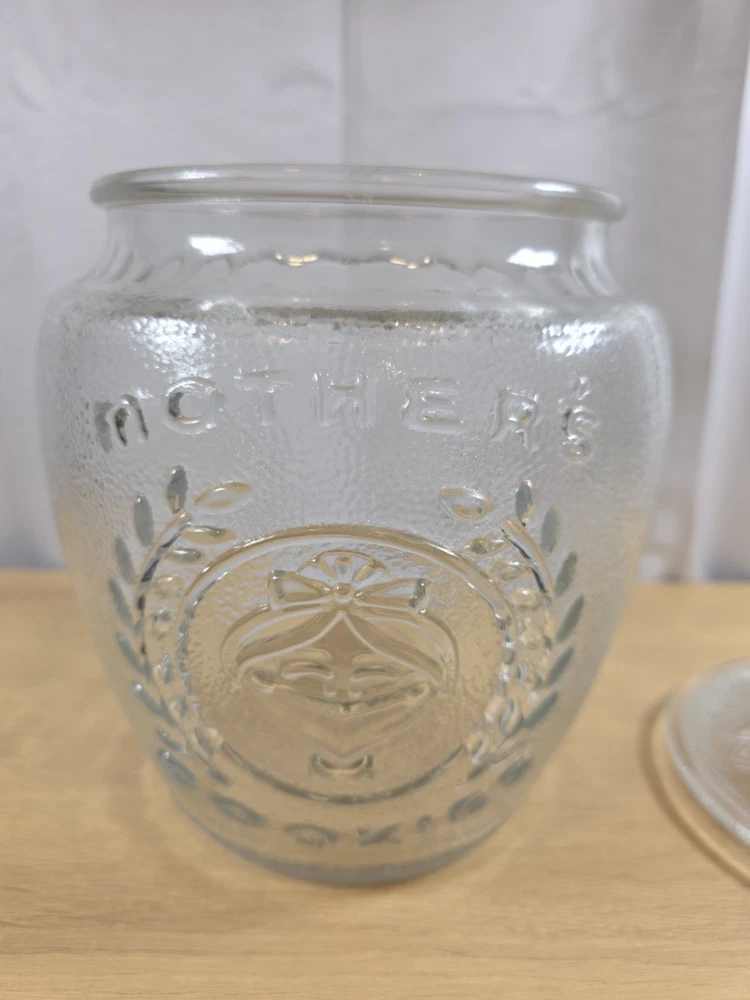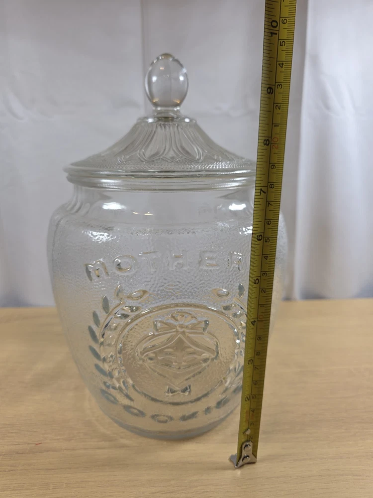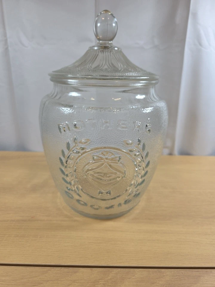 Vintage Anchor Hocking "Mother's Cookies" embossed glass cookie jar with lid. Released in the 1980's, this collectors item brings nostalgia and functional use to any kitchen. 10.25 inches in height and roughly 7 inches across. This is a large capacity cookie jar. Condition: Excellent pre-owned condition. No chips or rough spots on the lid or rim, no cracks or chips. Please reach out with any questions or if you have a reasonable offer. Thanks for checking out our listing!
