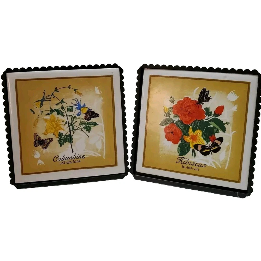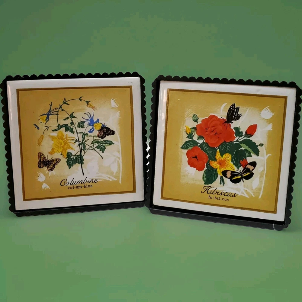 Vintage Ceramic Botanical Art Trivet Hot Plate Flowers Floral Wall Hanging Columbine Hibiscus Butterly Kitchen. Excellent Condition. Box included