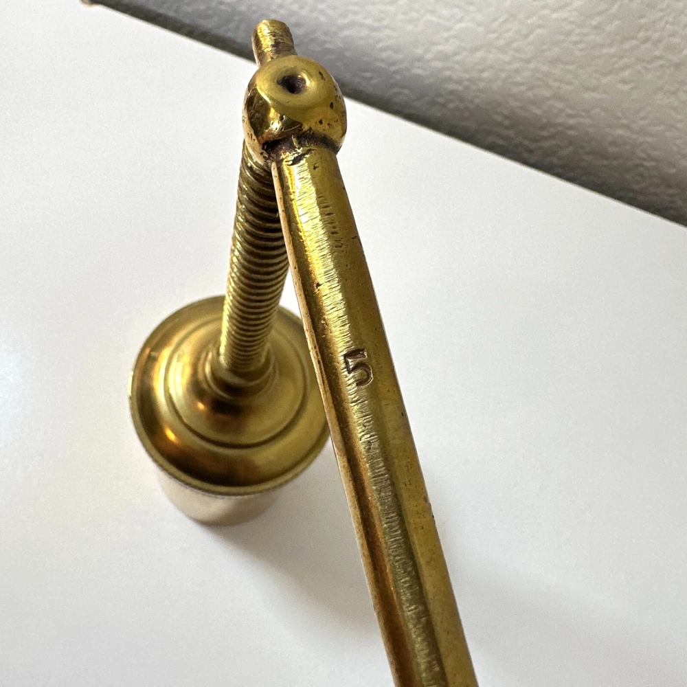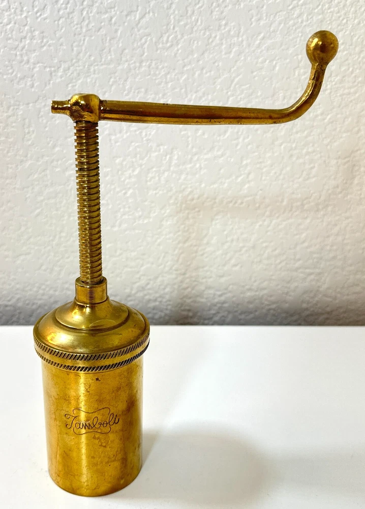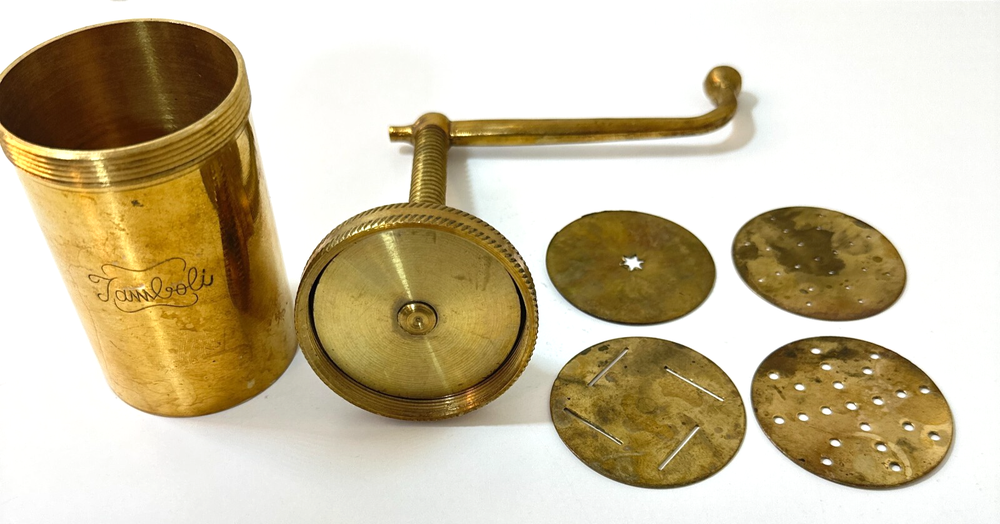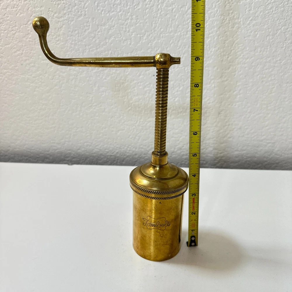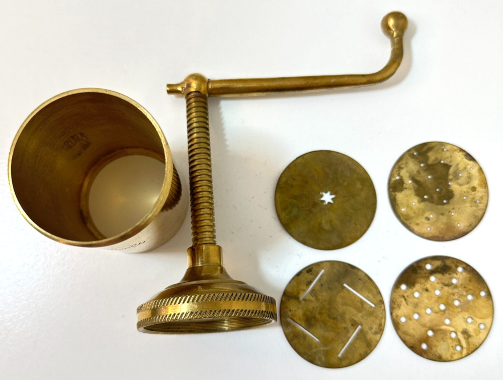 Vintage Brass Jamboli #5 Food Press Retro Kitchen Tool Hand Crank Brass Noodle Mill Approximate Measurements (inches): 2.5" round x 6" h at lowest setting x 9" h when fully unwound Weight: 1 lb, 7 oz The Vintage Brass Jamboli Food Press is a retro kitchen tool that features a hand crank mechanism. Made of brass, this small-sized food press includes 4 discs of varying shapes for pressing dough or pasta. Pre-loved & in great used condition. Some signs of age throughout consistent w/ age, including patina on multiple surfaces. See photos for close ups & measurements. Ready to ship!