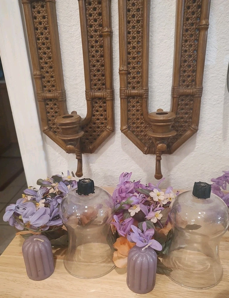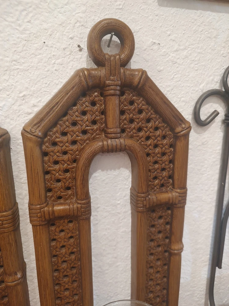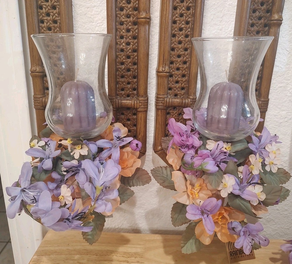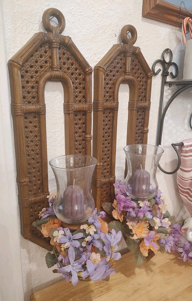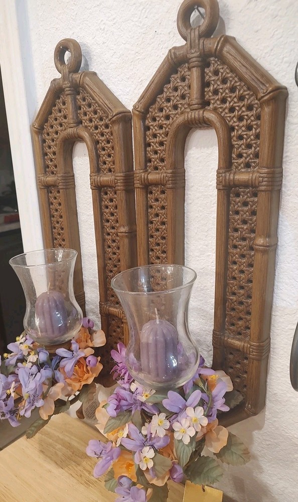Set of 2 VTG Burwood Homco Faux Rattan Boho Wall Sconces Hanging Candle Holders With Glass Votives, Floral Candle Rings and Candles, good condition.