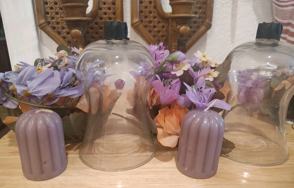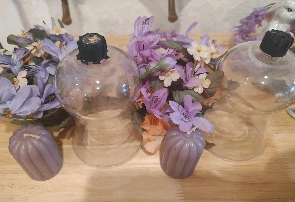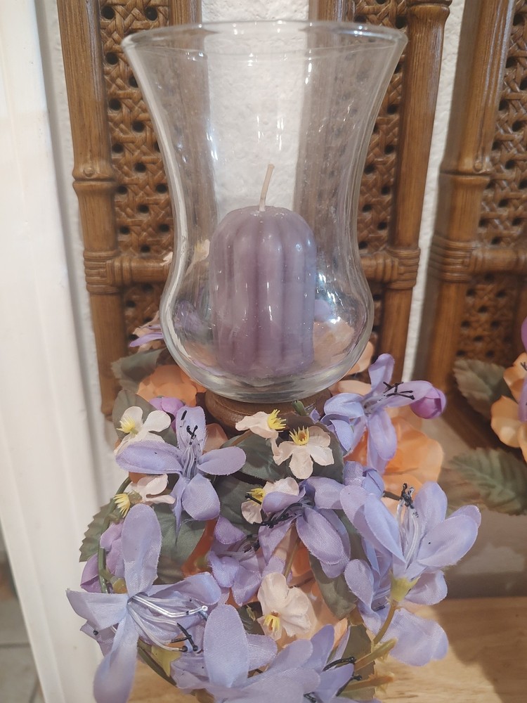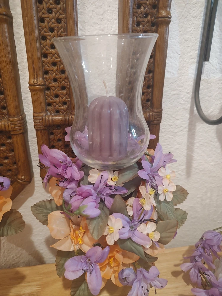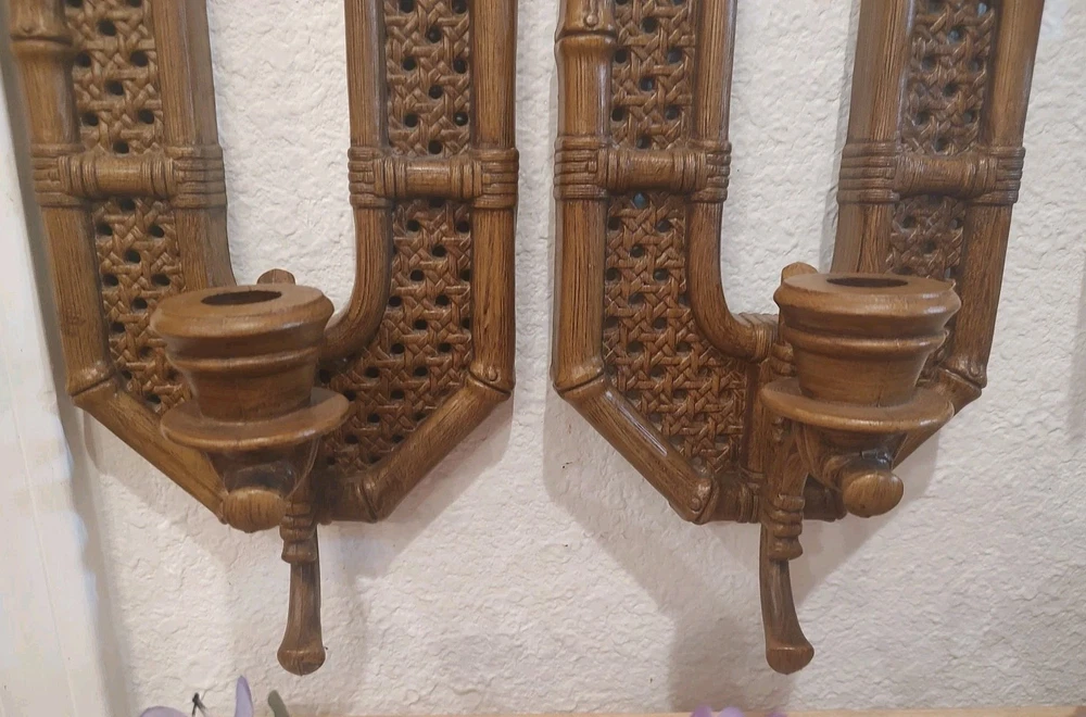 Set of 2 VTG Burwood Homco Faux Rattan Boho Wall Sconces Hanging Candle Holders With Glass Votives, Floral Candle Rings and Candles, good condition.