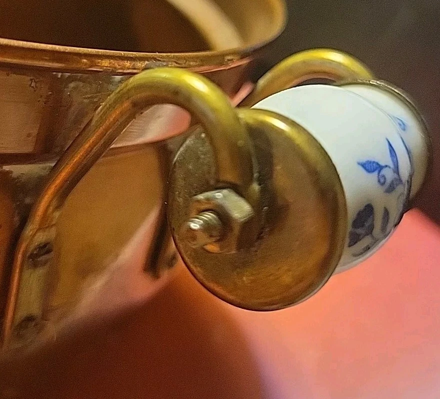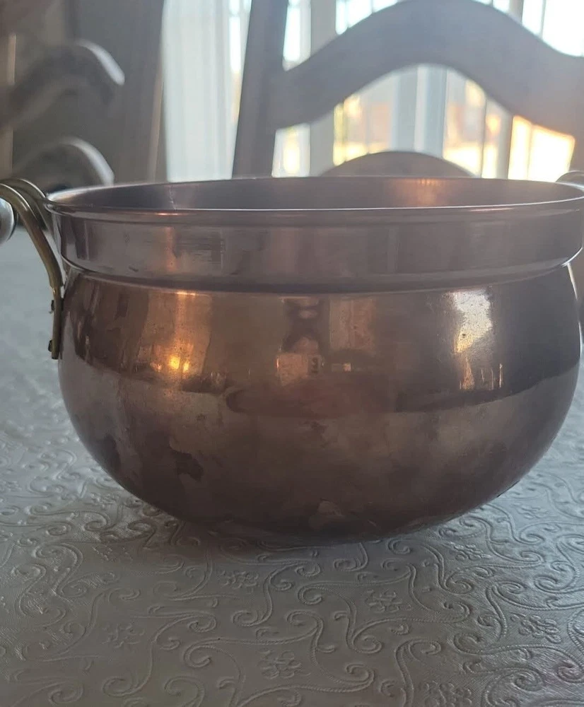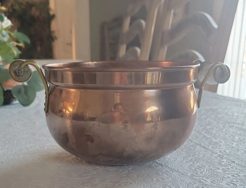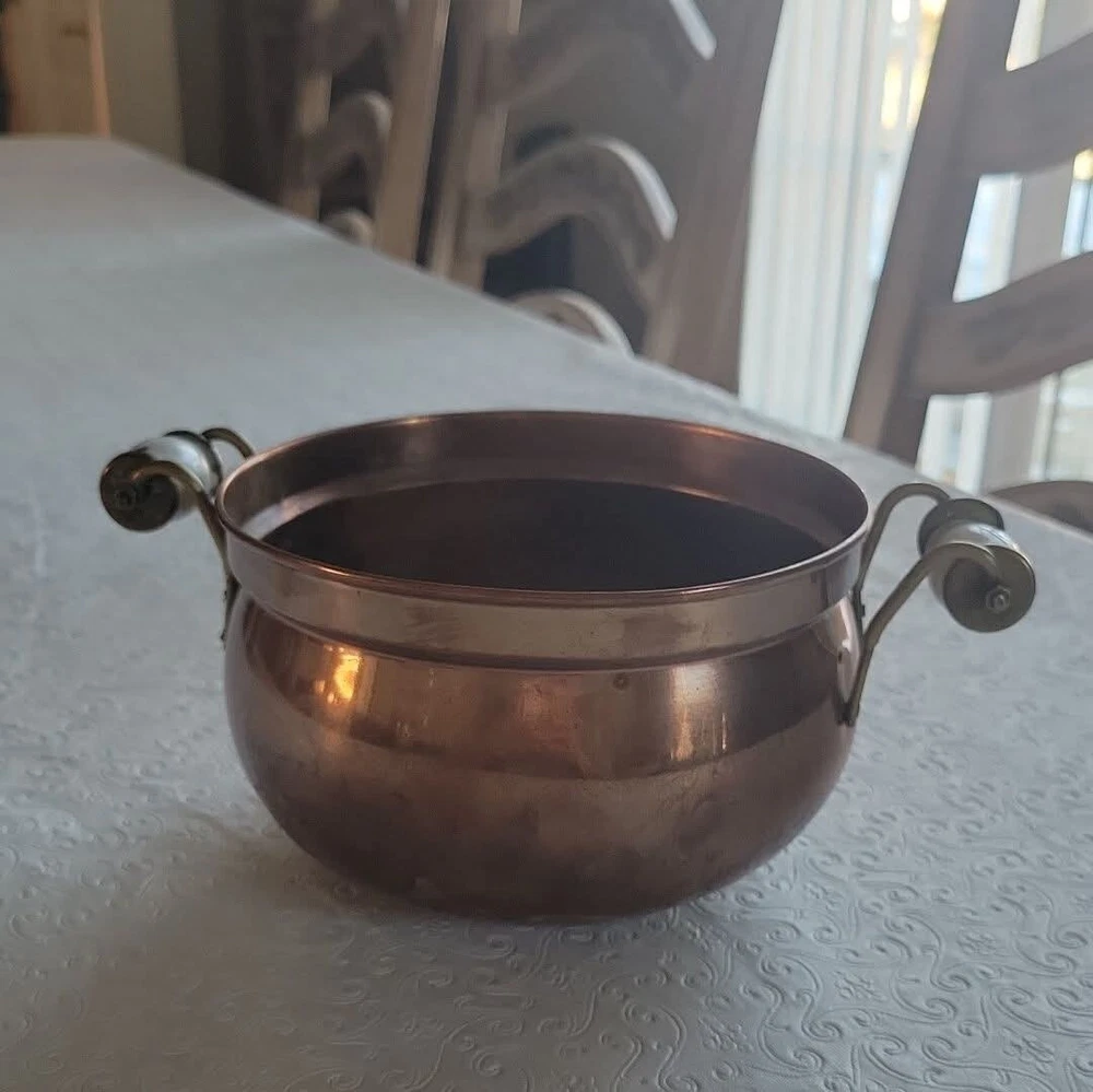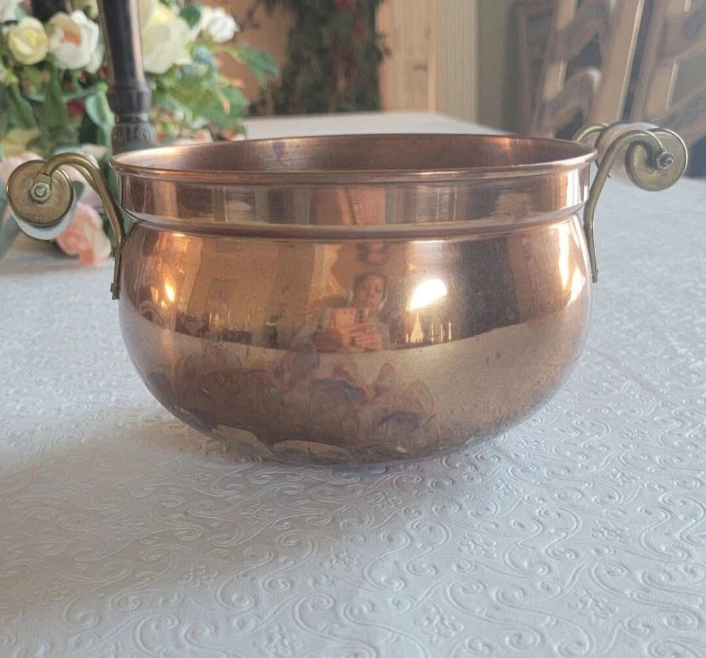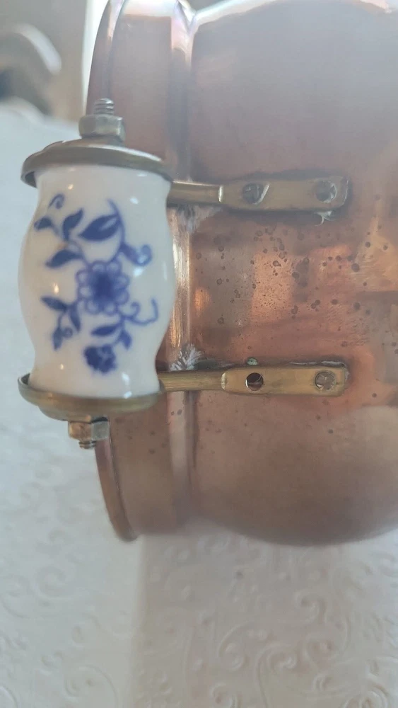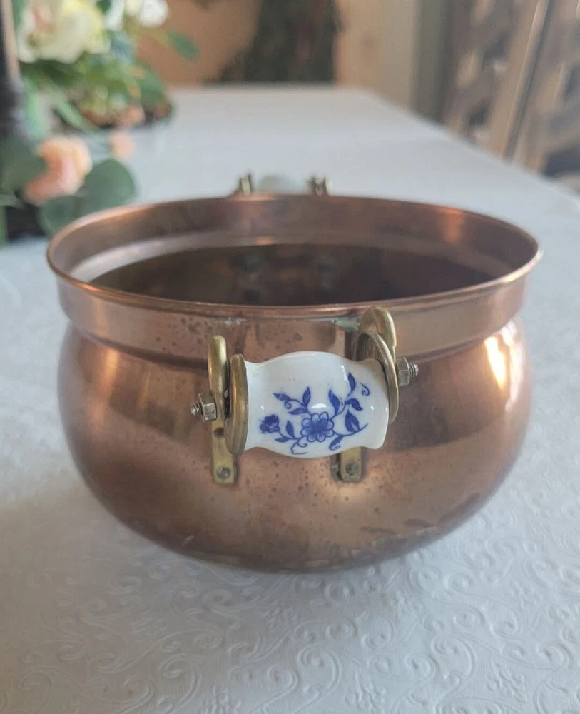 The product is a vintage copper pot with blue and white Delfts porcelain handles from Holland. It serves as a planter or jardiniere, adding a decorative touch to any space. Made of copper, it showcases a traditional Dutch design with a touch of elegance and charm. The pot measures 4 inches tall and 6 inches in diameter. There are oxidized spots throughout. See photos. E- mail me with questions. Thanks for checking out my auctions!