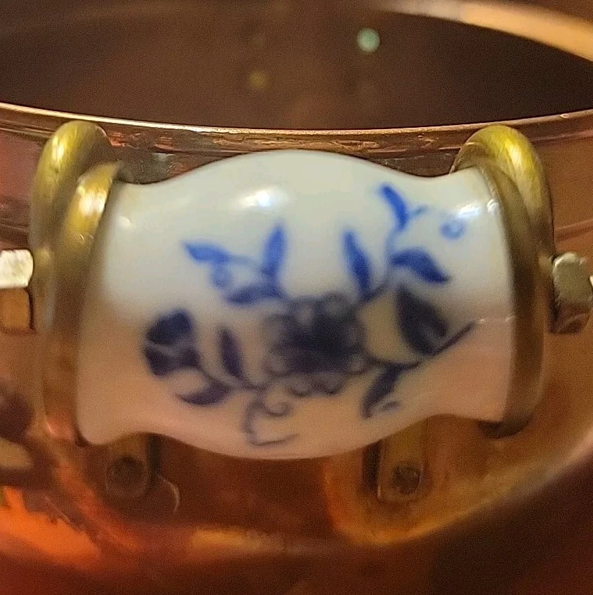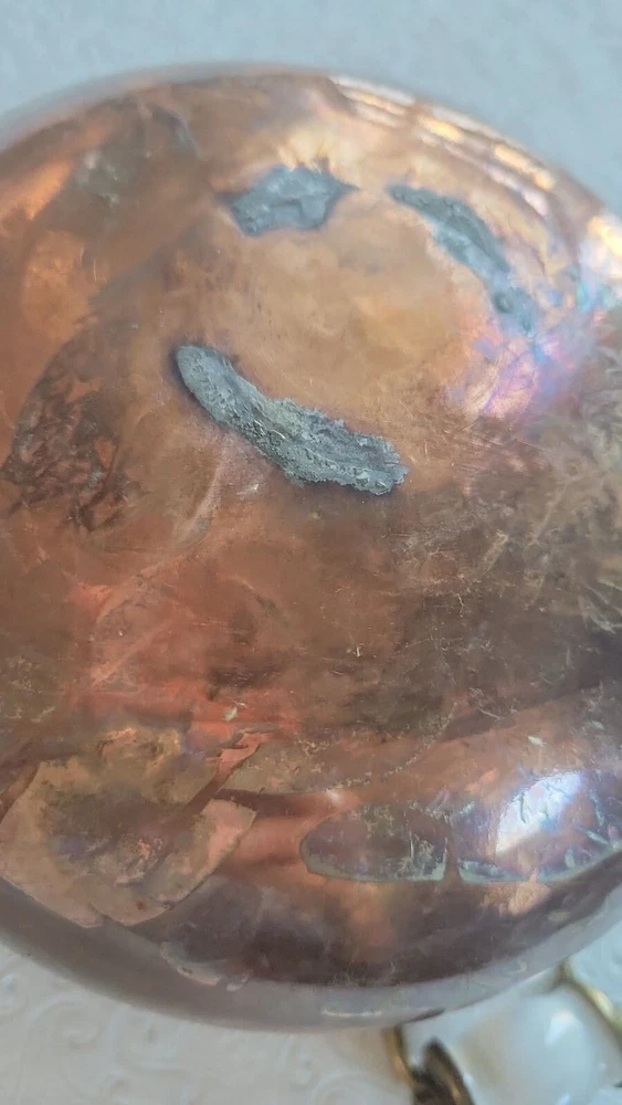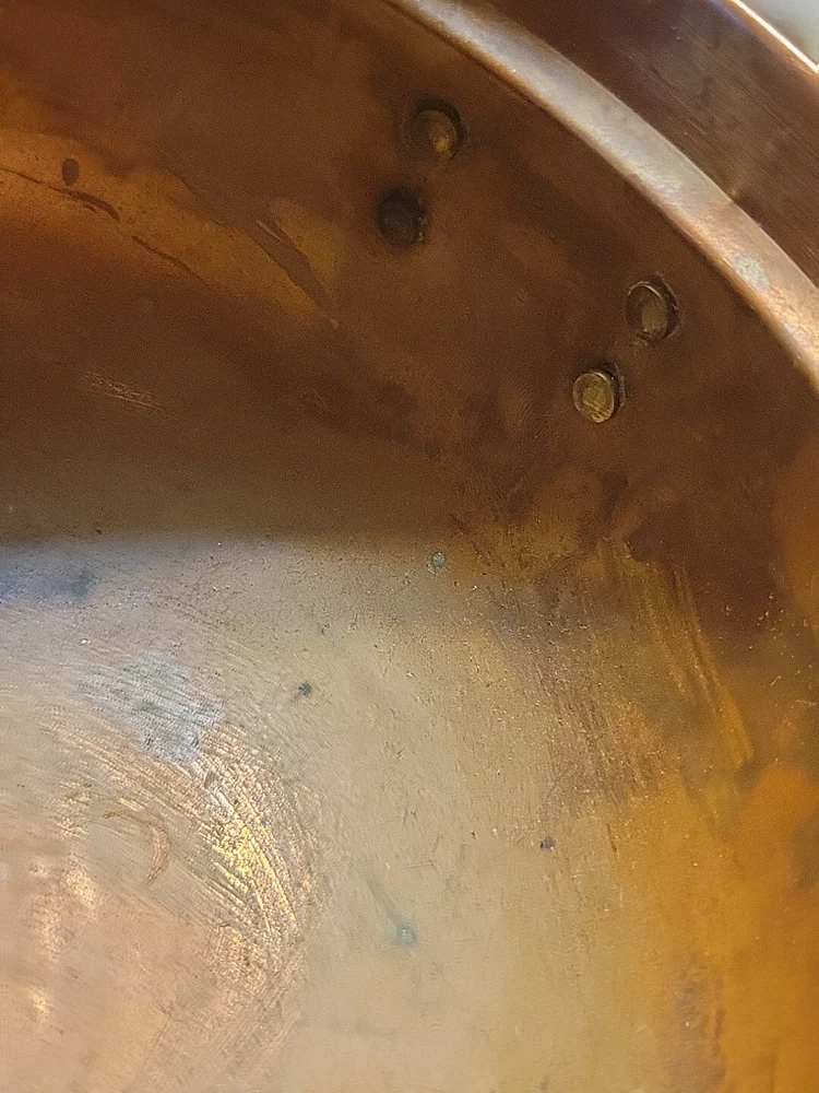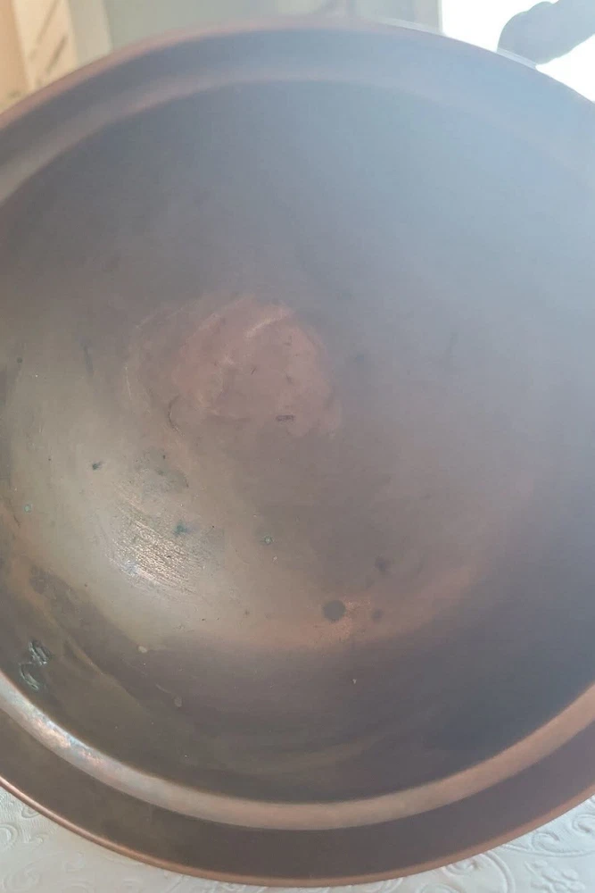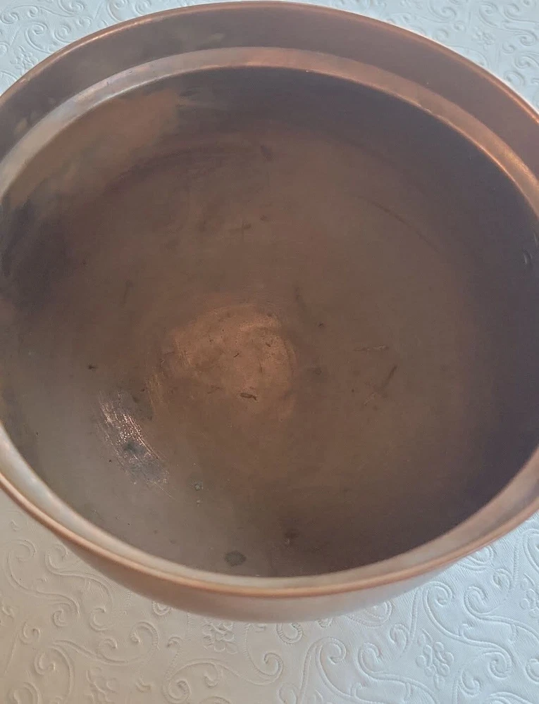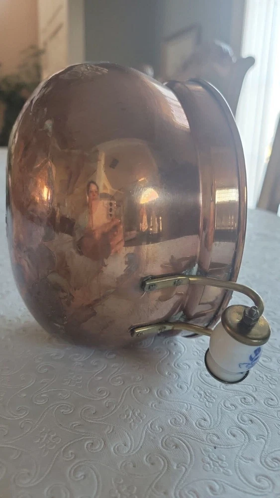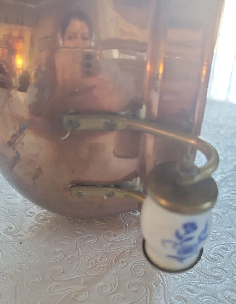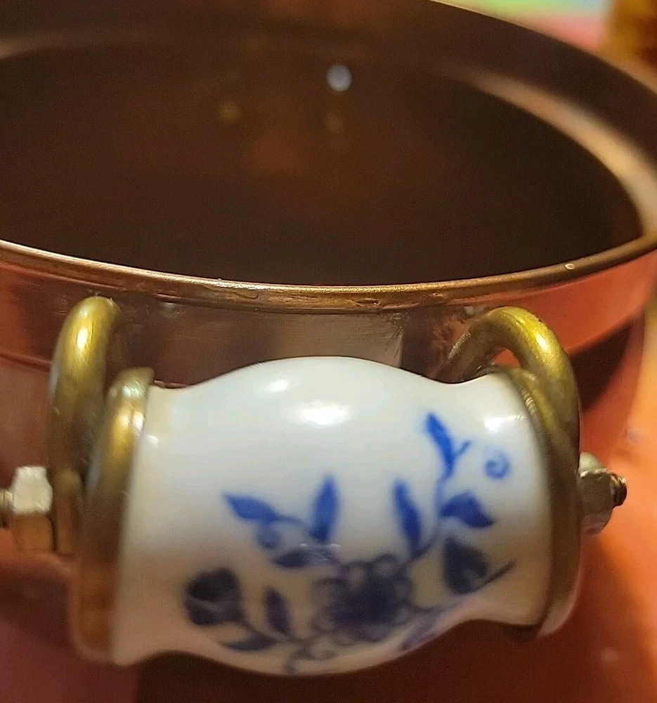 The product is a vintage copper pot with blue and white Delfts porcelain handles from Holland. It serves as a planter or jardiniere, adding a decorative touch to any space. Made of copper, it showcases a traditional Dutch design with a touch of elegance and charm. The pot measures 4 inches tall and 6 inches in diameter. There are oxidized spots throughout. See photos. E- mail me with questions. Thanks for checking out my auctions!
