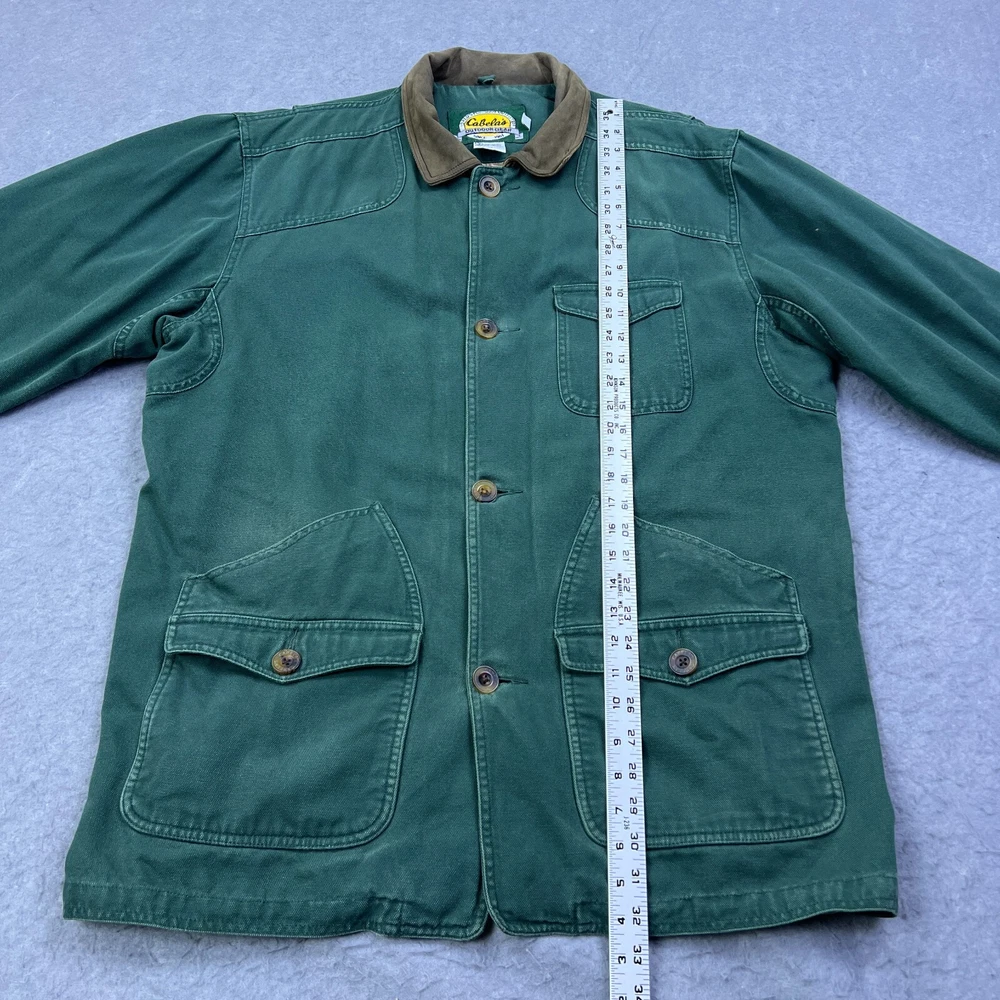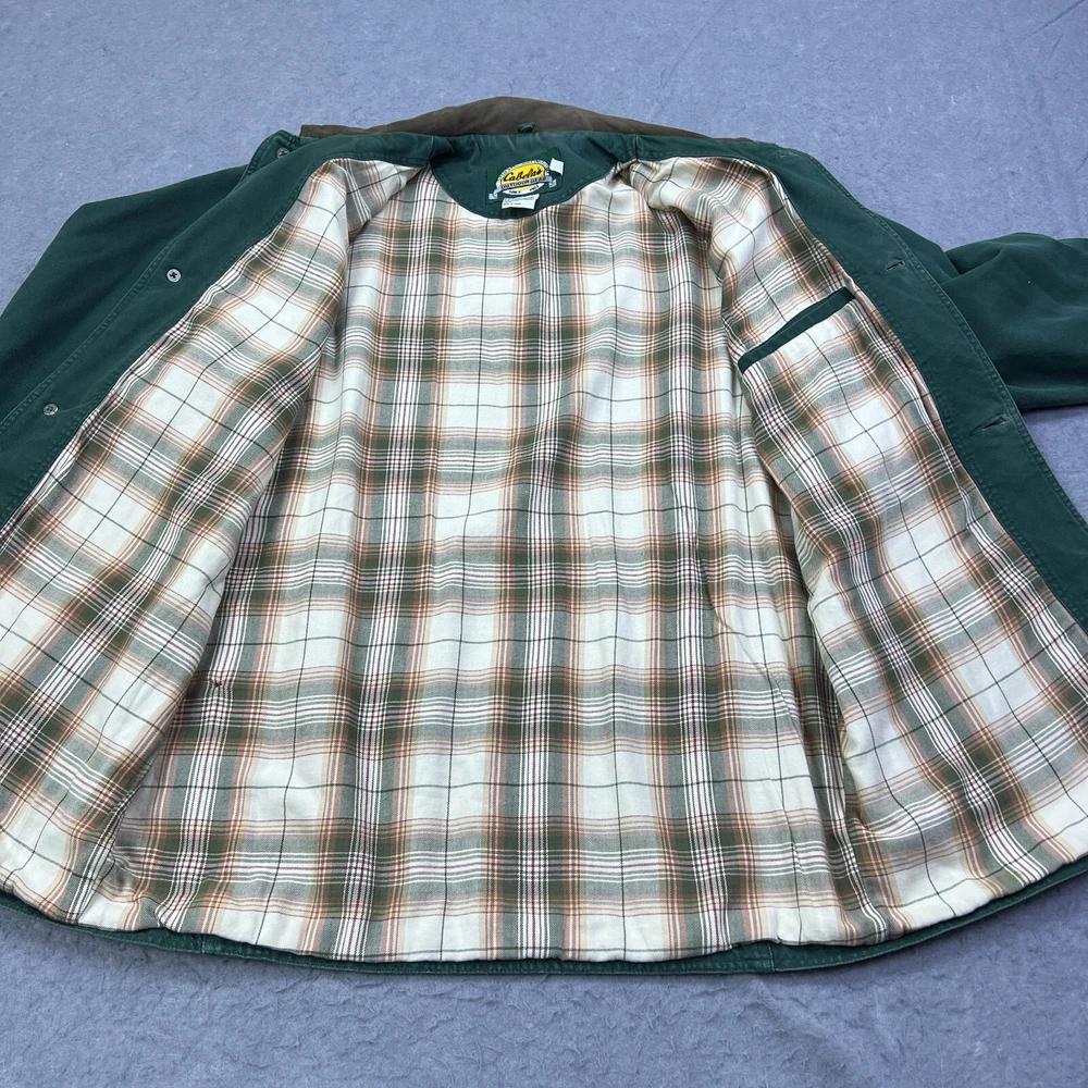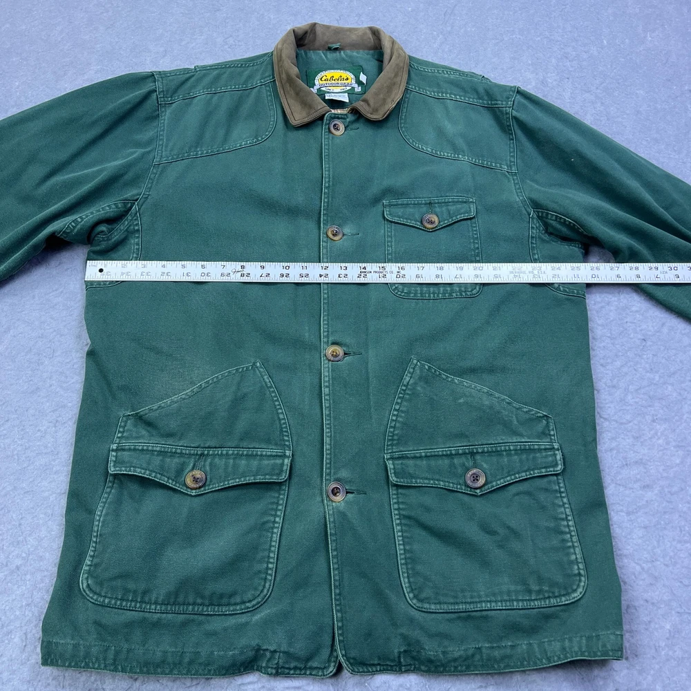This vintage Cabelas chore coat is a rugged, well-loved piece with great character! The flannel lining adds cozy warmth, and the duck canvas is sturdy yet comfortable. The worn-in look, including the small hole and missing button, gives it authentic charm. Runs large, so check measurements—but if you love durable, timeless workwear with a lived-in feel, this jacket is a fantastic find. Cool lighting in photos, so inspect details closely. Highly recommend for a rugged, retro style!