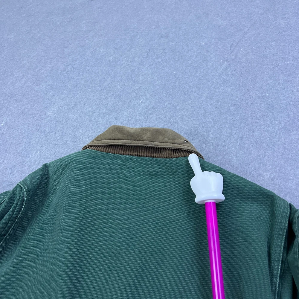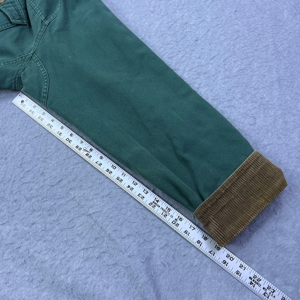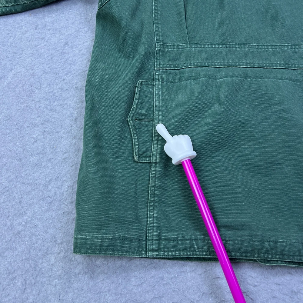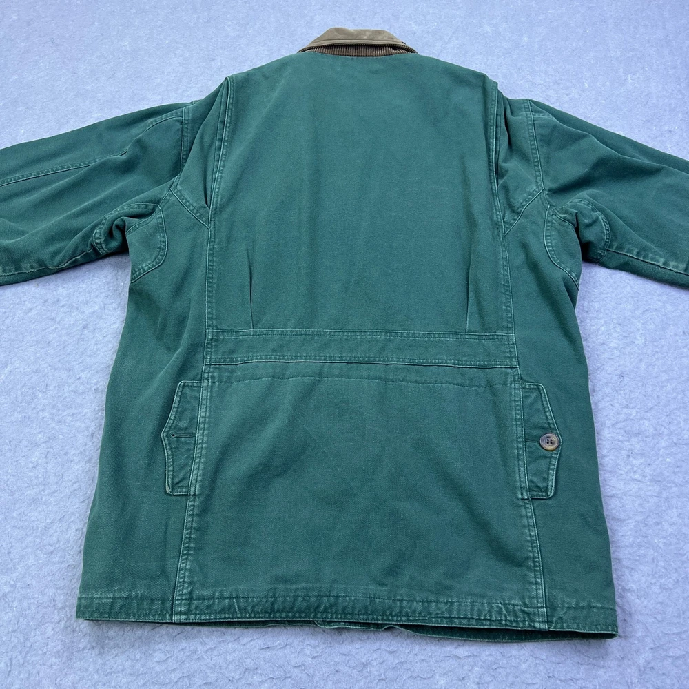 This vintage Cabelas chore coat is a rugged, well-loved piece with great character! The flannel lining adds cozy warmth, and the duck canvas is sturdy yet comfortable. The worn-in look, including the small hole and missing button, gives it authentic charm. Runs large, so check measurements—but if you love durable, timeless workwear with a lived-in feel, this jacket is a fantastic find. Cool lighting in photos, so inspect details closely. Highly recommend for a rugged, retro style!