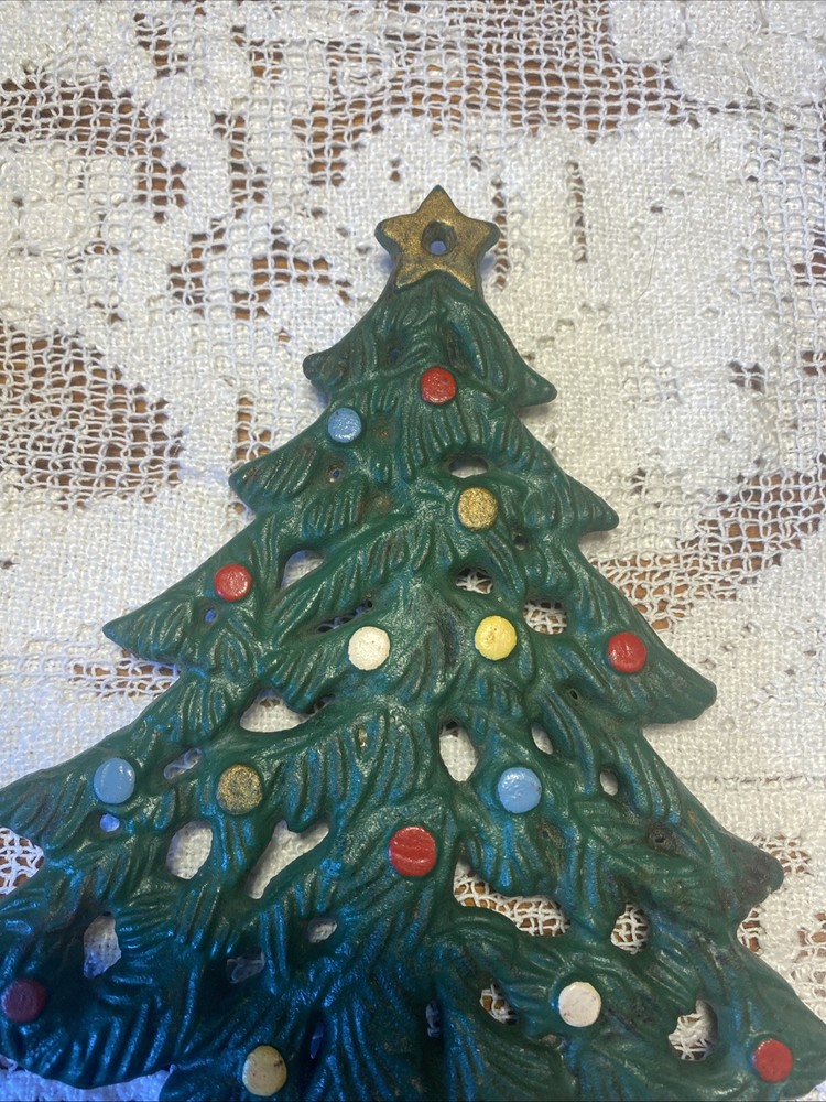 Vintage cast iron Christmas tree trivet. Red and gold tree stang green tree with colorful balls. Gold star. Needs a good cleaning.