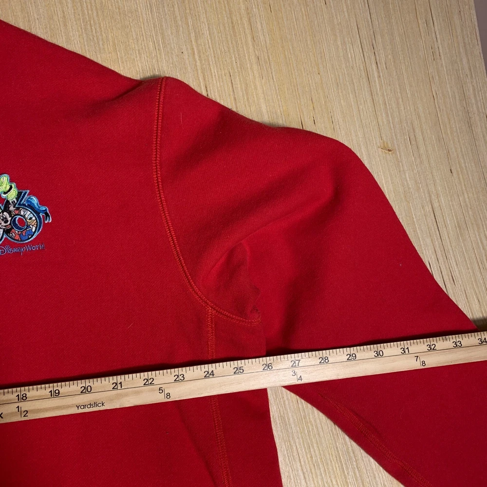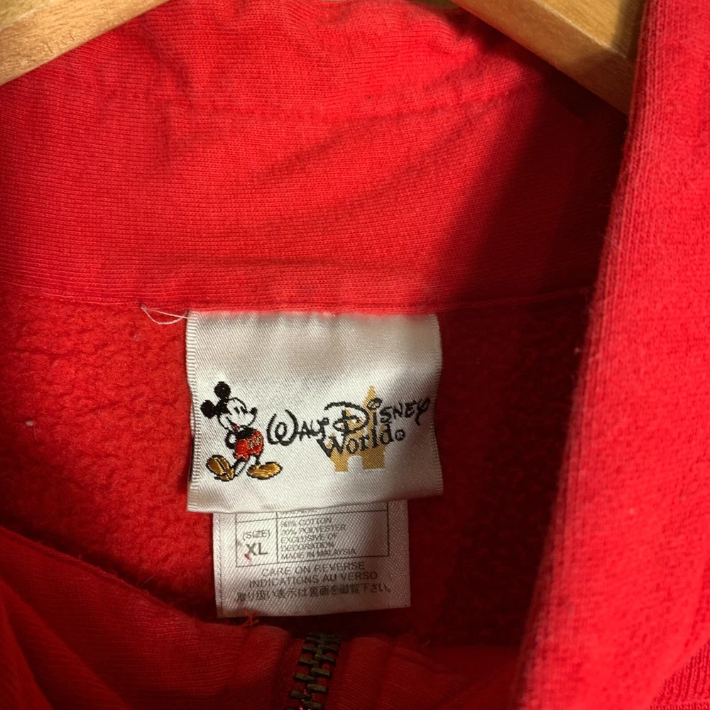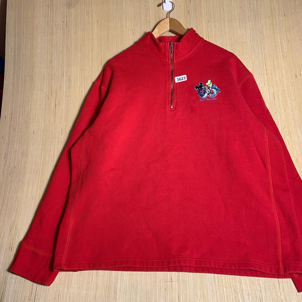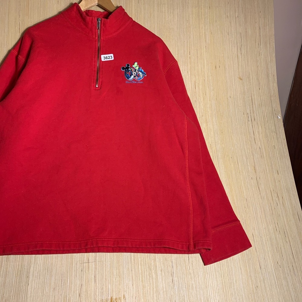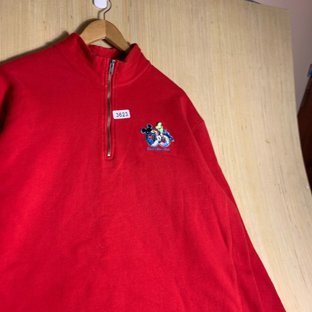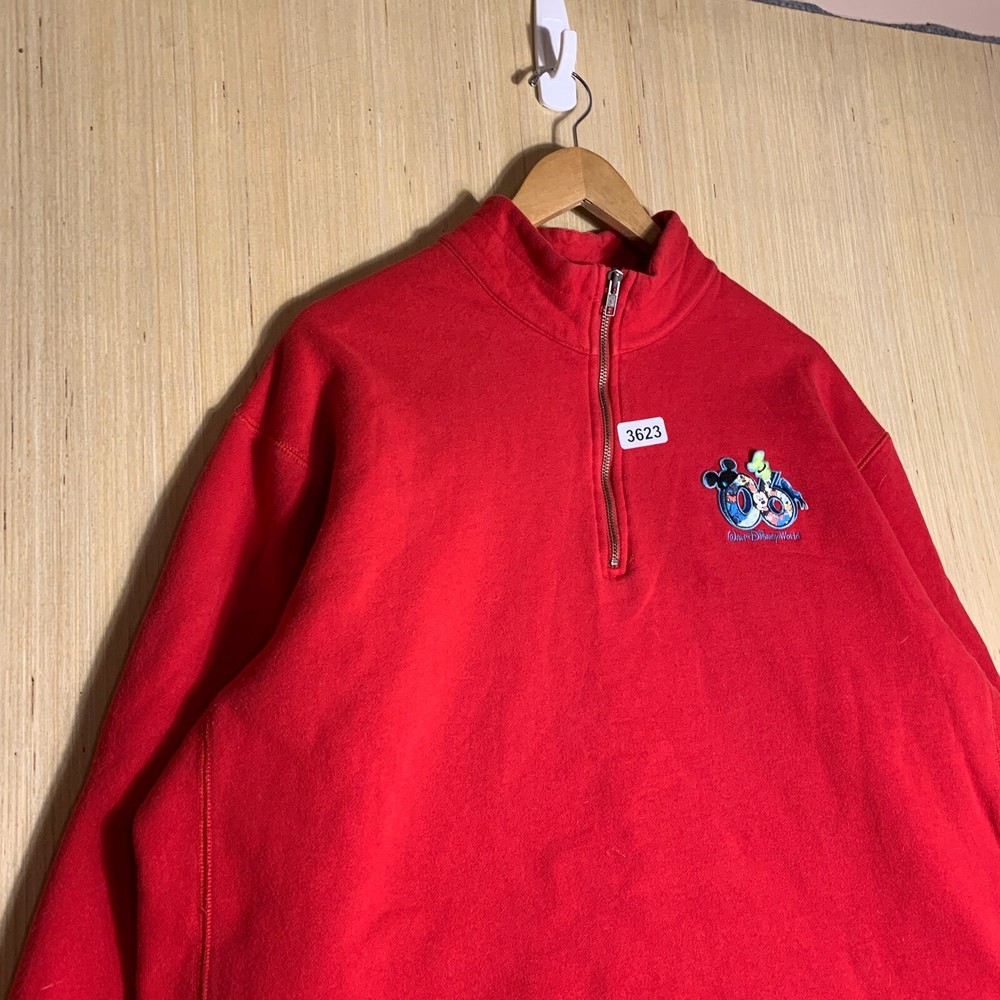 This vintage Walt Disney World sweater is a red, extra-large men's pullover featuring an embroidered Mickey Mouse logo. Made of cotton knit fabric, it has a tight-knit pattern with a crew neck and long sleeves. The sweater has a 1/4 zip and a classic, hipster style, suitable for various occasions including travel, parties, and workwear. Perfect for Disney enthusiasts, this sweater combines nostalgia with a touch of hipster flair, making it a unique and stylish addition to any wardrobe.