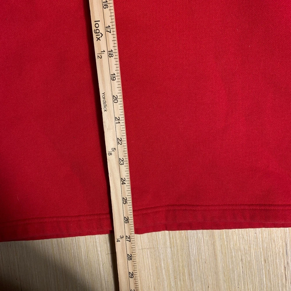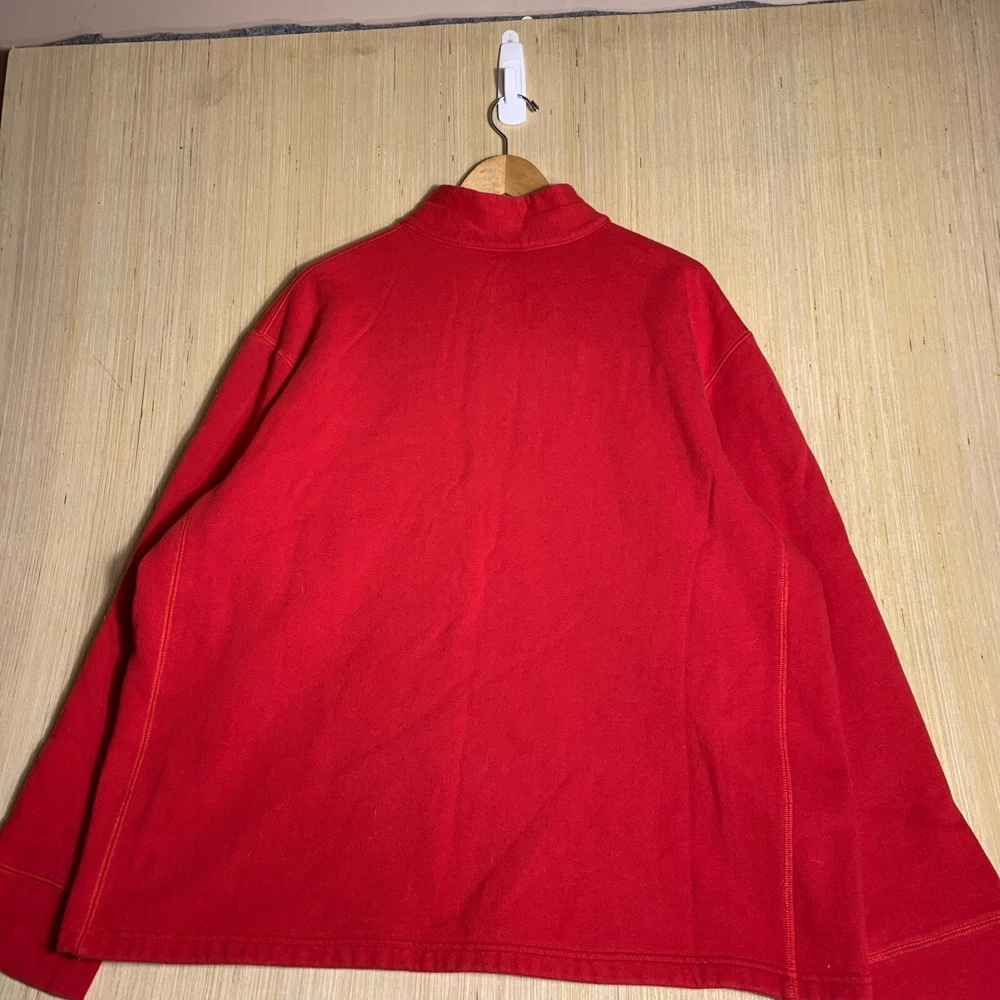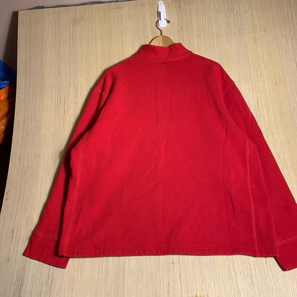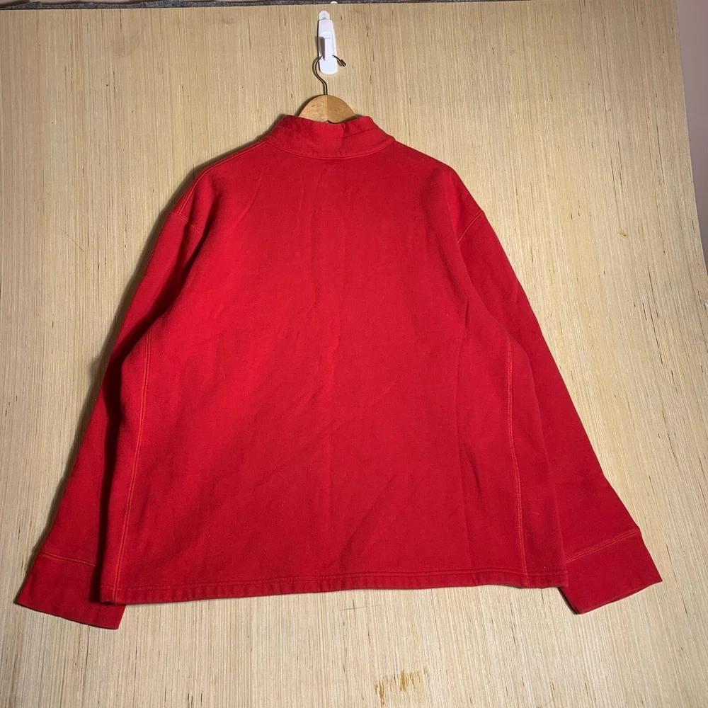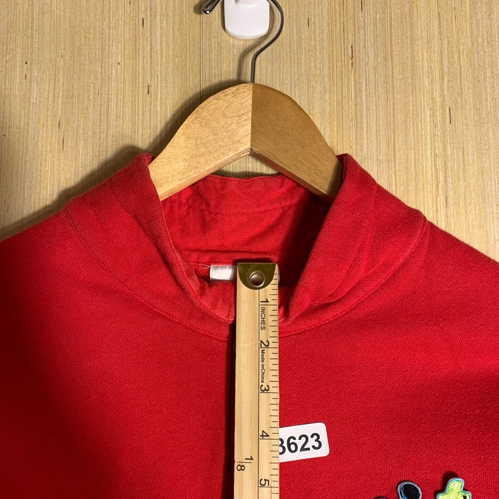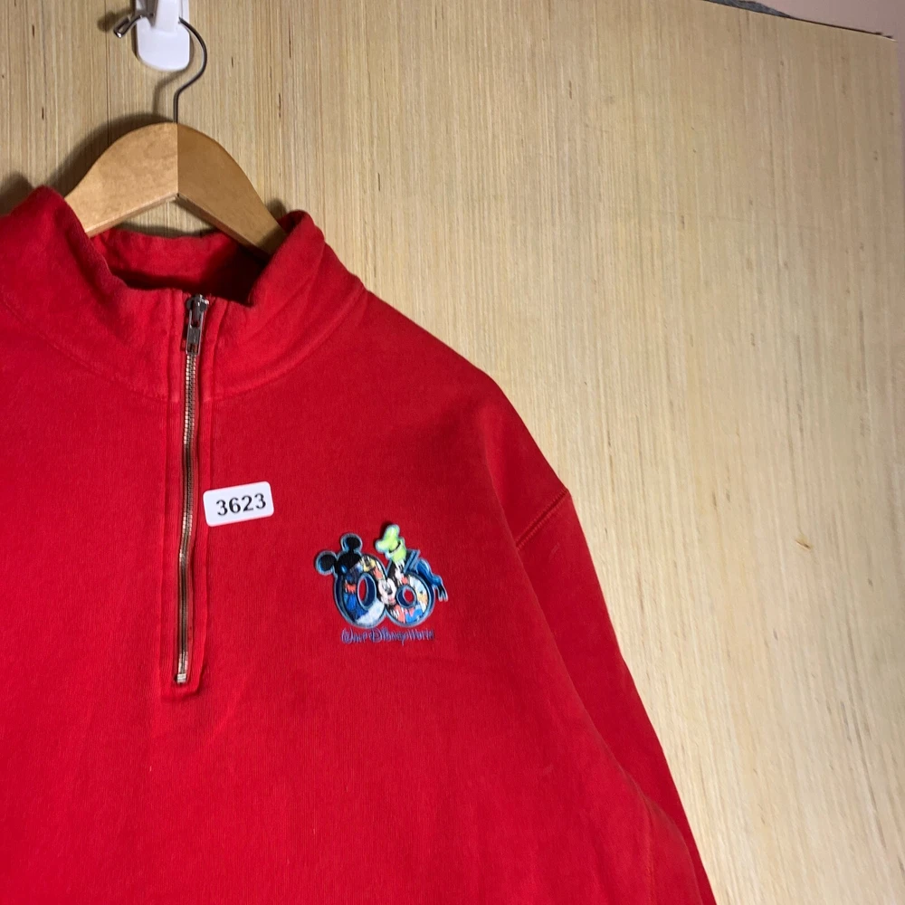 This vintage Walt Disney World sweater is a red, extra-large men's pullover featuring an embroidered Mickey Mouse logo. Made of cotton knit fabric, it has a tight-knit pattern with a crew neck and long sleeves. The sweater has a 1/4 zip and a classic, hipster style, suitable for various occasions including travel, parties, and workwear. Perfect for Disney enthusiasts, this sweater combines nostalgia with a touch of hipster flair, making it a unique and stylish addition to any wardrobe.