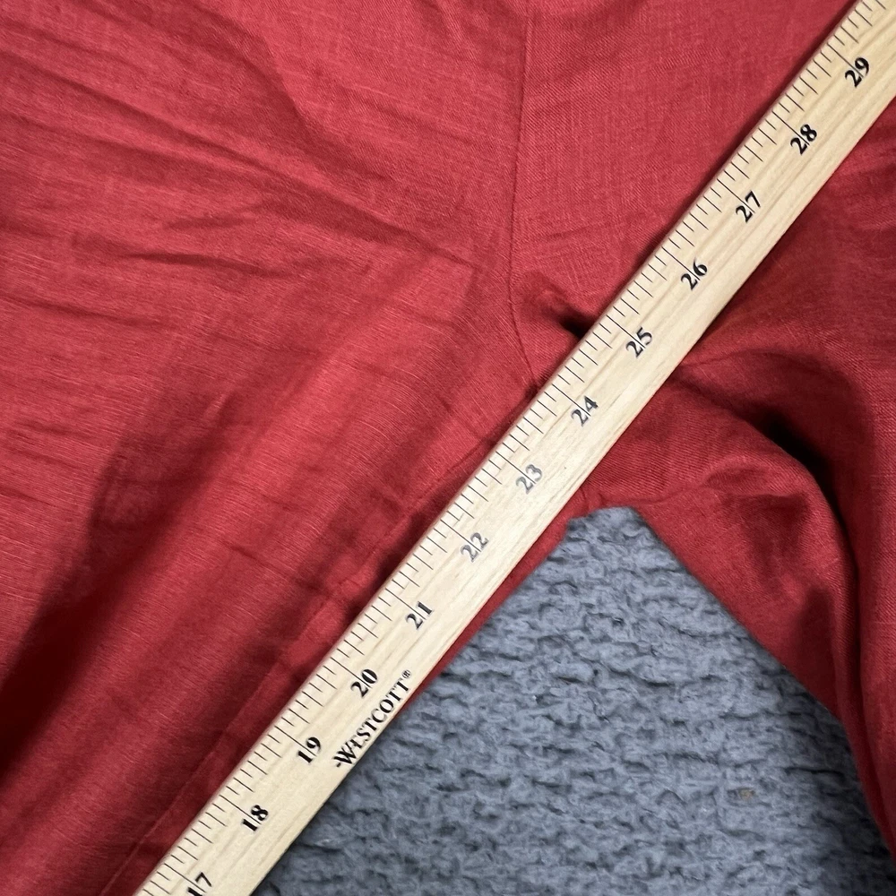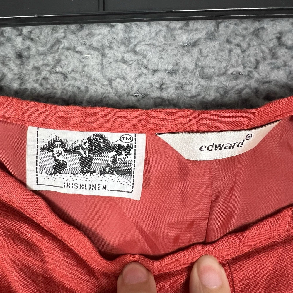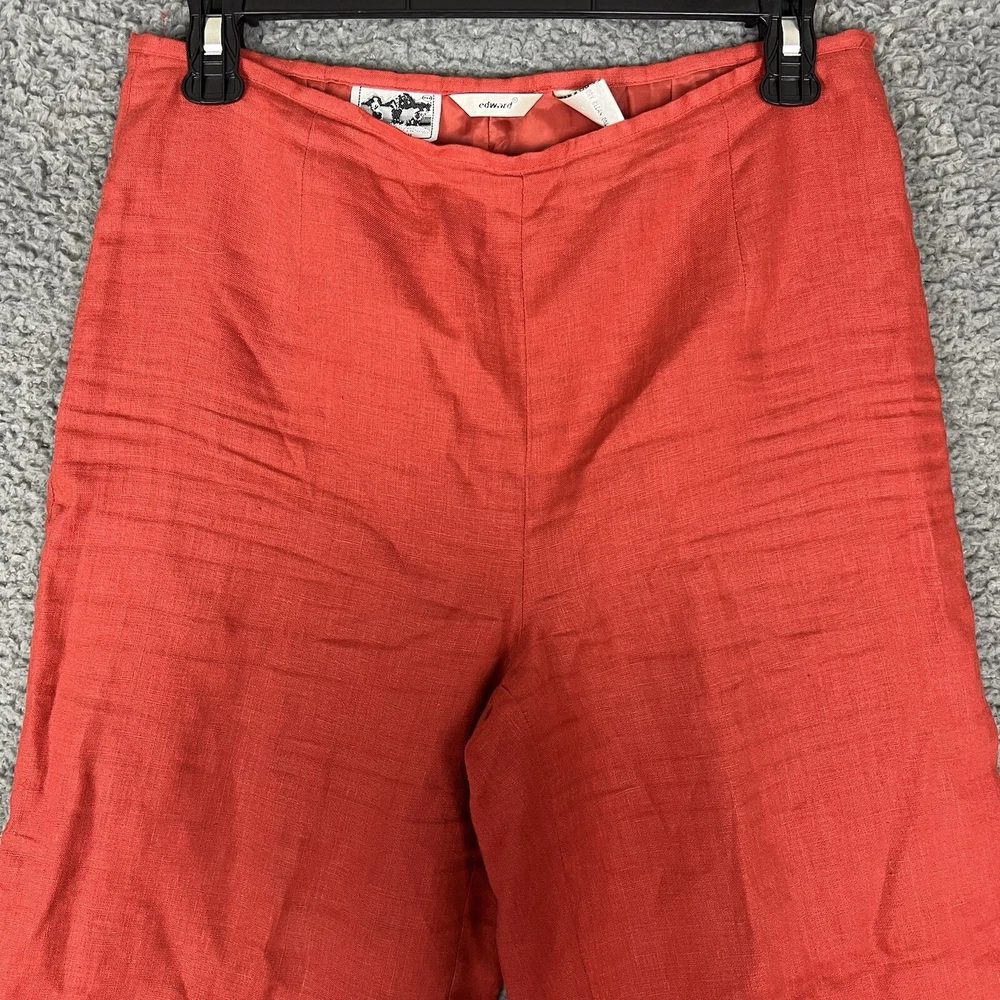 This vintage Edward linen capri/cropped pants in red/orange is a must-have for any fashion-forward woman. The pants are made of 100% linen, which makes them comfortable and breathable, perfect for casual occasions. The pants come in size 6 and have a 24-inch inseam, making them the ideal length for warmer weather. These original pants from the 1990s were manufactured in China and have a beautiful red color that will make you stand out in a crowd. The pants are perfect for pairing with a simple top and sandals or heels. Don't miss out on this unique piece of vintage clothing that will add a touch of style to your wardrobe.