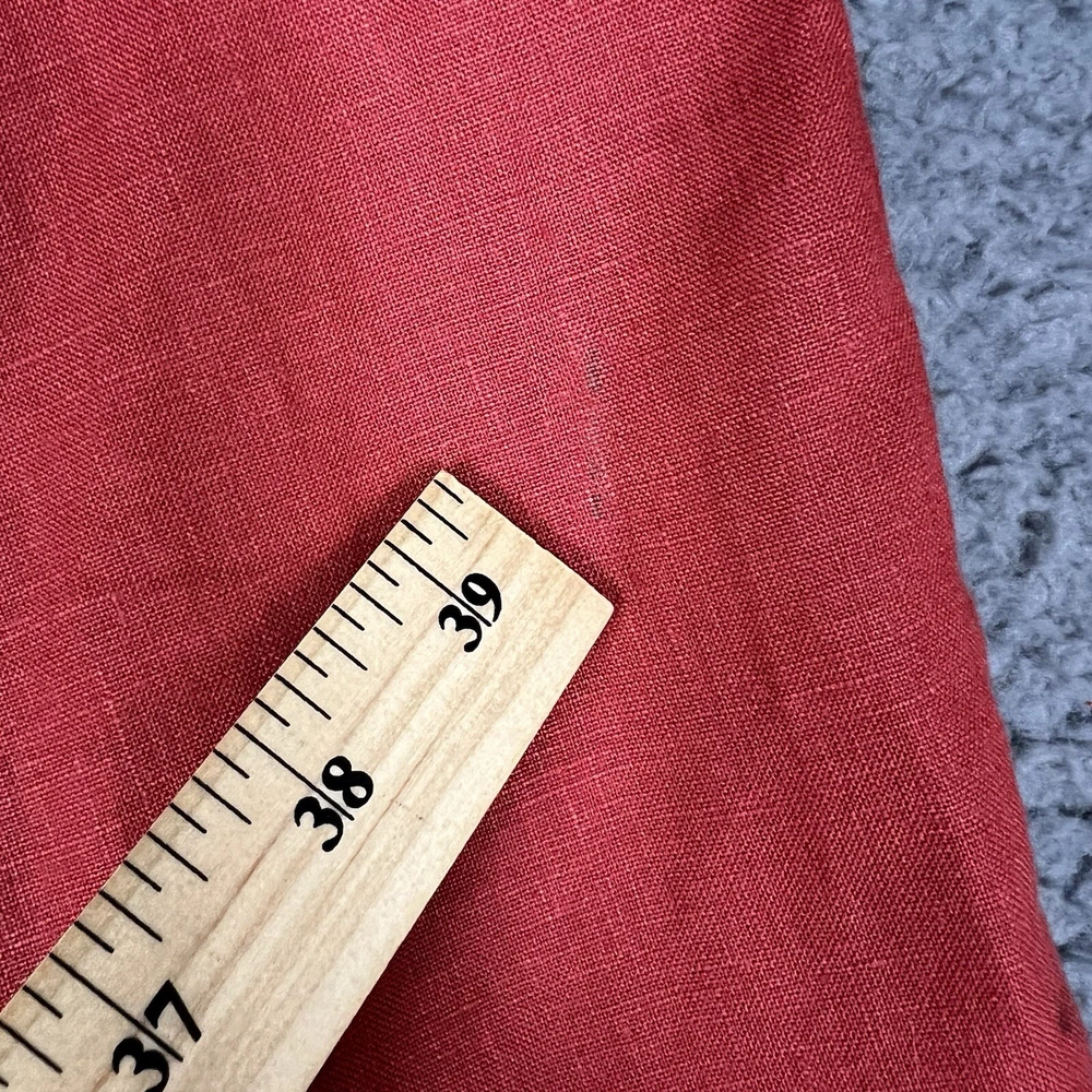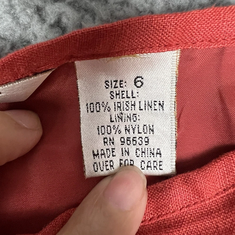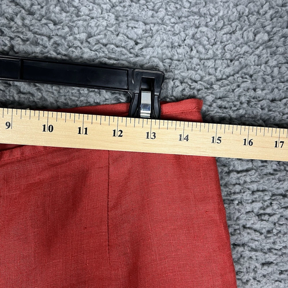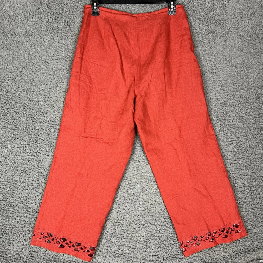 This vintage Edward linen capri/cropped pants in red/orange is a must-have for any fashion-forward woman. The pants are made of 100% linen, which makes them comfortable and breathable, perfect for casual occasions. The pants come in size 6 and have a 24-inch inseam, making them the ideal length for warmer weather. These original pants from the 1990s were manufactured in China and have a beautiful red color that will make you stand out in a crowd. The pants are perfect for pairing with a simple top and sandals or heels. Don't miss out on this unique piece of vintage clothing that will add a touch of style to your wardrobe.