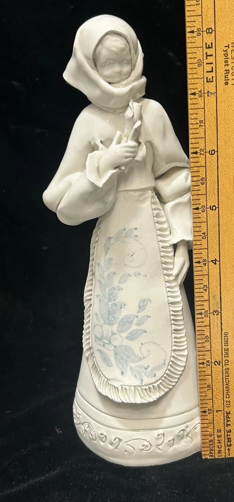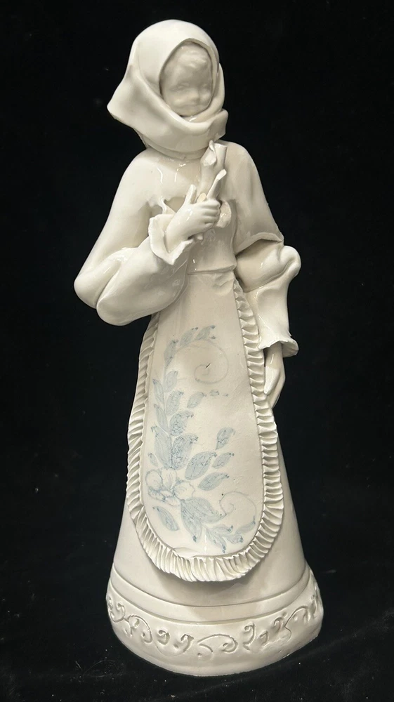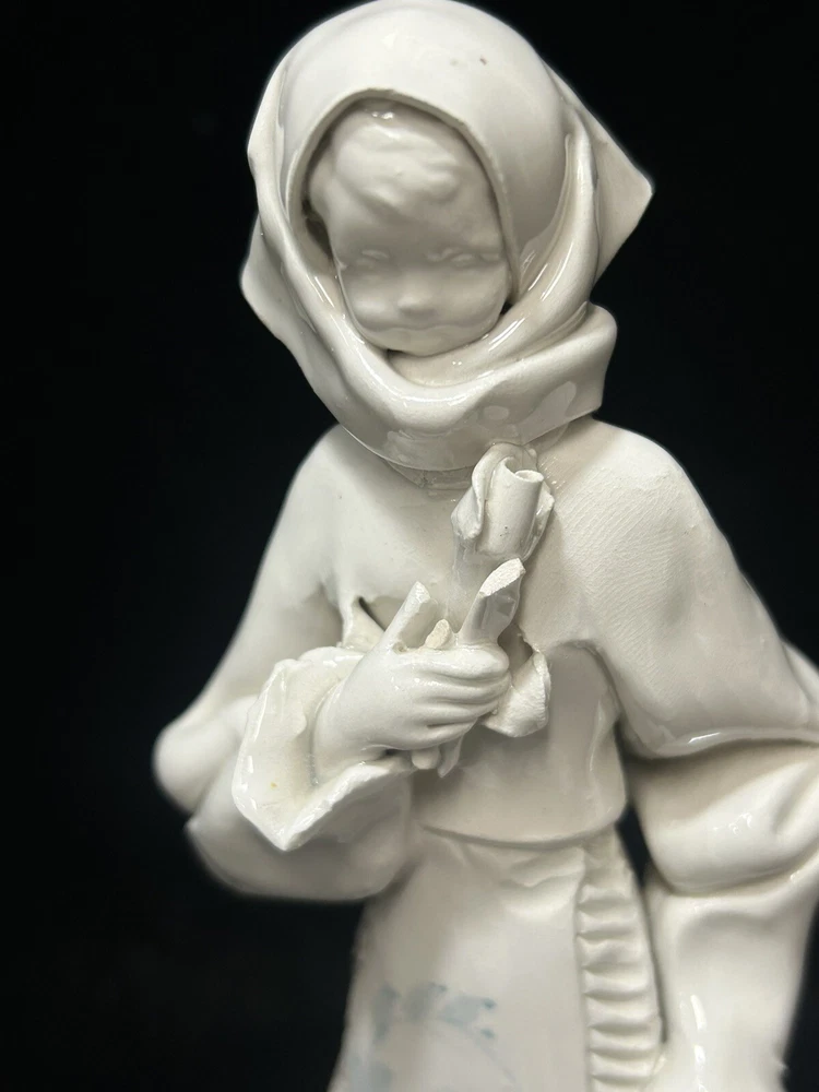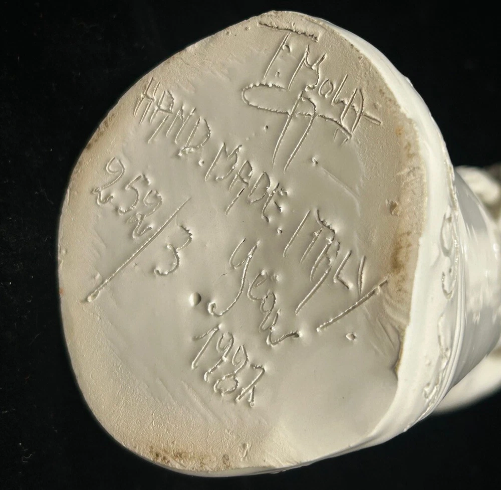 This beautiful sculpture by Fabio Mola depicts a Sardinian woman holding a flower, crafted from ceramic and porcelain in 1987. The intricate details showcase the rich Italian culture. Measuring 8 inches in height, this statue is a perfect addition to any art collection. The sculpture is signed by the artist and is a great representation of the people and cultures of Sardinia, Italy. This is a limited edition this is number 3 of 252 This appears to have a piece that has chipped off near the flower see photos