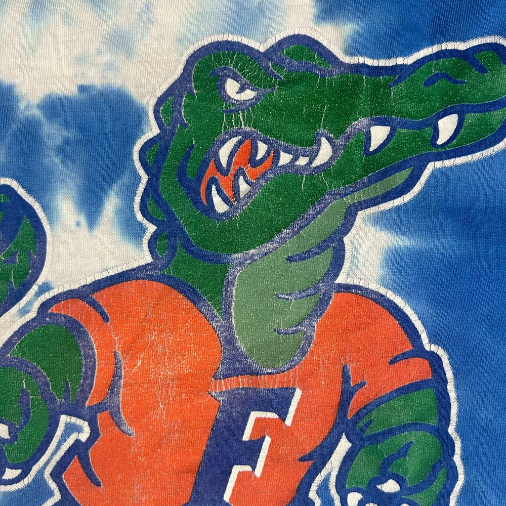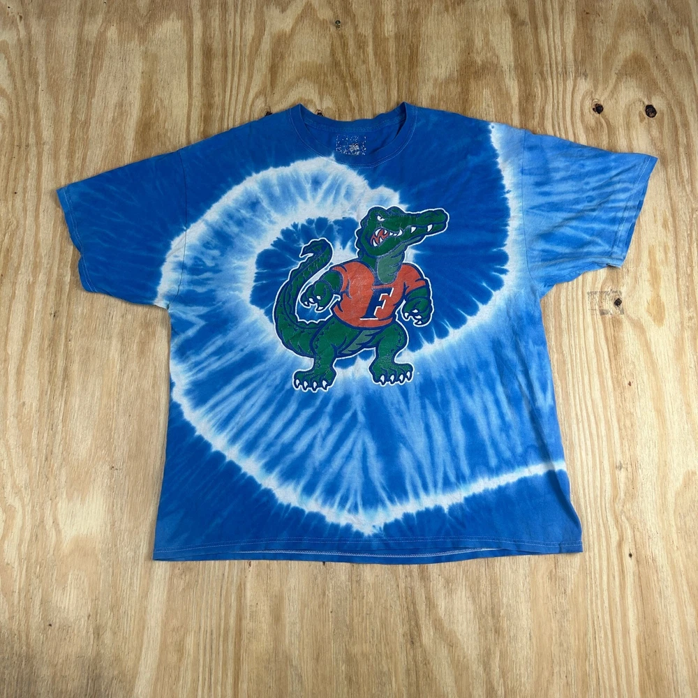 Show off your team spirit with this vintage Florida Gators mascot tie-dye tee shirt! Perfect for any fan of the NCAA NFL, this shirt features a bold graphic of the team's mascot and comes in a stylish blue color. Made from high-quality materials, this shirt is officially licensed and is perfect for regular season games. With a capacity of 8 oz, this shirt is a great addition to any fan's wardrobe. It's available in a men's size medium and is perfect for both casual and game day occasions. Get yours today and show everyone that you're a true Gators fan! SKU: FB-06-96