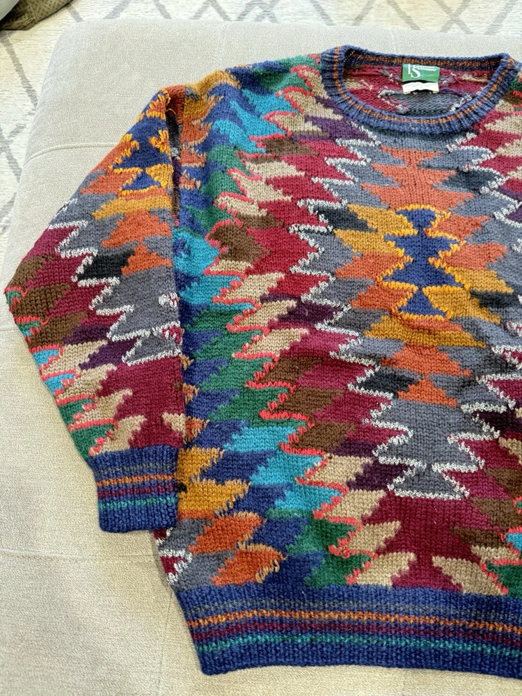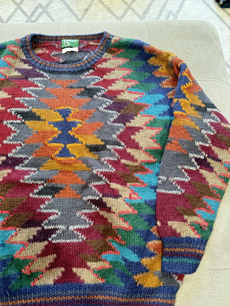 Type:SweaterSize:LargePersonalize:NoCharacter:Biggie, Cosby, Trending Knitwear, One of a Kind, Individual Man of StyleColor:MulticolorNeckline:Crew NeckDepartment:MenMaterial:100% WoolVintage:YesSleeve Length:Long SleeveTheme:Colors of the Southwest, Tribal Inspired, Vintage 90sOccasion:CasualSeason:Fall, Spring, WinterBrand:Hammacher SchlemmerFeatures:Hand Knit Sweater, Fabulous Tribal Inspired Design, Great 90s LookGarment Care:HandwashPattern:GeometricStyle:PulloverPerformance/Activity:Any Casual ActivitiesKnit Style:Chunky-KnitFabric Type:KnitSize Type:RegularCountry/Region of Manufacture:ChinaAccents:Ribbed Striped Detail Wrists and SleevesFit:Relaxed
