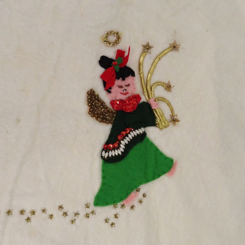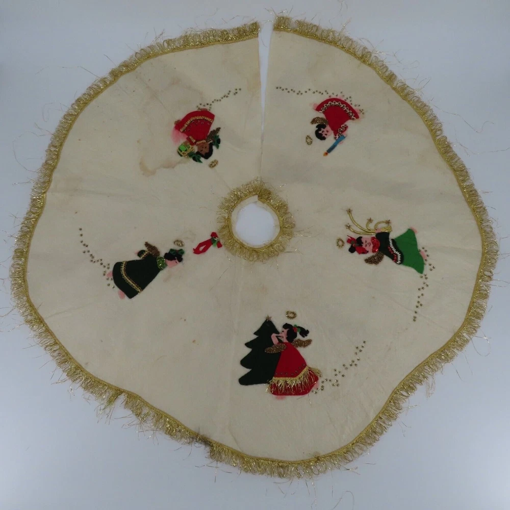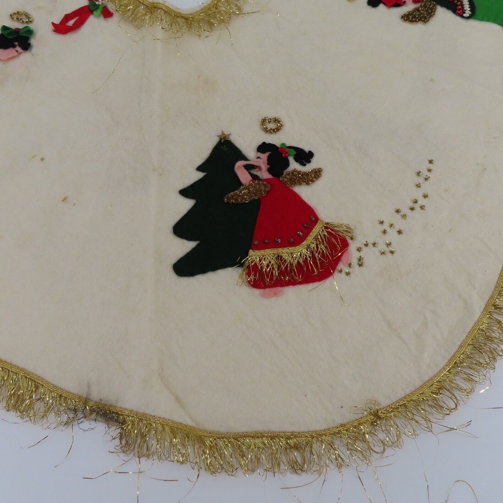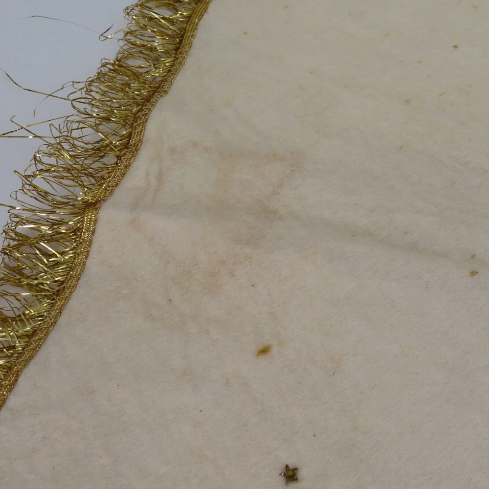 Vintage handmade felt tree skirt Diameter: 37" **measurements are approximate, taken with item laying flat Condition: used, surface wear/stains throughout- see photos, smoke free home Please review all photos closely as these will be the best description of the item. Thank you for shopping!