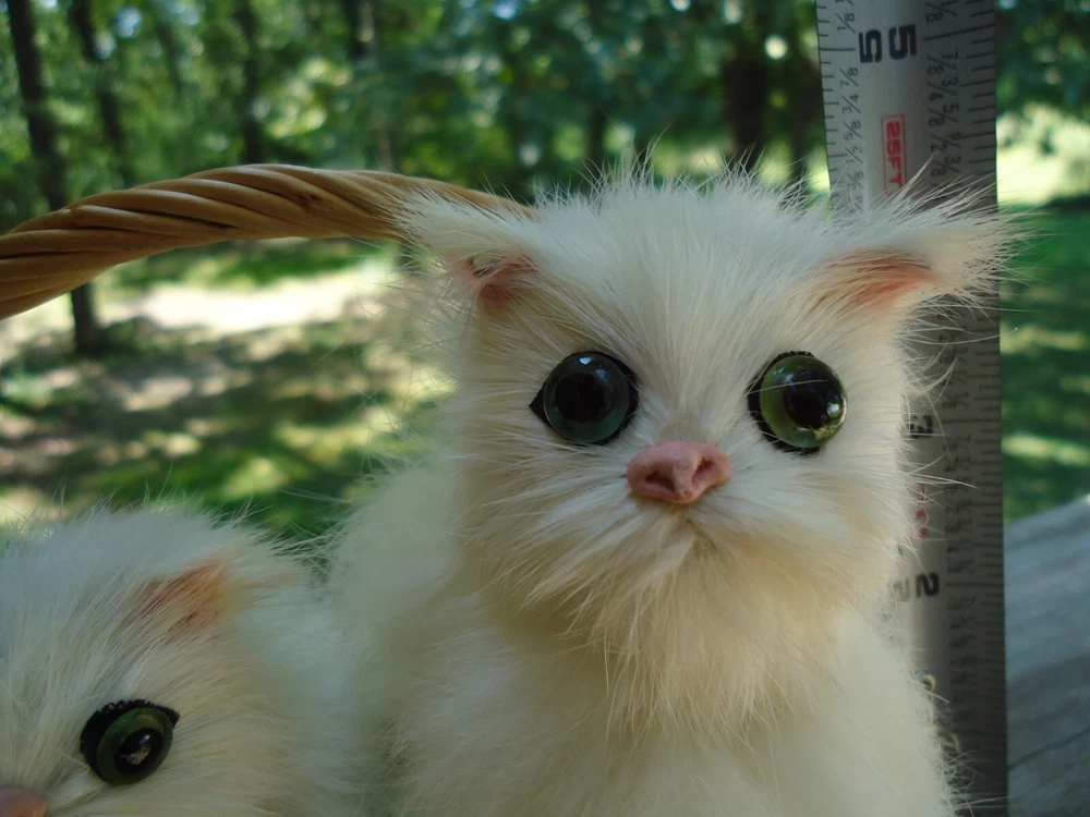 VTG Kittens Cats Wicker Basket Realistic Soft White Fur Glass Eyes Lifelike Mini
