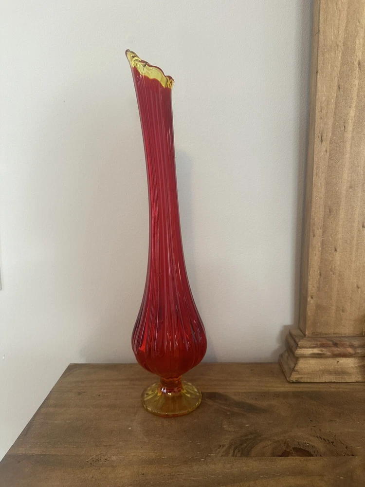 Elevate your home decor with the striking VTG MCM LE Smith 15.5” Amberina Swung Stretch Ribbed Glass Vase. A true representation of Mid-Century Modern style, this vase boasts an eye-catching amberina color that ranges from warm red to vibrant orange, capturing the essence of a bygone era. Crafted from hand-blown glass, its textured, high-gloss surface and ribbed pattern add a touch of abstract art to any room. This decorative piece, originating from the United States in 1953, is a testament to the skillful production techniques of the time. It stands as an original, unmodified treasure from the 1960-1969 period, complete with the artistic nuances that enthusiasts of MCM appreciate. Whether displayed alone or as part of a curated collection, this vase is sure to be a conversation starter. No chips or cracks. Has a black mark inside the glass as shown