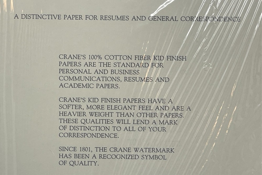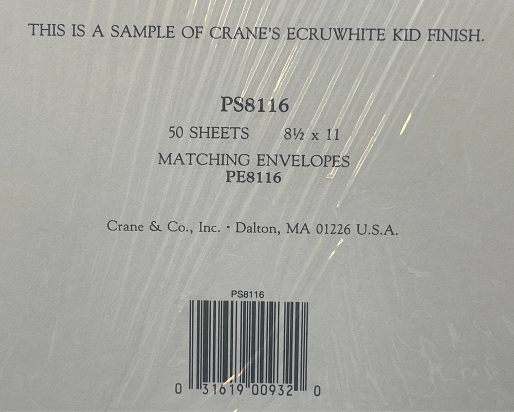 Vintage Crane & Co. Kid Finish 100% Cotton Fiber Paper (NO Envelopes, the back of the box simply states the matching envelope product number for reference) (A distinctive Paper for Resumes and General Correspondance) New Old Stock- Factory Sealed / Packaging (*NOTE that Plastic Shrink wrap is torn) Label Reads: PS8116 Size: 8-1/2 x 11 Kid Finish 100% Cotton Fiber Paper (50 Sheets) Box shows signs of handling and age wear, with a black spot on side of box & black scuff mark on back. The plastic wrap on the outside of the box is torn in several places (Please Zoom in on Photos), but Merchandise inside remains untouched. Item has been in a climate controlled storage room for 25 years, after the original owners closed their stationary store. I try my best to take good quality pictures so you can determine that the overall condition meets your requirements and expectations. Therefore, please zoom-in to review the condition of the product. I check each item before listing, and state in the description any flaws that I see. However, it is possible to make a mistake. If there is a problem with your purchase, please contact me, and I will try to resolve any issues you have. I strive for 100% customer satisfaction. Positive Reviews are very much appreciated! Return Policy: I accept returns within 15 days of purchase. Items must be returned in the same condition. Return shipping is the buyers responsibility. You will receive a refund for the actual cost of the item and the original postage fee only.