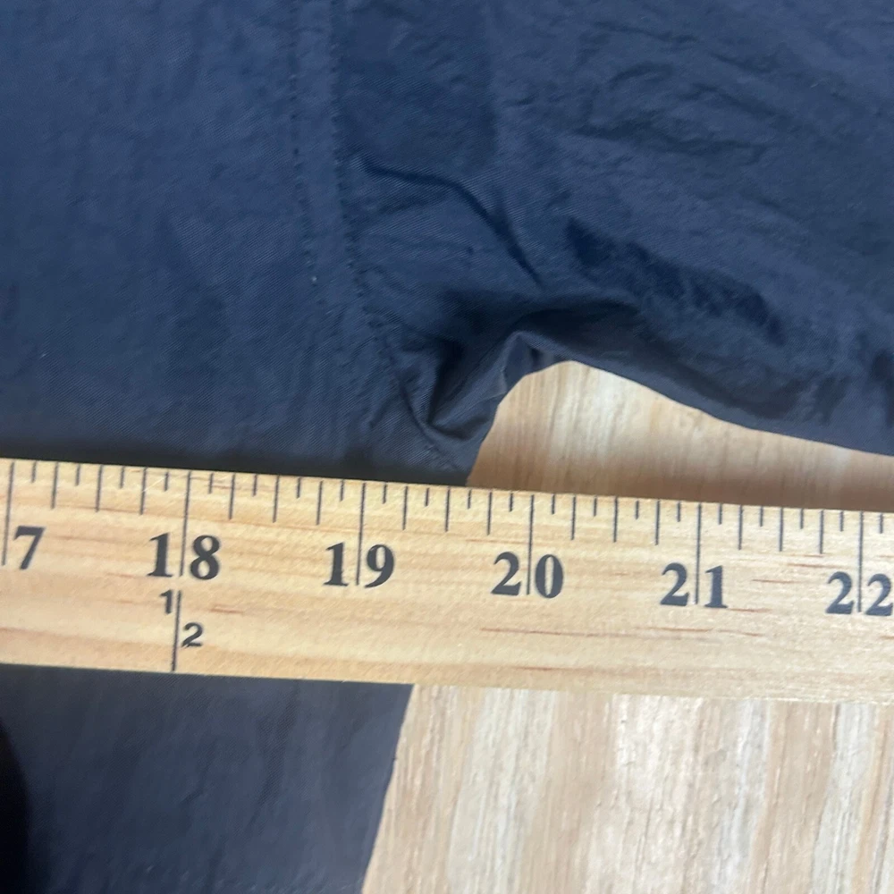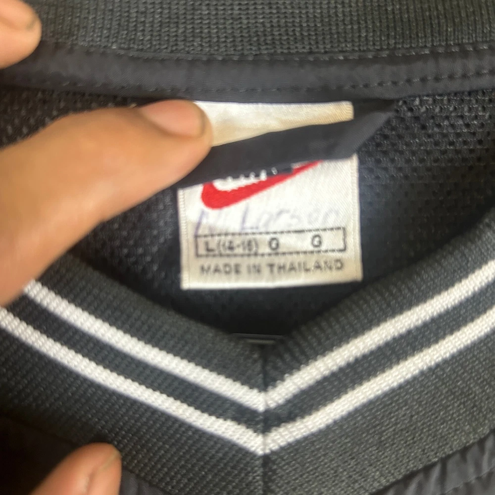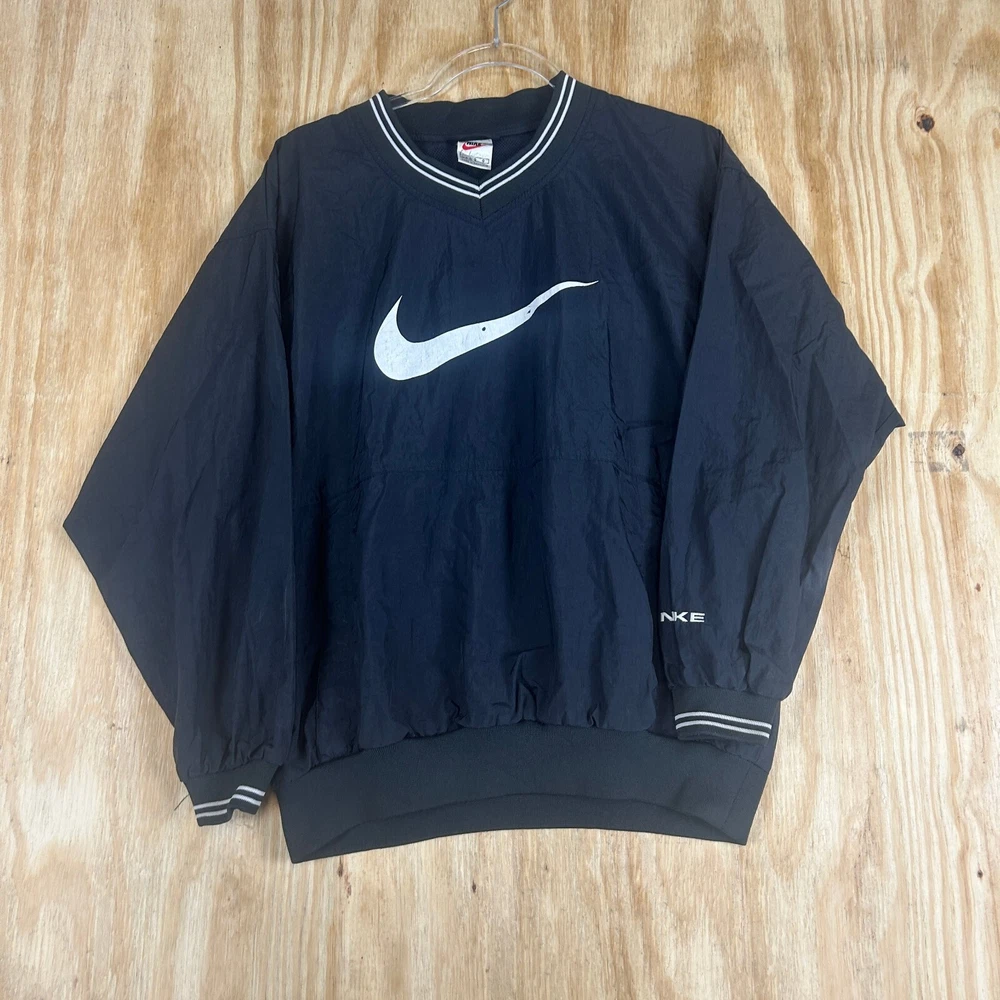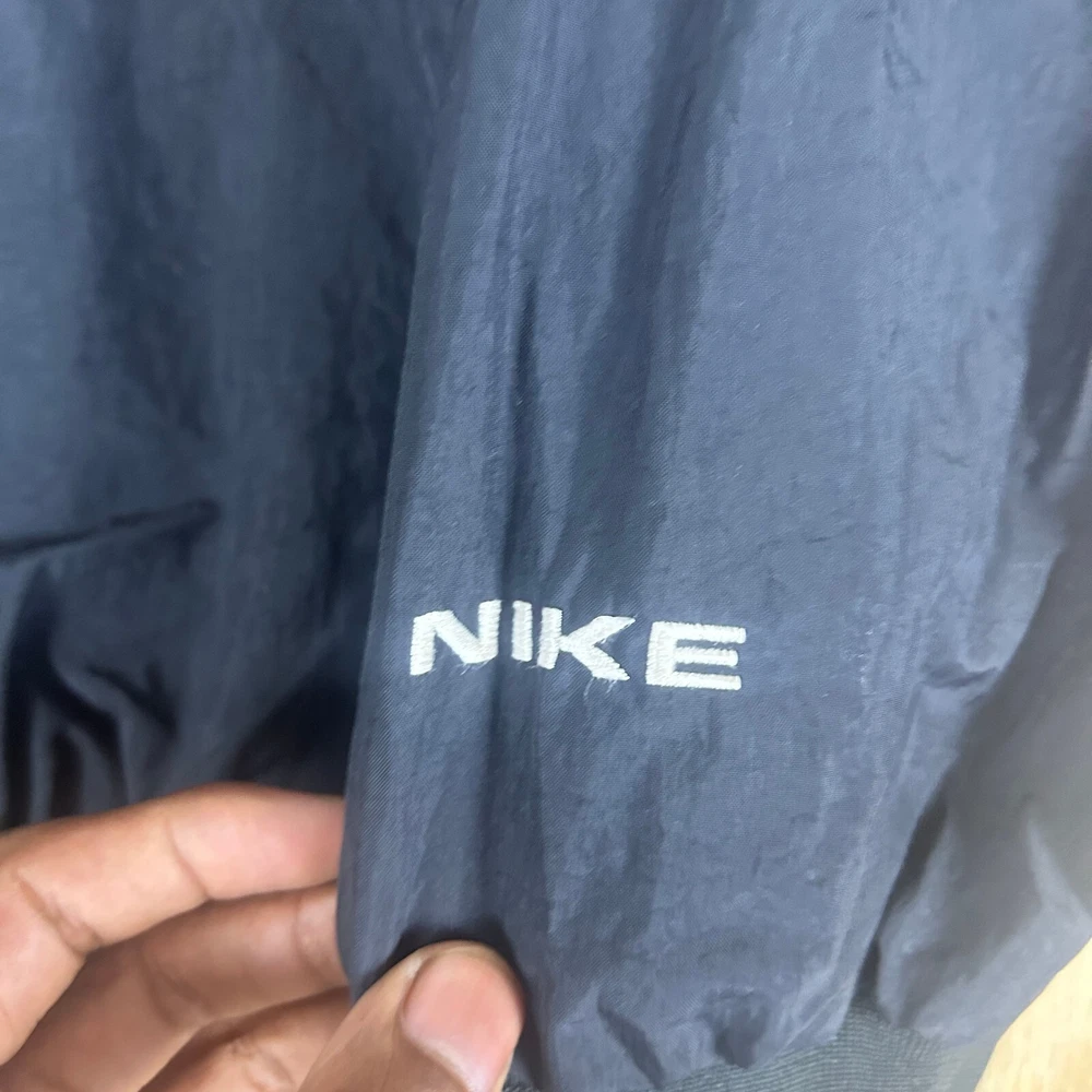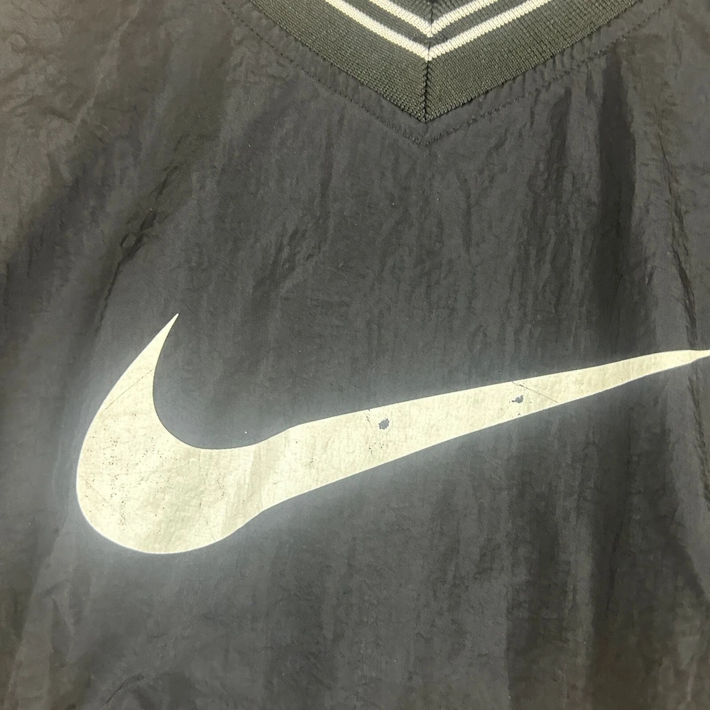 This vintage Nike windbreaker jacket is a stylish addition to any casual outfit. The black jacket features a big center check pattern, embroidered accents, and a relaxed fit. The jacket is made of softshell fabric with a polyester lining and insulation material. It has a full zip closure with a zipper and a band collar style. The jacket is lightweight and suitable for all seasons, making it perfect for summer and spring. It is machine washable and easy to maintain. The jacket is available in XL size and is a unit type jacket. The Nike brand logo is prominently displayed on the jacket, making it a great choice for gym and training activities. MC-17-88