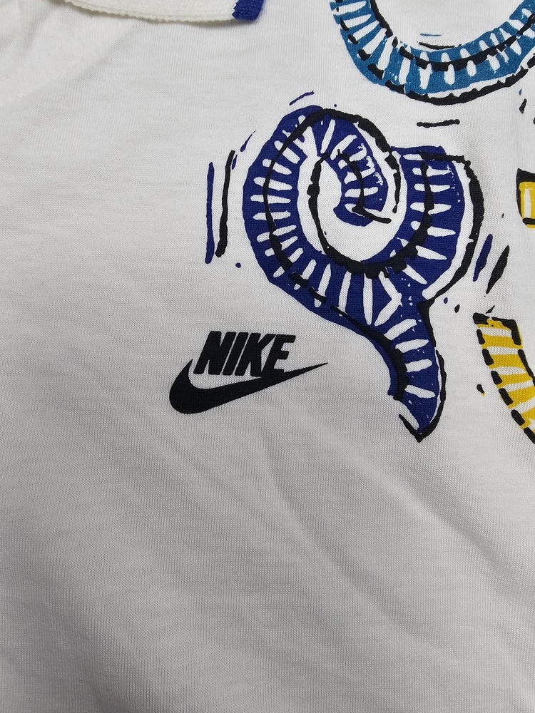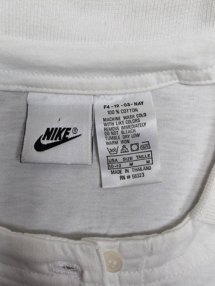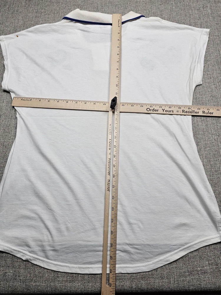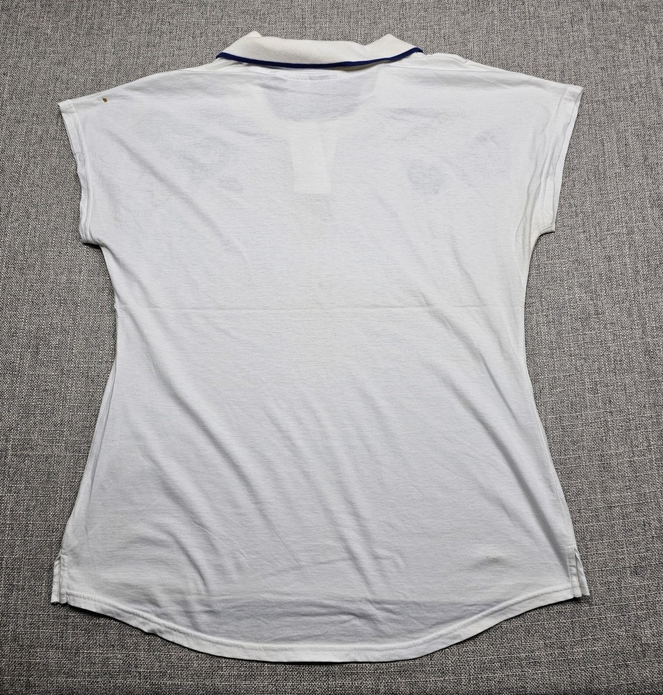 VTG Nike Polo Shirt Womens Medium White Tennis Abstract Graphic Swoosh Golf Light wear with faint back spots and small mark near left shoulder. Minor underarm discoloration. Buttons secure; graphic intact. Brand: Nike Item: Womens polo shirt with cap-sleeve silhouette and 2-button placket Color: White with Navy piping on collar; abstract Blue/Yellow chest graphic; black Nike Swoosh wordmark Tag size: USA M (Womens Medium) Material: 100% Cotton Country of origin: Made in Thailand Tag details: RN 56323 | Tag code: F4-12-03-NAV Features: Rib collar with contrast piping; curved hem; soft cotton knit; screen-printed graphics Notes: See all photos for design details and condition close-ups. 📦 Your order ships Same Day or Next Business Day , thoughtfully packed with care. ✅ We stand by every item with Free Returns for your peace of mind. 💲 Save more with our F lat $7.95 Combined Shipping on multiple orders. ⭐ Follow Grace & Mercy Co. for new & vintage finds, timeless goods, and exclusive coupons. 🙏 Thank you for choosing to shop with us — we’re grateful for your business!