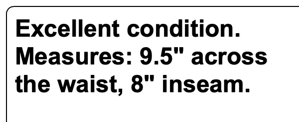 Excellent condition. Measures: 9.5" across the waist, 8" inseam. We are so thankful for our customers! We have thousands of listings, and therefore receive hundreds of messages, every single day. So, if you are asking about a price drop, or a shipping price drop, or asking for extra measurements, or to add additional photos, please allow me to answer you here, No thanks. If your question is not one of those questions, we will be happy to answer you individually. YES...WE DO COMBINE DOMESTIC SHIPPING. Extra jewelry items ship for $2 each (except for large jewelry lots). We will refund the difference as we are mailing out.....we hope you enjoy shopping with us!