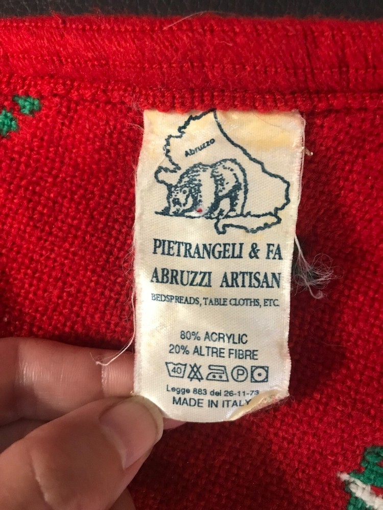 Age Level:Over 18 YearsOccasion:ChristmasColor:Red Green WhiteCountry/Region of Manufacture:ItalyShape:CircleFeatures:Vintage, ReversibleSize:LargeMaterial:Acrylic BlendNumber of Items:1Franchise:N/ASet Includes:OneType:Tree SkirtSubject:TraditionalRecipient:N/ACharacter:ChristmasPattern:WovenSeller Notes:“Nice”Time Period Manufactured:1970-1979Theme:RetroBrand:Pietrangeli &Fa Abruzzi Artisan