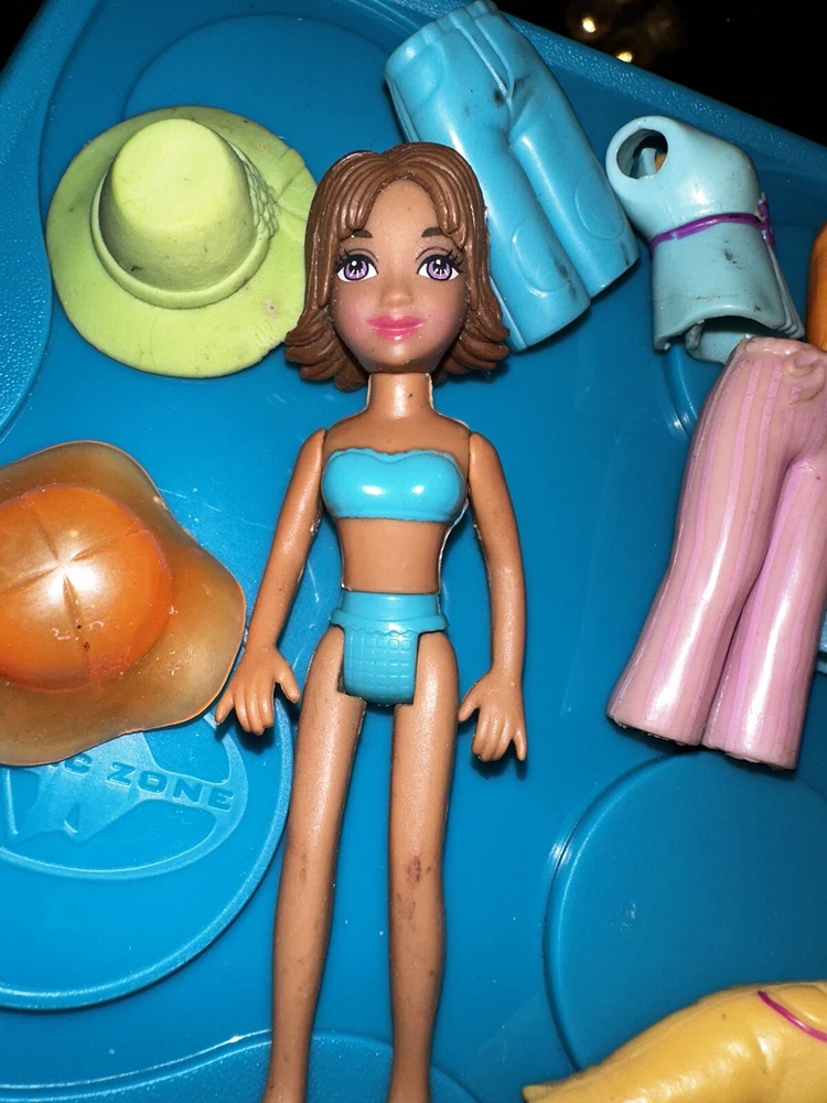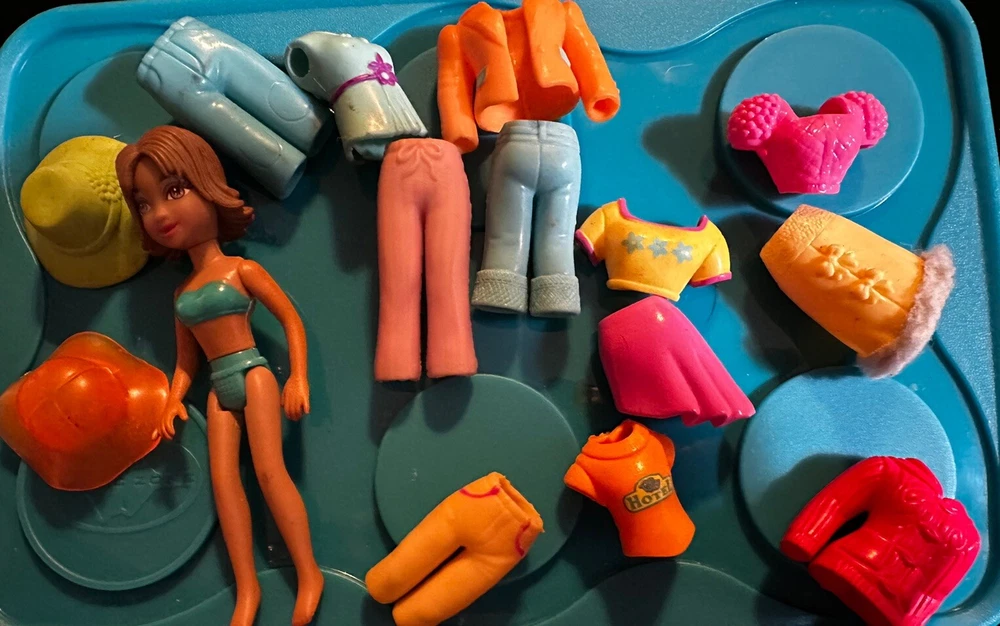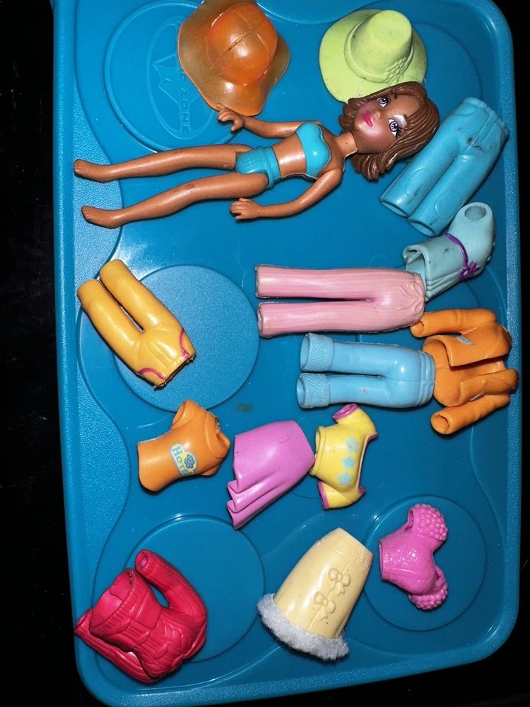 This is a lot of vintage Polly Pocket and Friends dolls, including one doll and stretch rubber clothes. The dolls are made by Mattel and are 3.5 inches in size. The set includes 4 dolls , outfits. The franchise is Polly Pocket. 24-0420