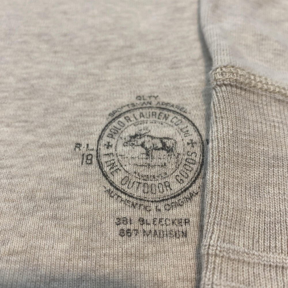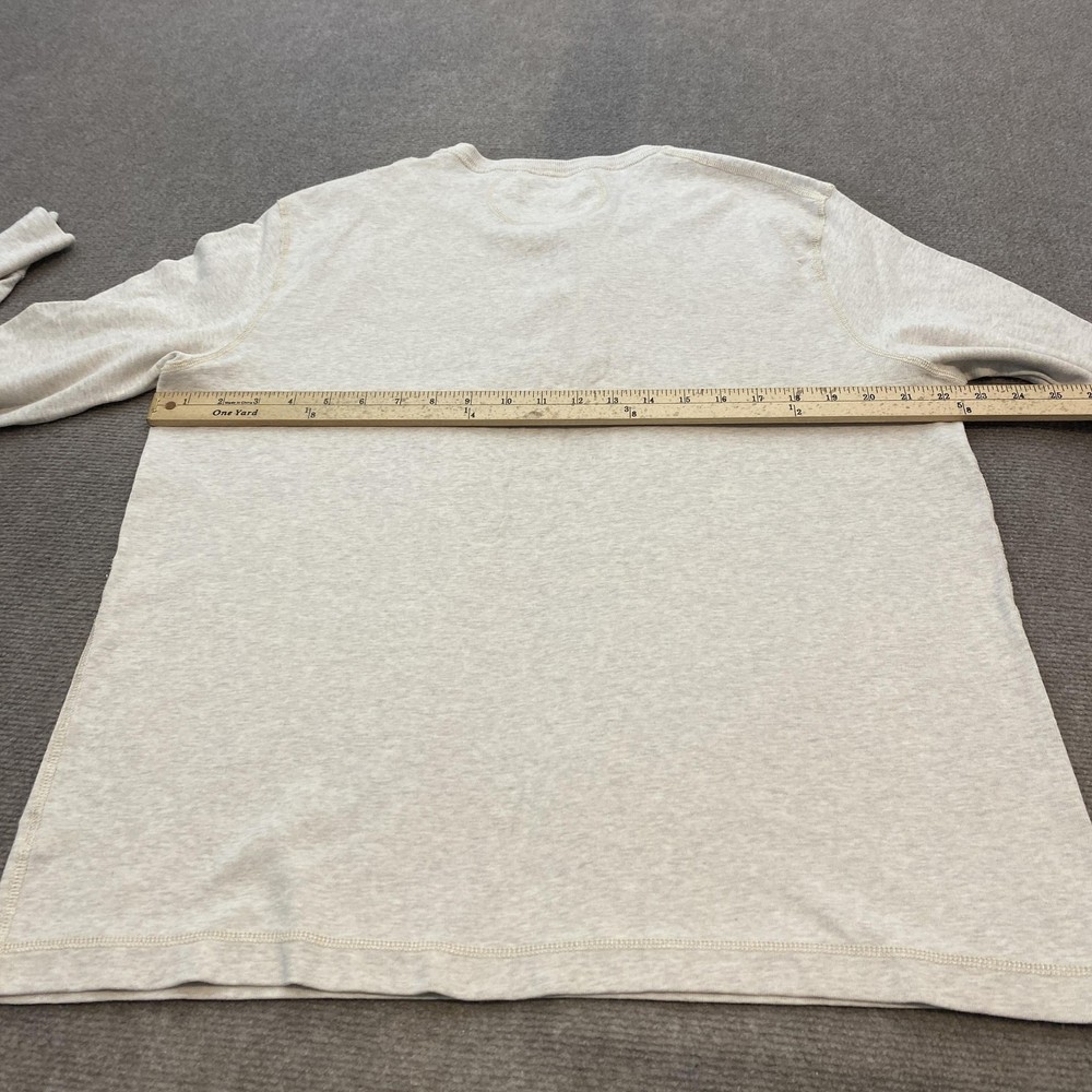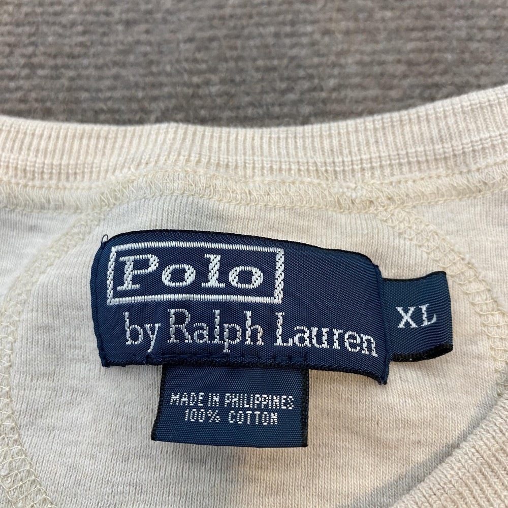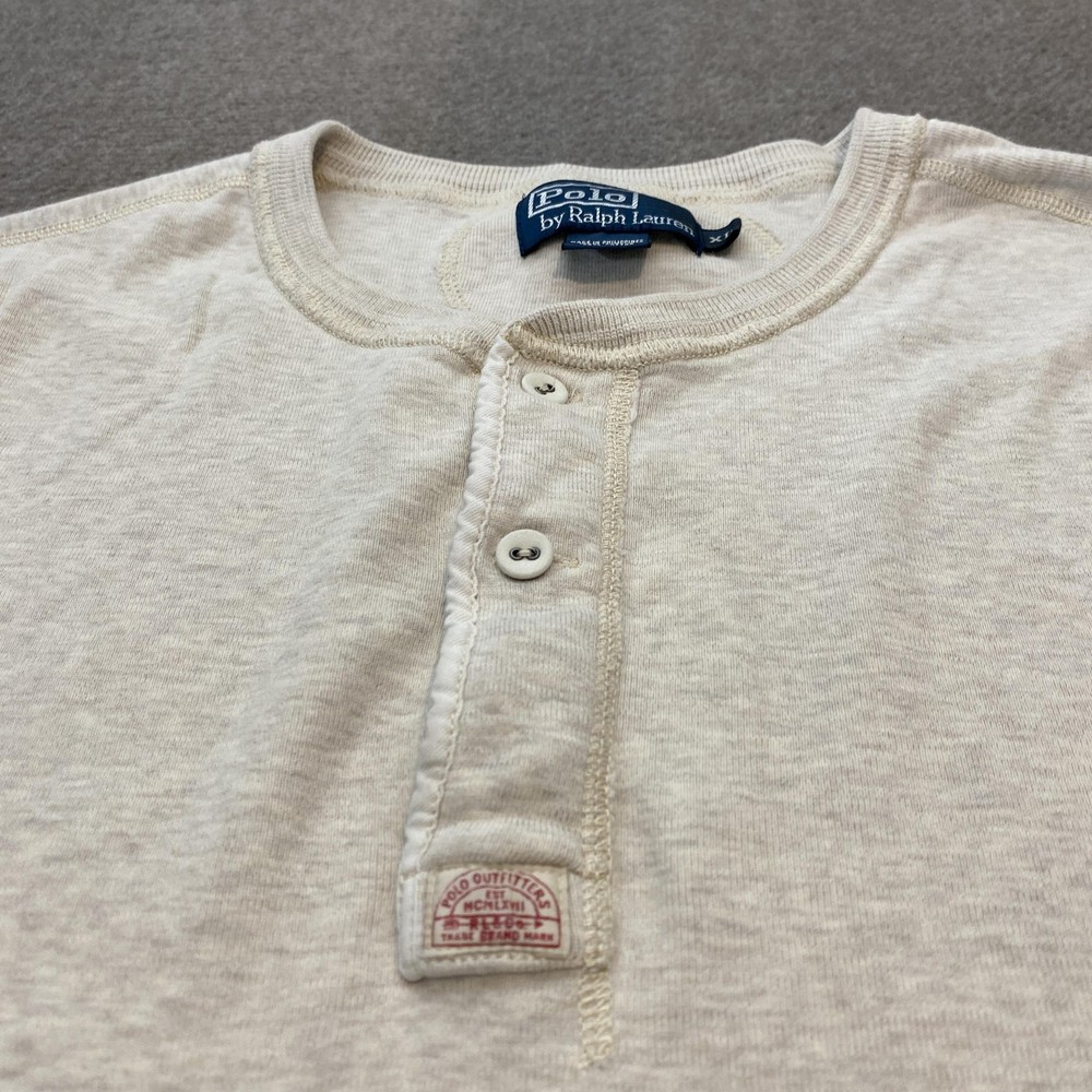 Pre-owned Polo by Ralph Lauren Henley shirt with minimal signs of previous wear. Cotton knit fabric, collar, cuffs, and hem are clean and intact with no stains, holes, or loose seams, and the front hem logo print remains clear. Buttons are secure and functional. Brand: Polo by Ralph Lauren. Style: Mens long sleeve Henley knit shirt. Color: Beige heathered solid knit with tonal stitching and ribbed trim. Size: Mens XL as indicated on the interior neck label. Material: 100% cotton knit fabric as listed on the interior tag. Design details: Henley neckline with three-button placket, ribbed knit collar and cuffs, straight hem, and soft jersey knit construction suitable for layering. Branding and identifiers: Polo by Ralph Lauren neck label with XL size marking and Made in Philippines 100% cotton notation, small woven Polo Outfitters label at the base of the placket, and circular Polo Ralph Lauren Co fine outdoor goods logo graphic with animal illustration printed near the front hem. Features: Classic Henley silhouette designed for all-season wear, breathable cotton knit intended for casual everyday use, and neutral beige color that pairs easily with jeans, chinos, or joggers. Special notes: Polo by Ralph Lauren mens size XL beige long sleeve cotton Henley shirt.