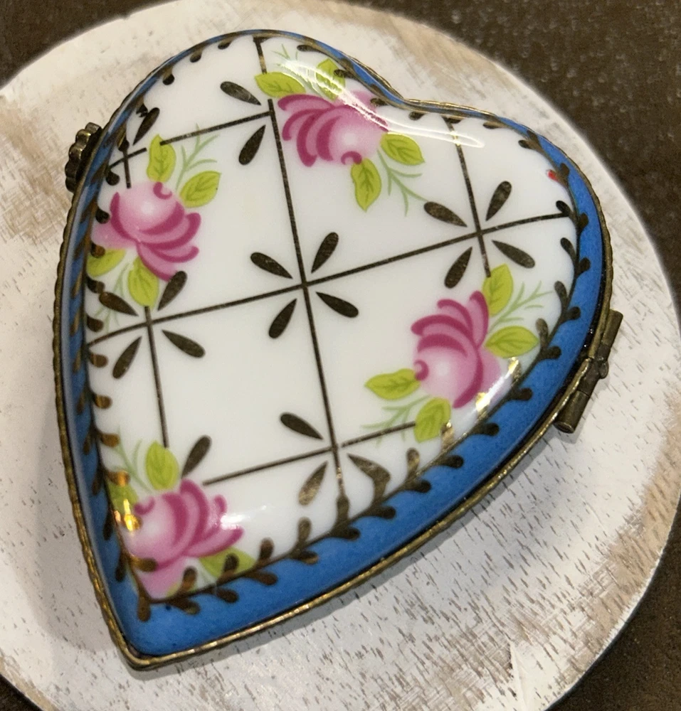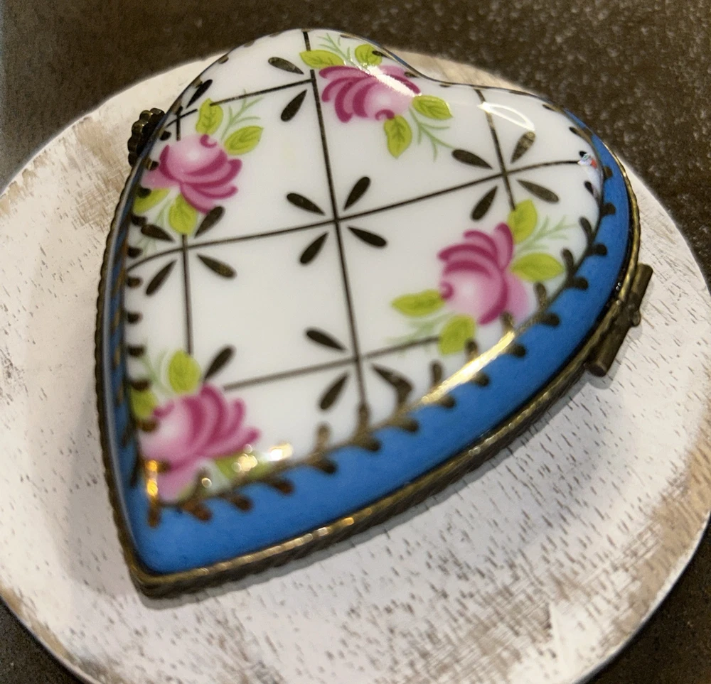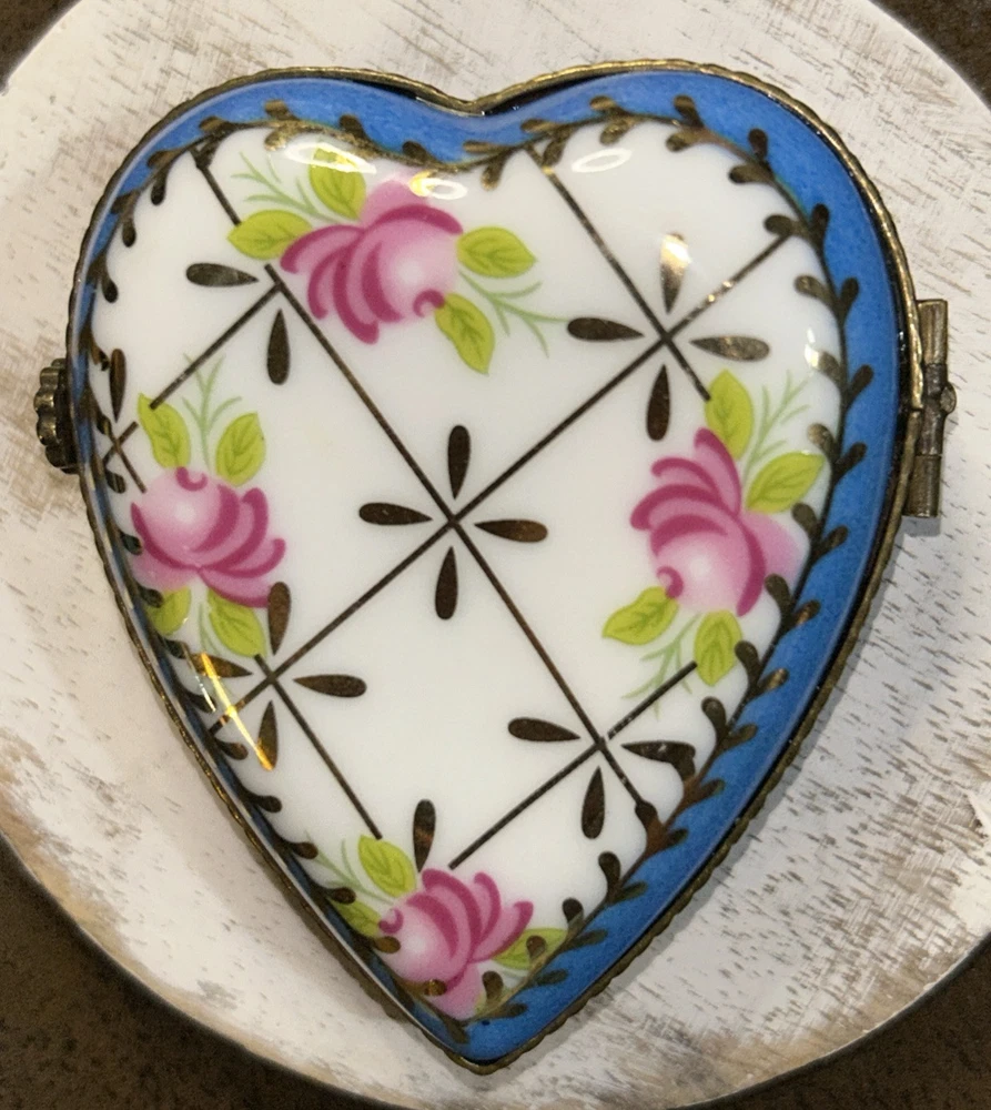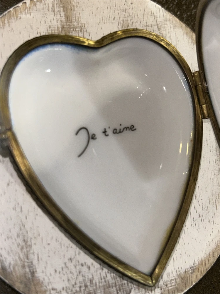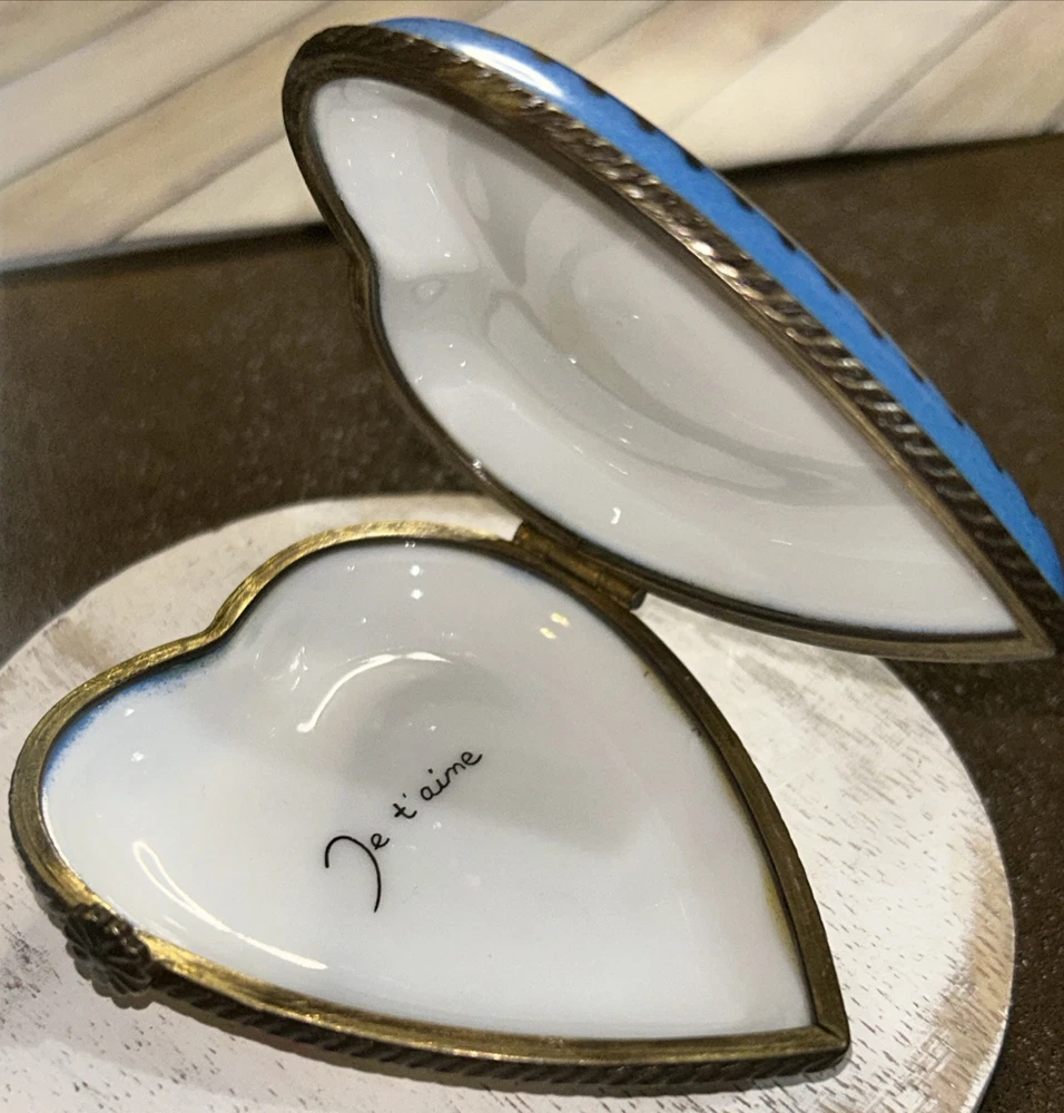 VTG Porcelain Je t'aime Love Heart Shaped Trinket Pill Box Limoges Style Hand Painted Pink Flowers With Gold Accents On Baby Blue And White Porcelain 3” Long 2.5” Wide Beautiful Item Very Good Condition See All Pics As Part Of Full Description