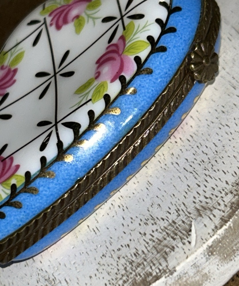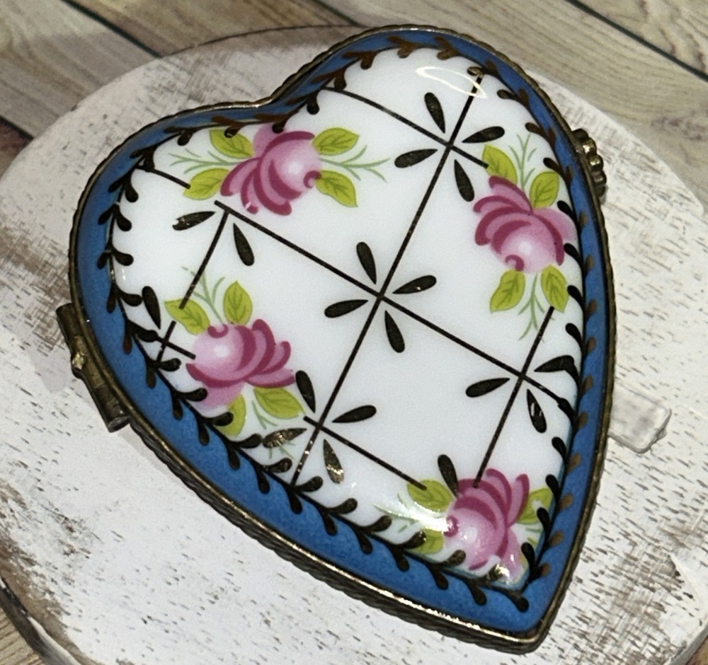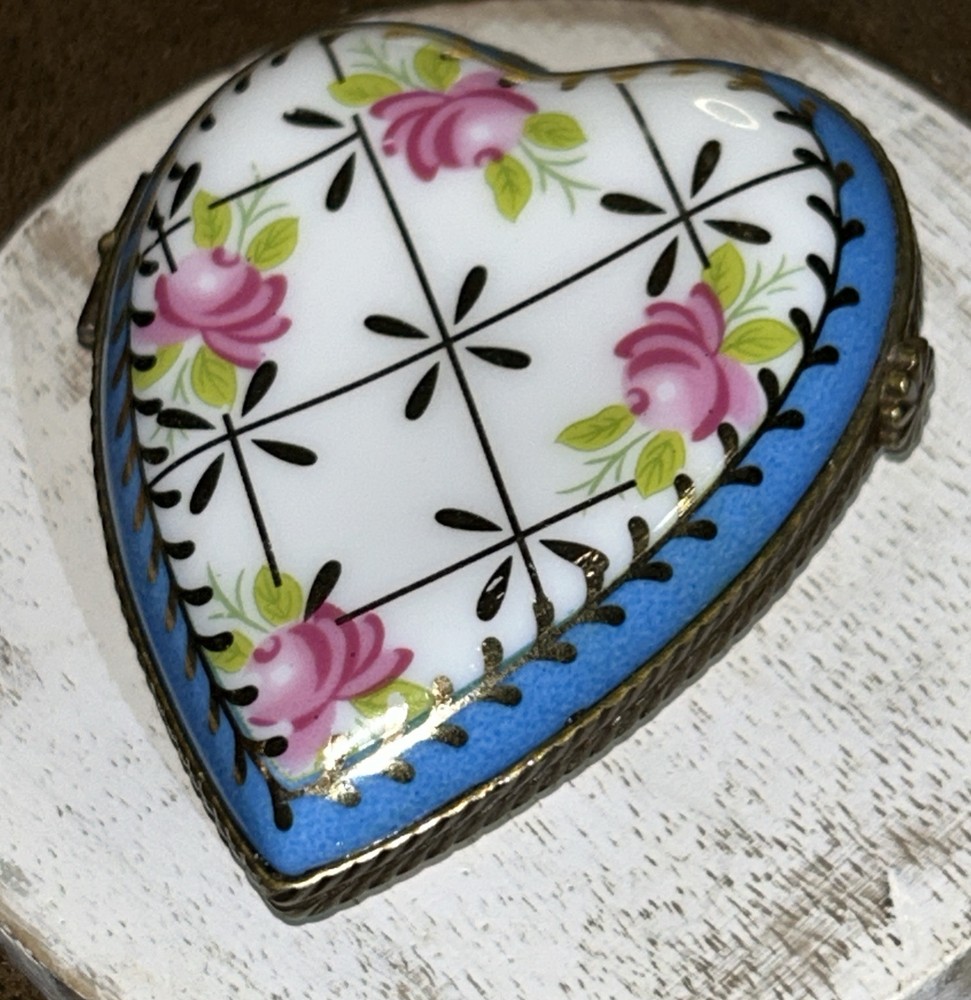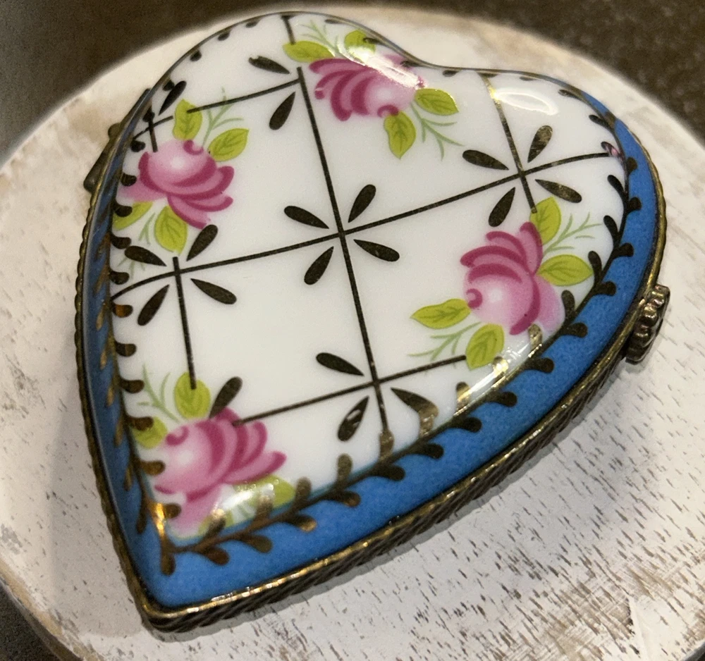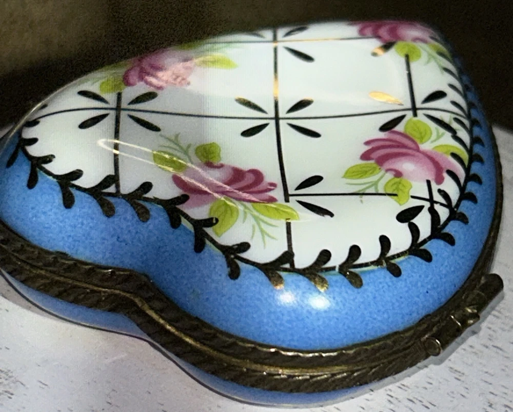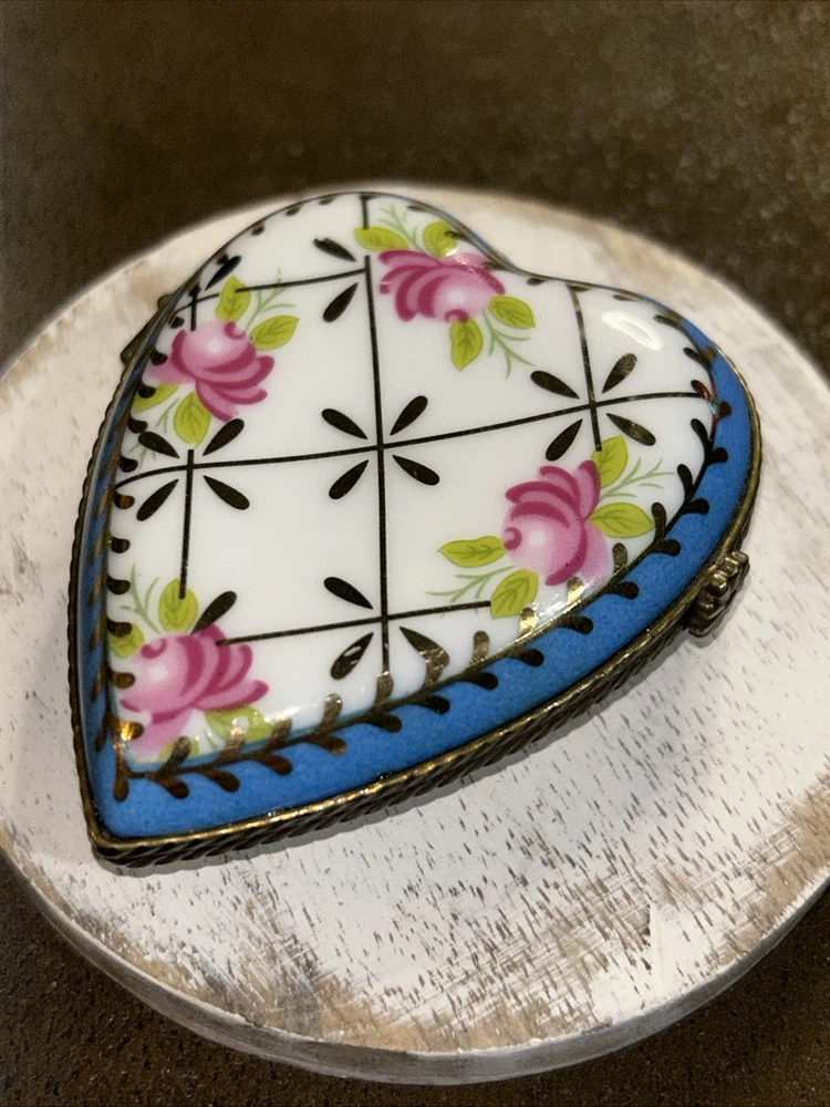 VTG Porcelain Je t'aime Love Heart Shaped Trinket Pill Box Limoges Style Hand Painted Pink Flowers With Gold Accents On Baby Blue And White Porcelain 3” Long 2.5” Wide Beautiful Item Very Good Condition See All Pics As Part Of Full Description