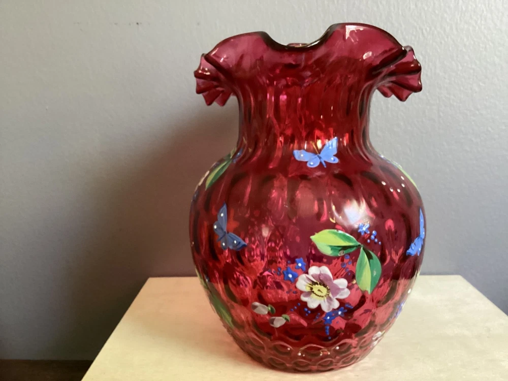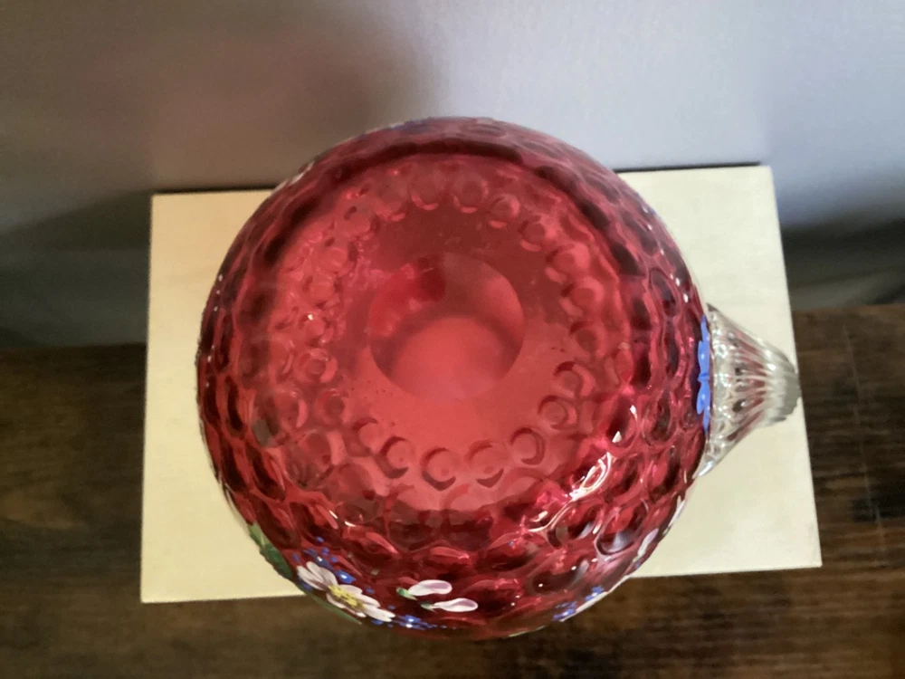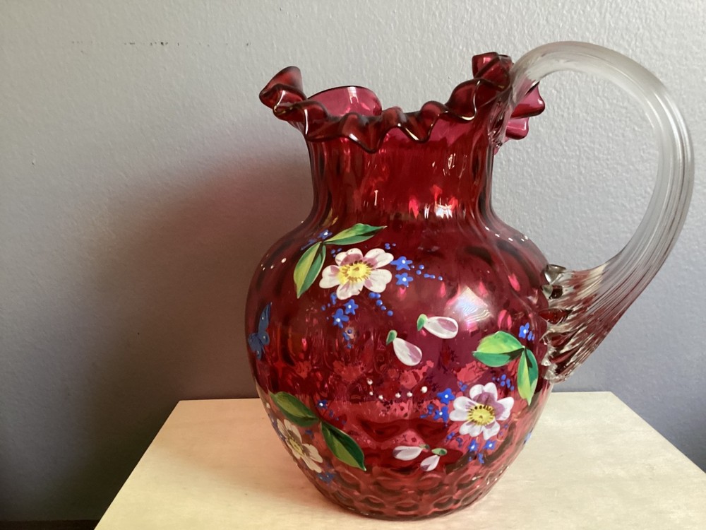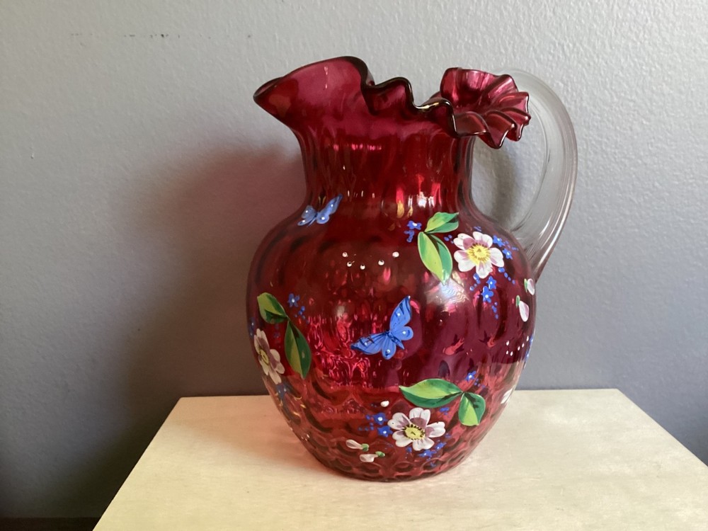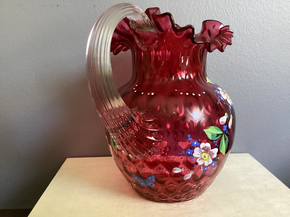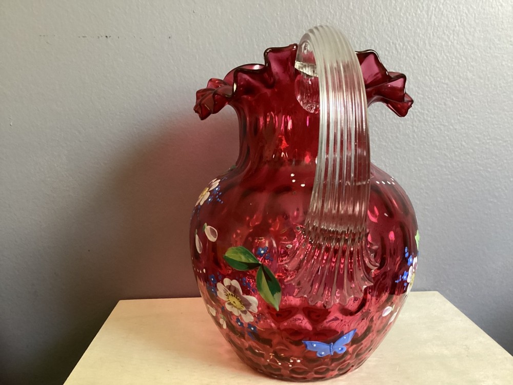 The product is a vintage Fenton Cranberry Art Glass Pitcher with a hand-painted enamel floral design. This mid-century modern piece features a glossy red finish and is hand-blown glass. Made in the United States during the 1950s, this original pitcher from the Dot product line showcases intricate floral patterns, adding a touch of retro charm to any home decor.