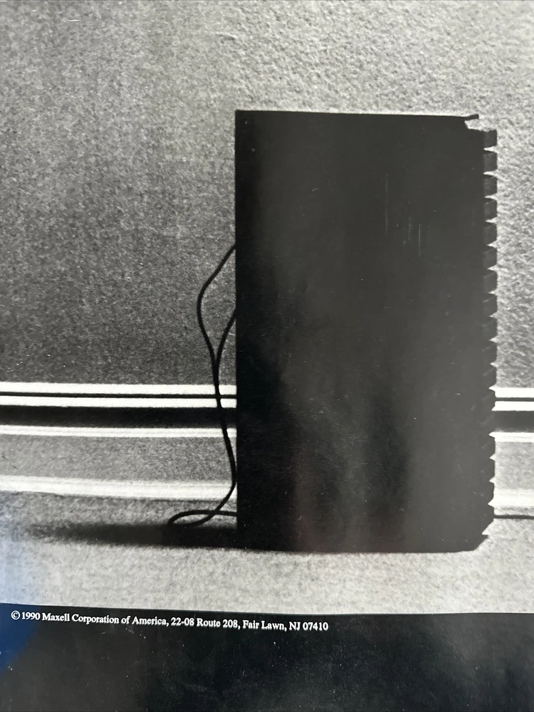 This is an original 1990 poster. It’s an ad for Maxell Cassette Tapes. Blown Away Guy. “Maxell the Tape that Delivers Higher Performance” in bottom right corner. Good condition, but has a minor tear on upper right edge and some minor white wrinkles around edges. See photos for close-up. Could be custom-matted to exclude these minor white marks and tiny corner pinholes, if framing, as they are just around the 1”edge of poster. See photos. The central artwork/photo part is in very good condition. It’s been rolled up for 34 years and will ship rolled in a tube. Measures. 20” x 39.5”.