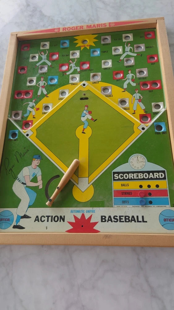 This vintage toy game is a must-have for any baseball fan! Featuring the iconic Roger Maris in action, this 1962 Pressman Corp game is sure to bring back memories of childhood game nights and playground battles. The game is a skill and action game, making it perfect for players of all ages and levels. Please check out my photos. The graphics are bright and ut can use a wiping down. If you have any questions please contact me before you bid. The game includes a tin toy of Roger Maris, with a bat and 2 pegs. The bottom of the box is included no top. The player can take turns hitting the ball and running the bases, trying to get as many runs as possible. The game is perfect for collectors and fans of vintage toys and sports memorabilia. Add it to your collection today! Winning bidder pays USPS Ground Advantage shipping. Please check out my other auctions going on now and as always have a great day. Track Page Views With Auctiva's Counter