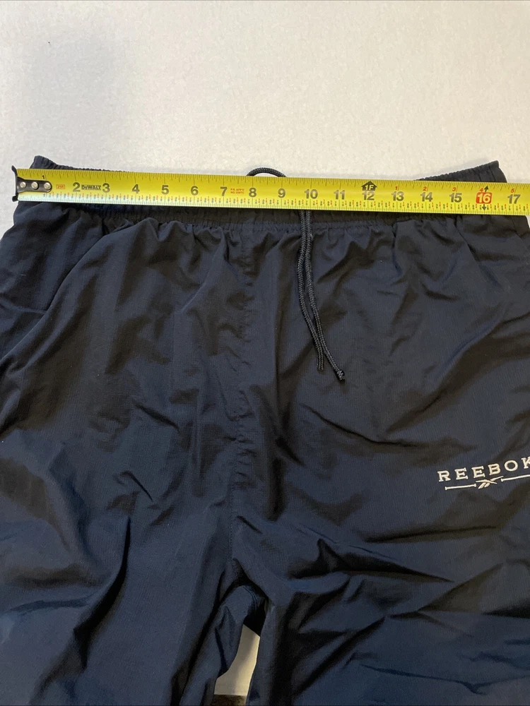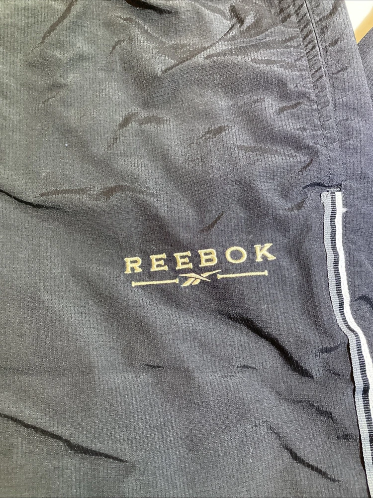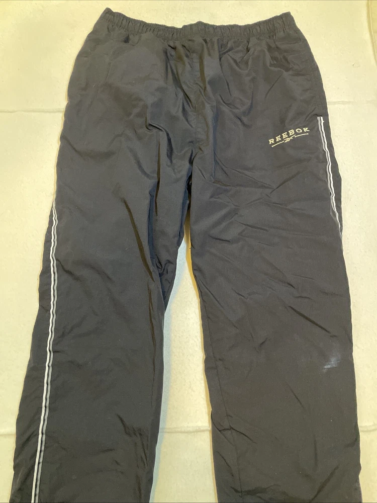 -Used. Sold as is -No rips or stains -See photos for measurements -Fast shipping!!! This Vintage Reebok Track Pants are designed for men in size XL, featuring a drawstring closure and ankle zips. Made of polyester softshell fabric, these black pants have a soft lining, making them windproof. The elastic waist and straight leg style offer a comfortable fit, suitable for activities like running, jogging, and training. The pants have pockets and a retro hip-hop style, perfect for casual wear or activewear with a vintage touch.