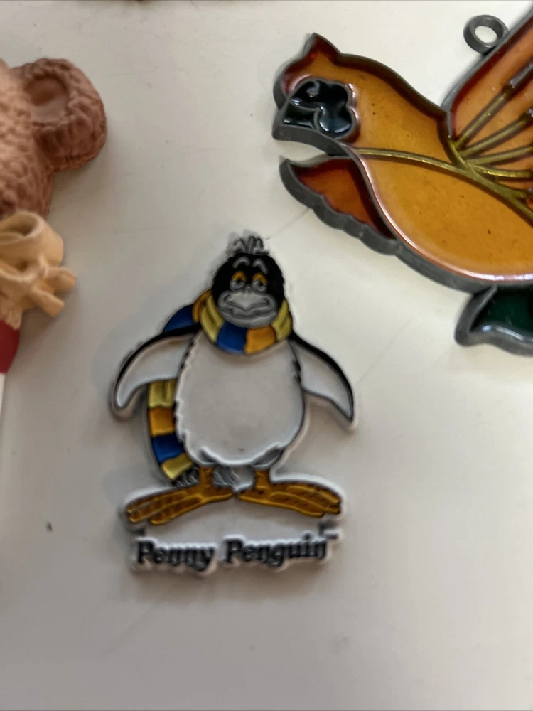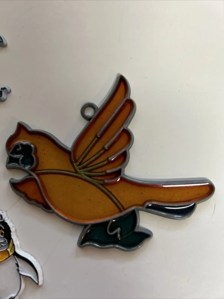 Add a touch of nostalgia to your fridge with these vintage refrigerator magnets. Featuring cute birds and bears, these magnets are made of wood, glass, and plastic for durability. Perfect for collectors or anyone who wants to add some charm to their kitchen. This set includes four fridge magnets and one cardinal stained glass ornament . Get your hands on these unique magnets from the 1980s and bring a bit of whimsy to your home. Great condition