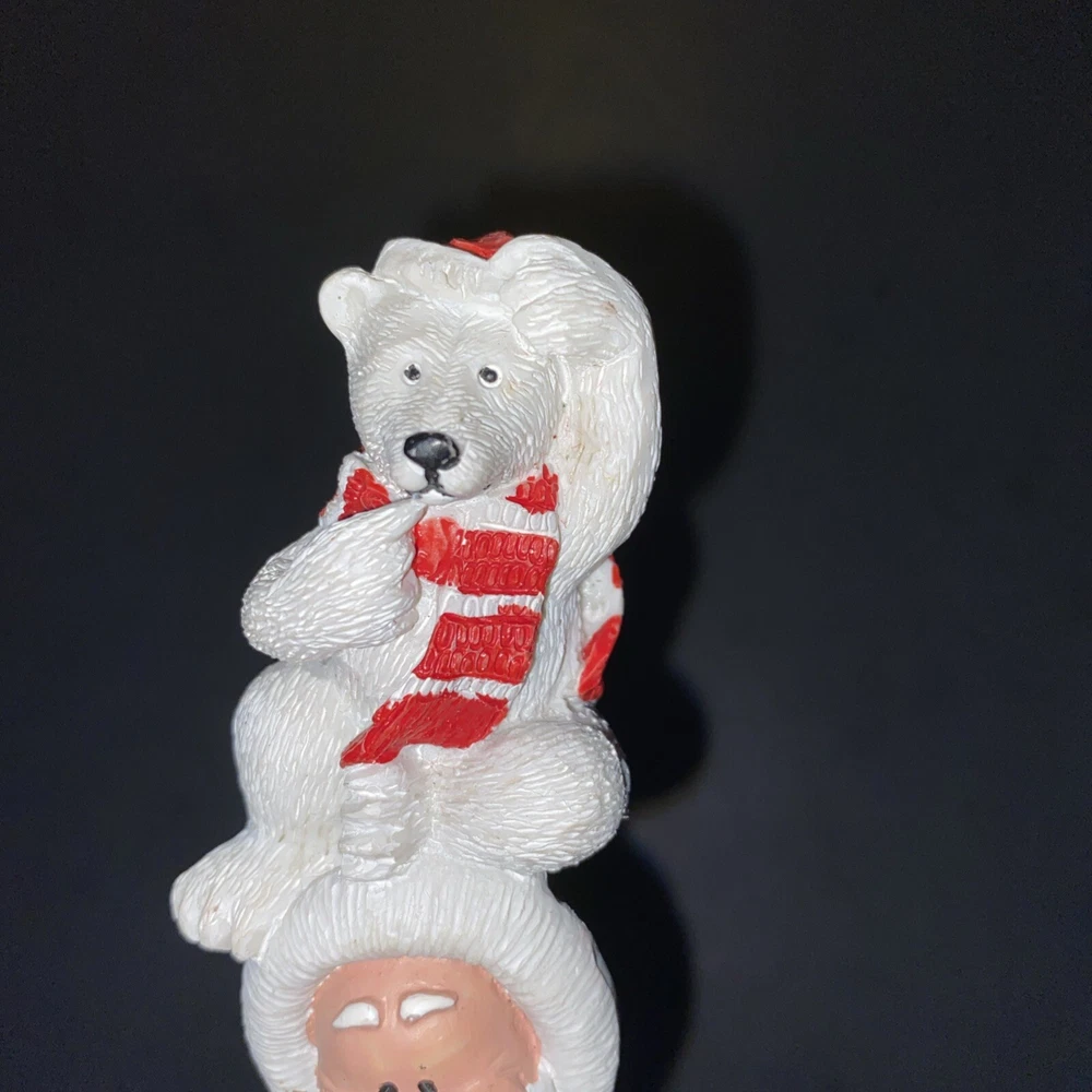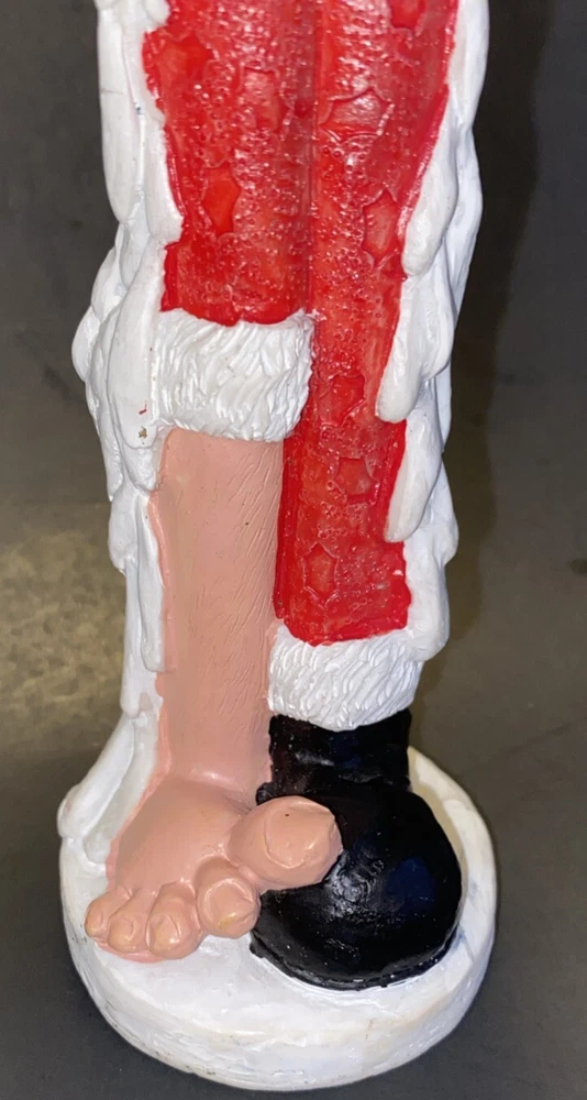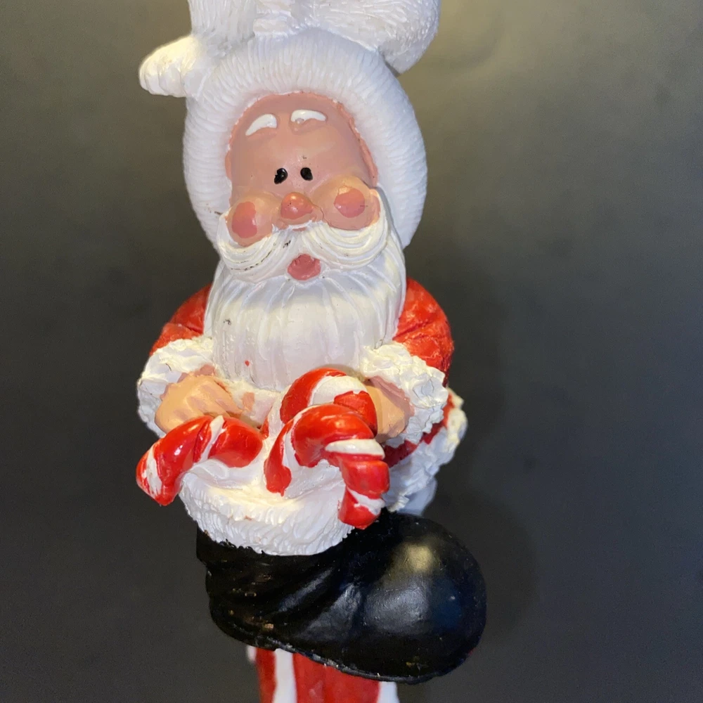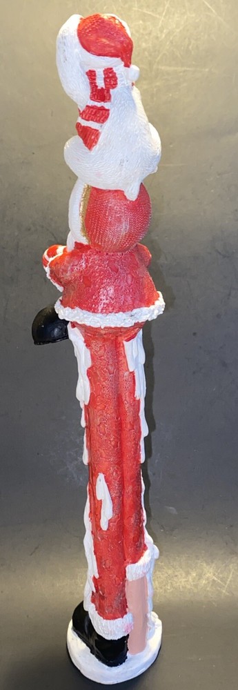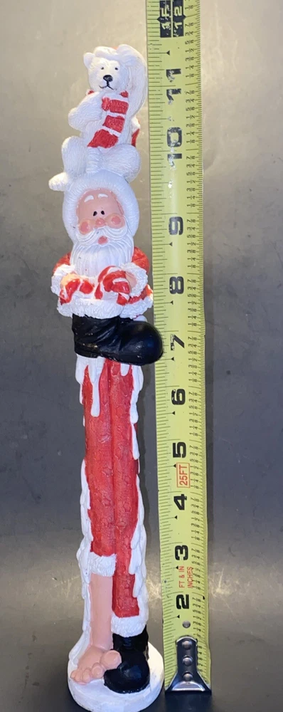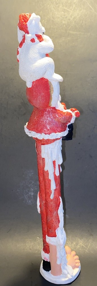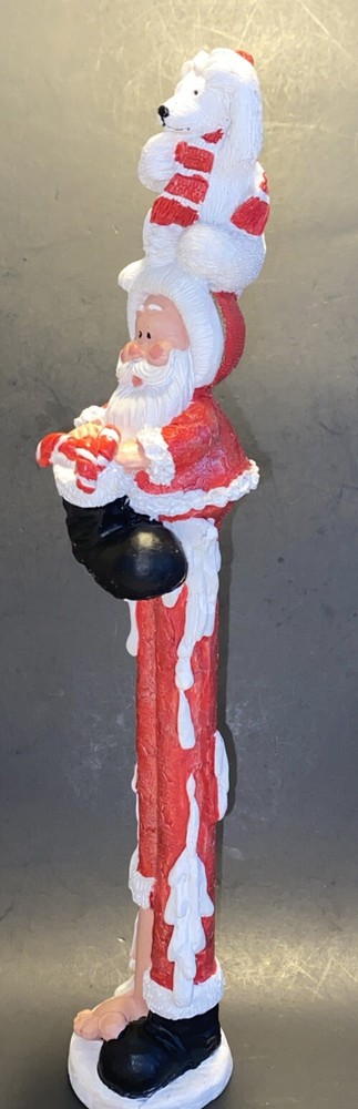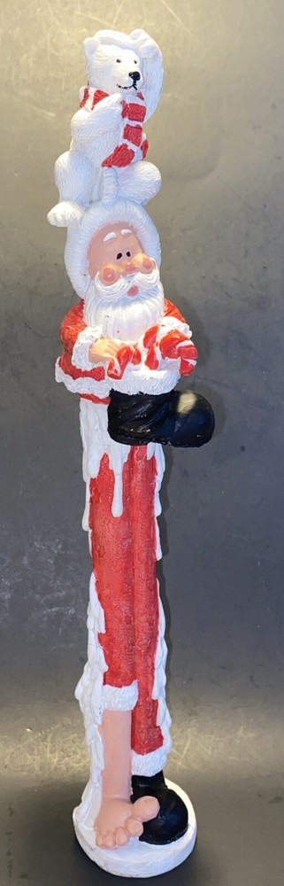 Cute whimsical Vintage Pencil Resin Santa w Polar Bear On Head Candy Canes In Boot Bare foot 11” Tall ***** NOTE there is a bit of discoloration on back - maybe from candle wax? See pic.