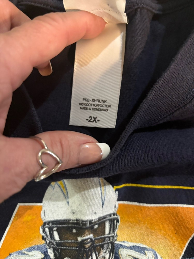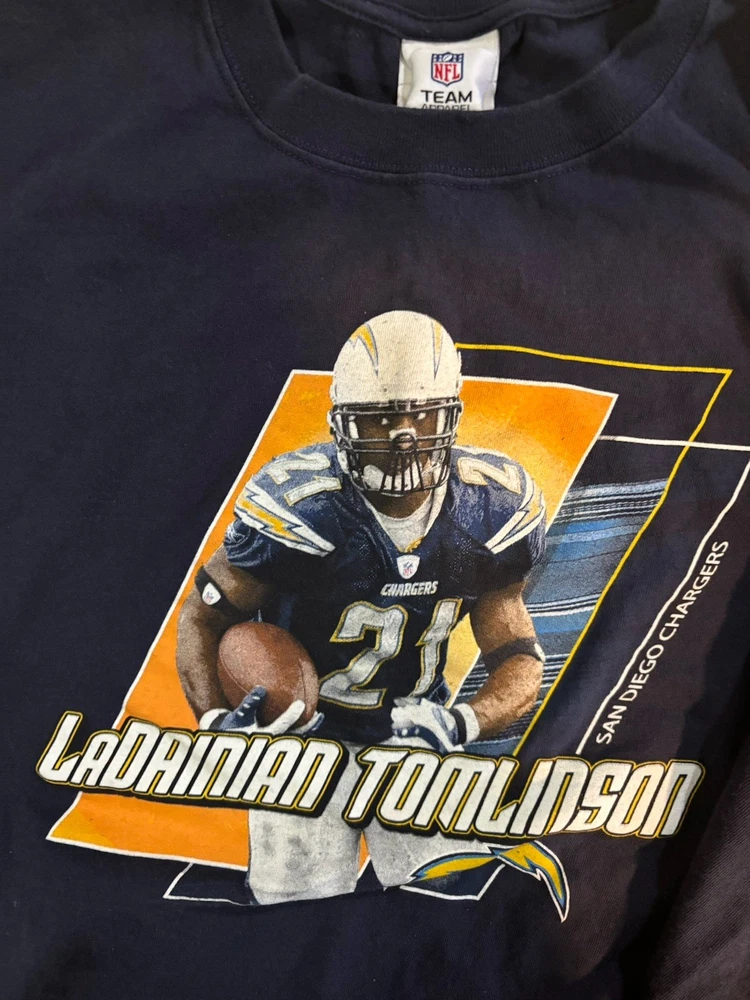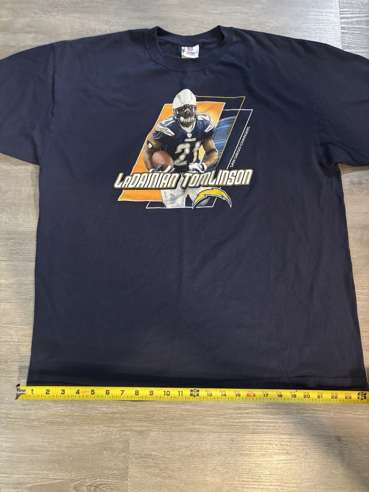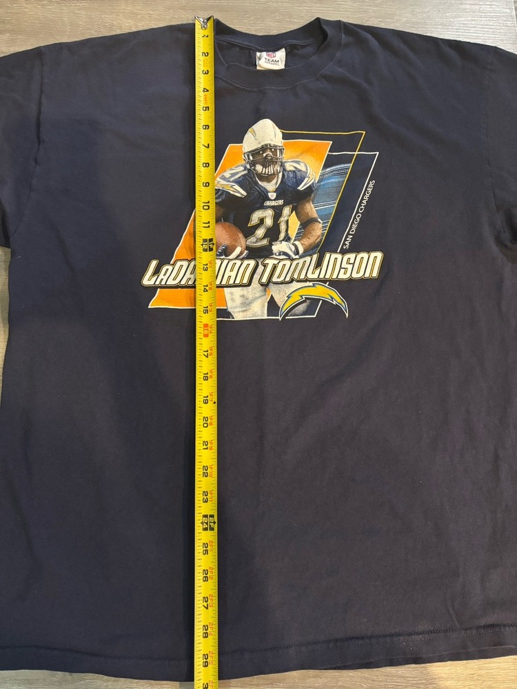 This vintage San Diego Chargers LaDainian Tomlinson NFL t-shirt in size 2XL is perfect for any pro football fan. The classic navy blue color, graphic print, and retro theme make it a must-have for collectors and sports enthusiasts. With a comfortable crew neck and short sleeves, this breathable shirt is suitable for all seasons and easy to care for. Represent the Chargers in style with this limited edition piece from the NFL brand. Please check out my other listings for more cool items!!!