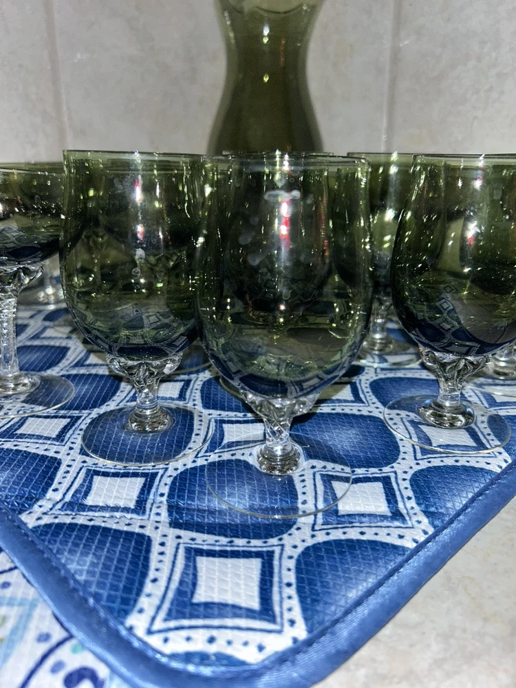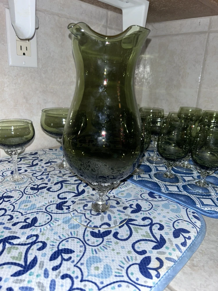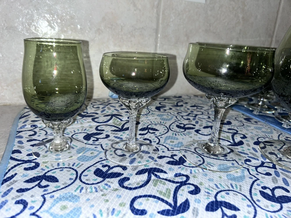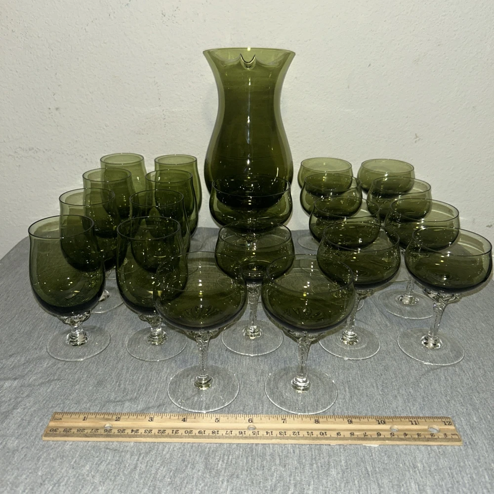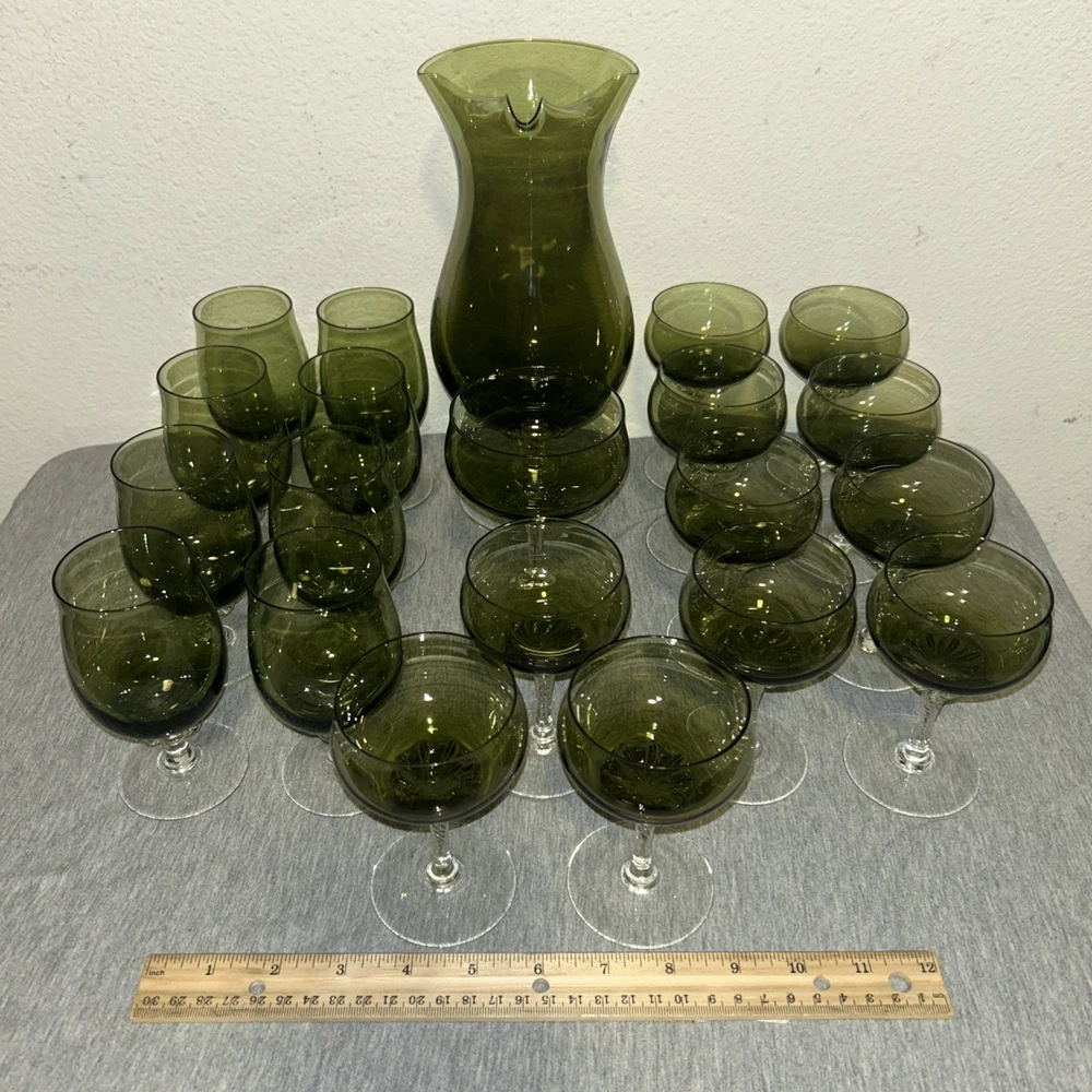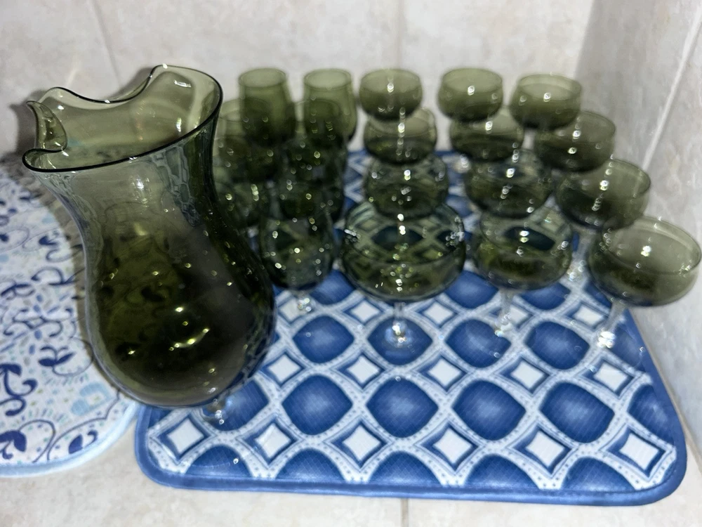 This is a vintage Sasaki hand blown glassware set in a Fantasia Smokey green color. The set includes cordial glasses with etched stems and a pitcher, totaling 21 pieces. The design of the glassware is intricate and stylish, perfect for serving drinks in a sophisticated manner. All pieces are hand crafted in the 1970s, made by sasaki in Japan. Here is what is included in the 21 piece set: 8-6 oz glasswares 11-4oz glasswares 1-8oz glasswares 1-48oz pitcher **Creamer bottle for size reference not included in listing. Drying mats not included in listing**