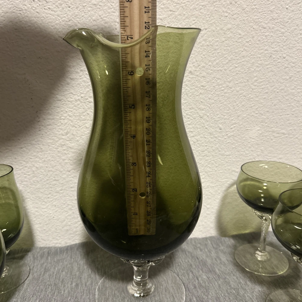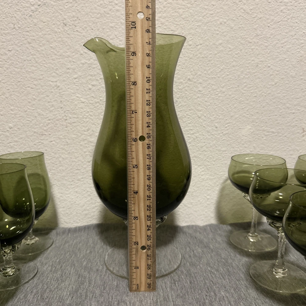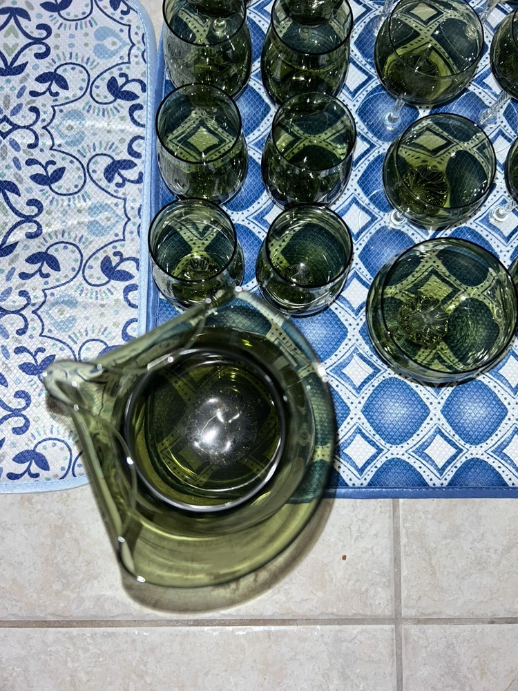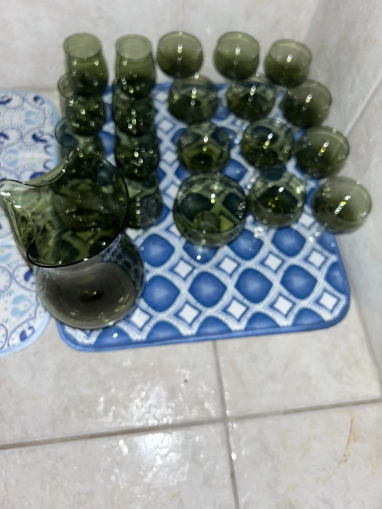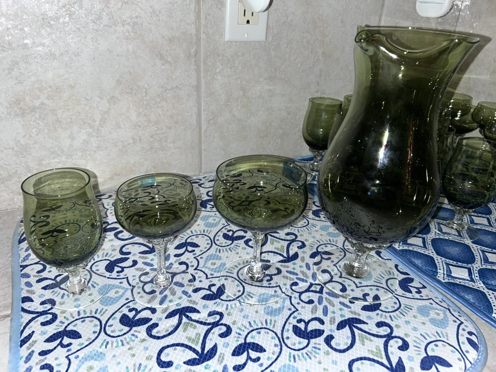 This is a vintage Sasaki hand blown glassware set in a Fantasia Smokey green color. The set includes cordial glasses with etched stems and a pitcher, totaling 21 pieces. The design of the glassware is intricate and stylish, perfect for serving drinks in a sophisticated manner. All pieces are hand crafted in the 1970s, made by sasaki in Japan. Here is what is included in the 21 piece set: 8-6 oz glasswares 11-4oz glasswares 1-8oz glasswares 1-48oz pitcher **Creamer bottle for size reference not included in listing. Drying mats not included in listing**