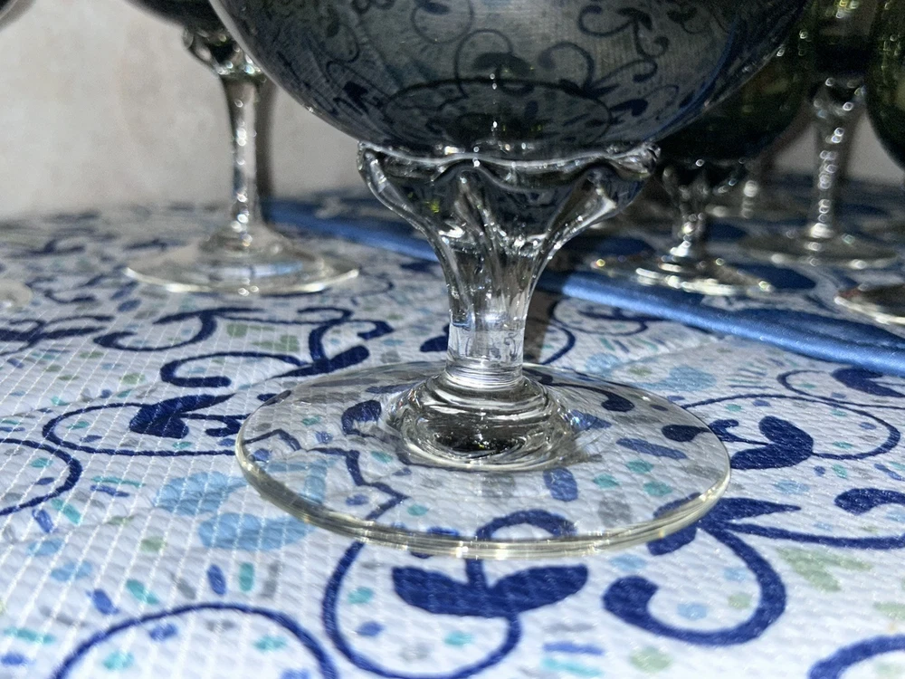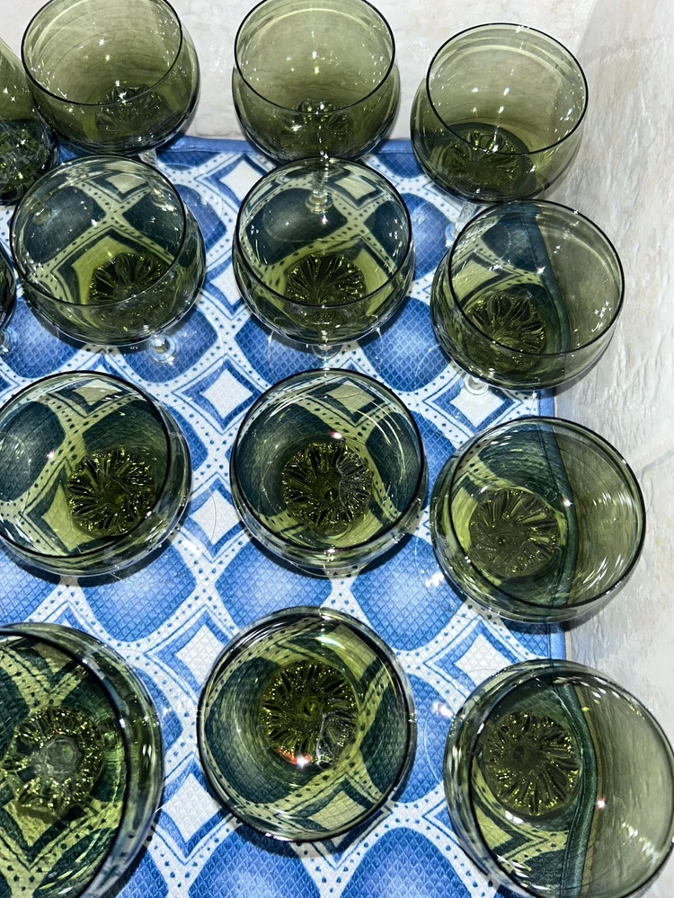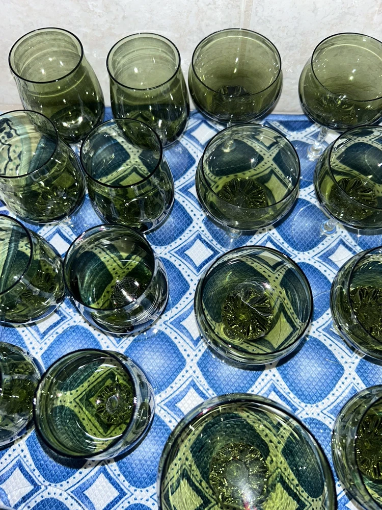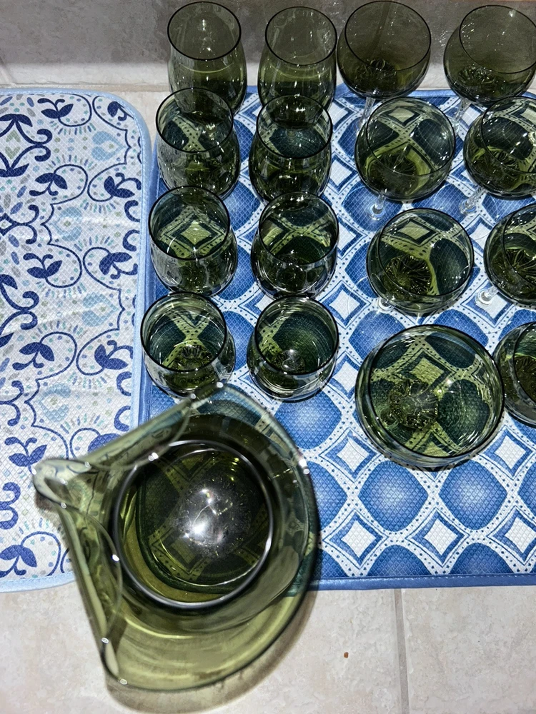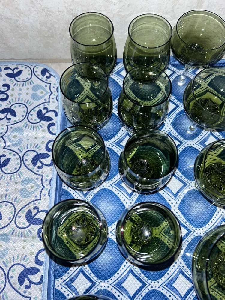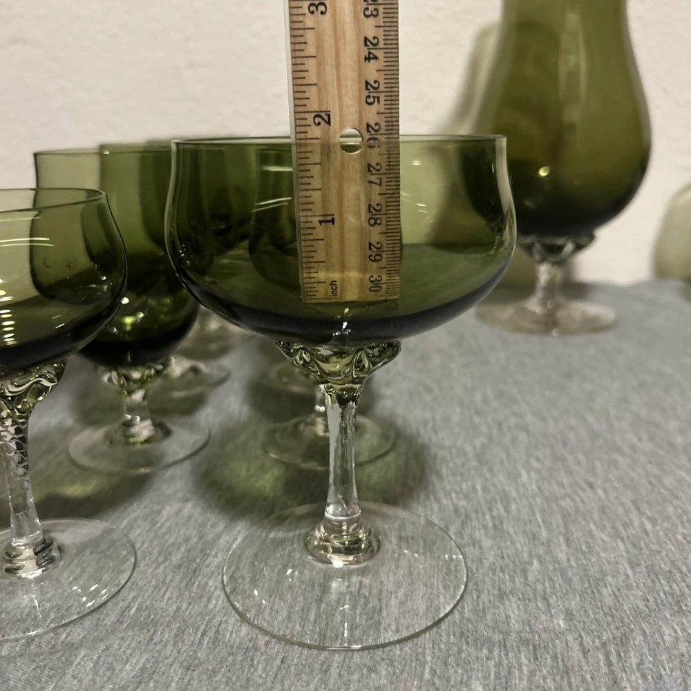 This is a vintage Sasaki hand blown glassware set in a Fantasia Smokey green color. The set includes cordial glasses with etched stems and a pitcher, totaling 21 pieces. The design of the glassware is intricate and stylish, perfect for serving drinks in a sophisticated manner. All pieces are hand crafted in the 1970s, made by sasaki in Japan. Here is what is included in the 21 piece set: 8-6 oz glasswares 11-4oz glasswares 1-8oz glasswares 1-48oz pitcher **Creamer bottle for size reference not included in listing. Drying mats not included in listing**