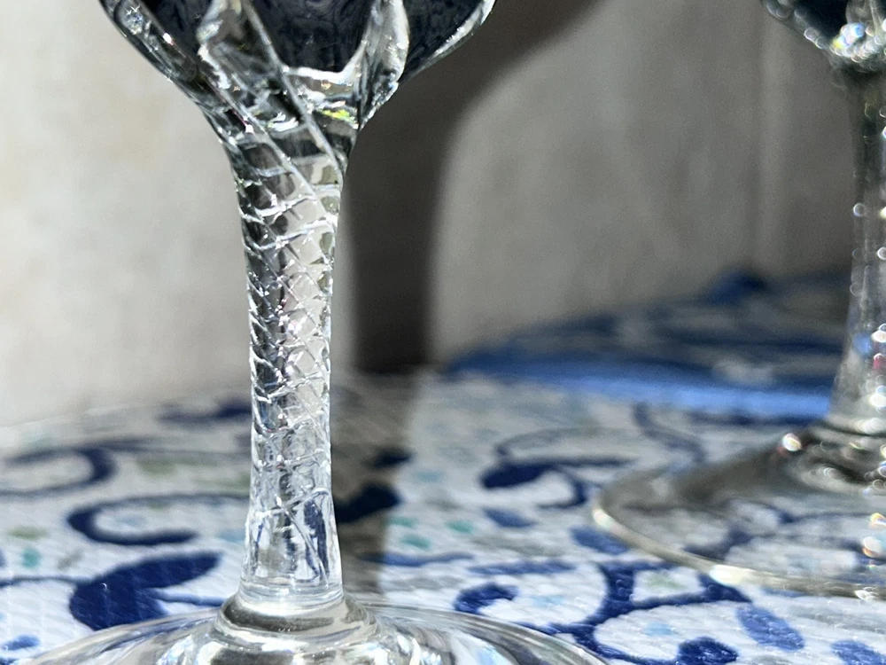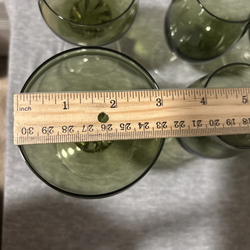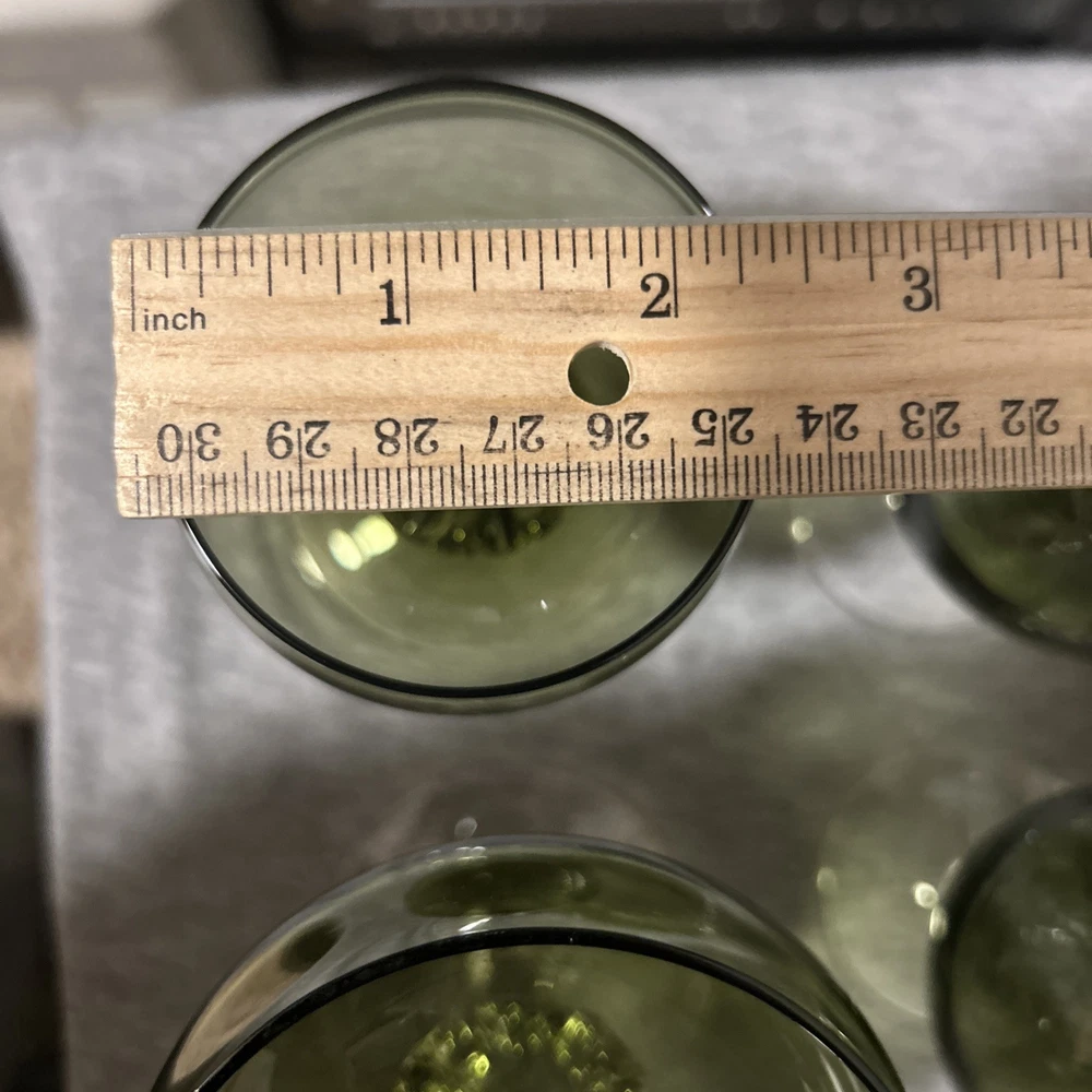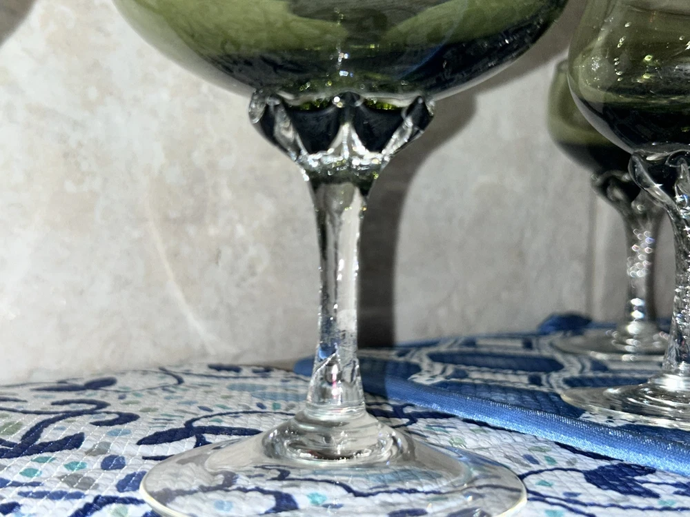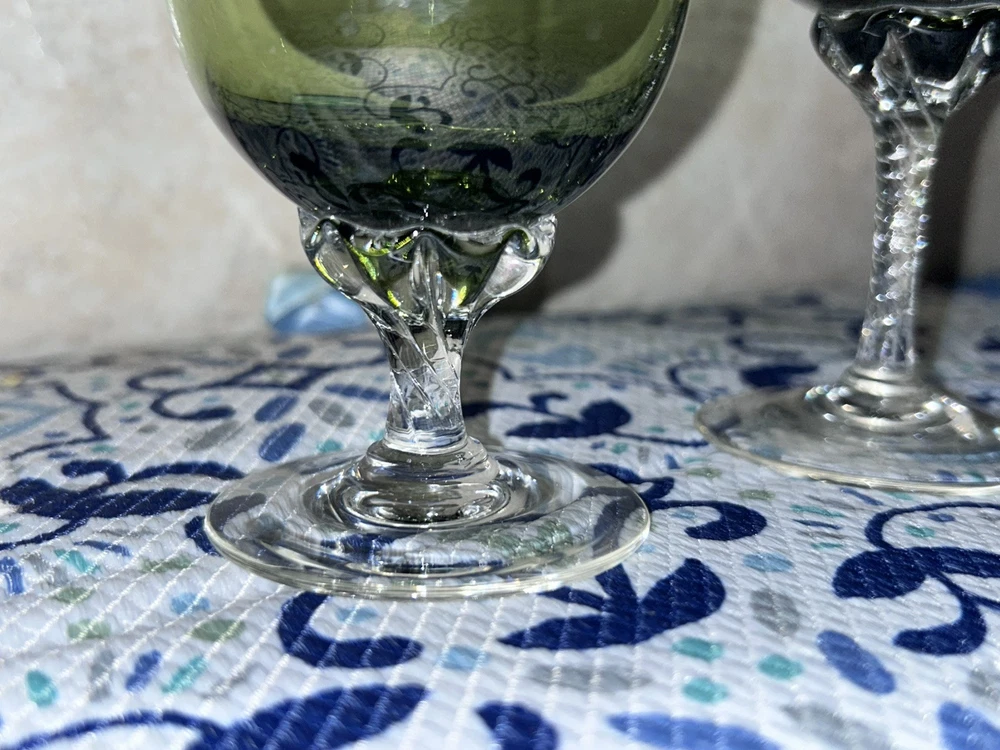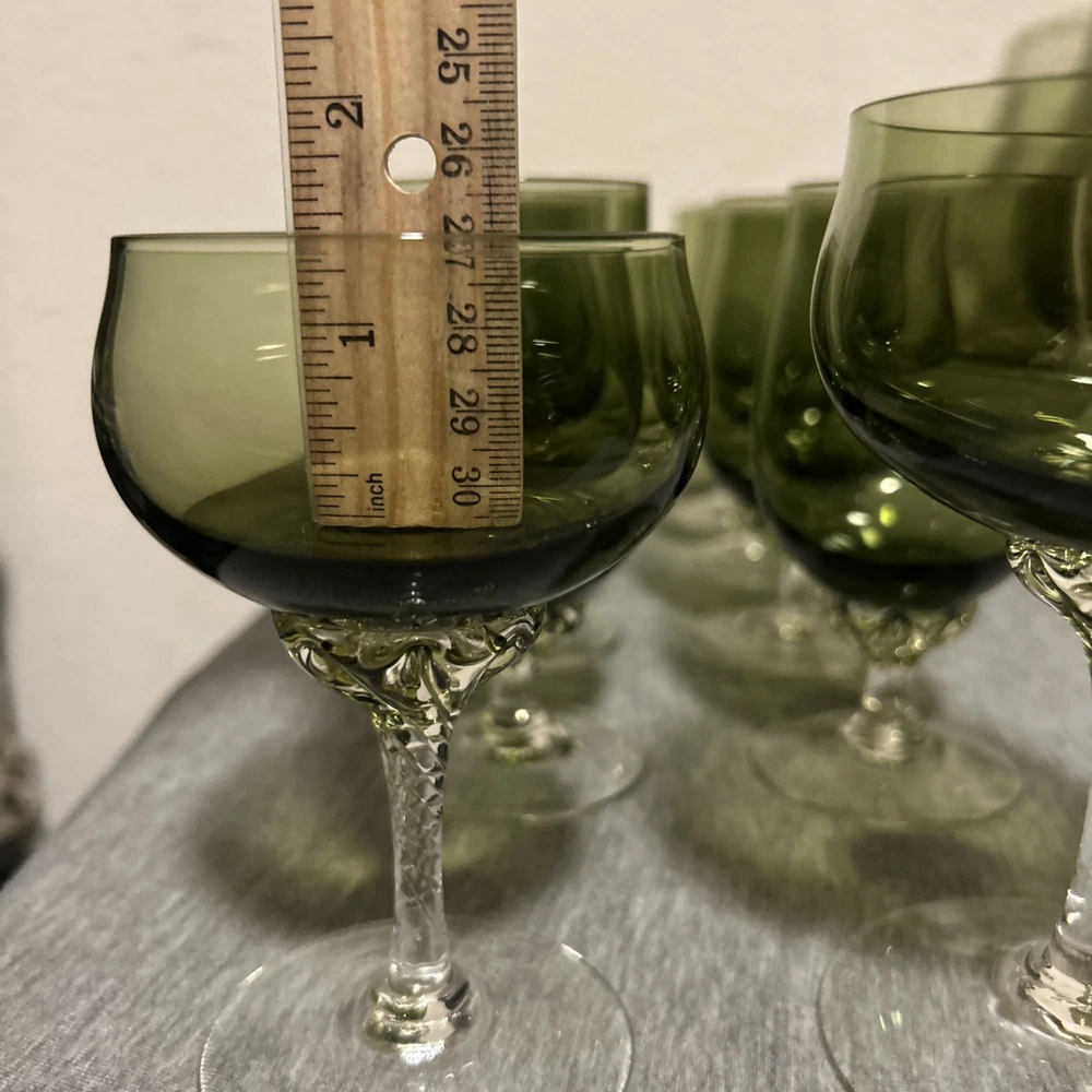 This is a vintage Sasaki hand blown glassware set in a Fantasia Smokey green color. The set includes cordial glasses with etched stems and a pitcher, totaling 21 pieces. The design of the glassware is intricate and stylish, perfect for serving drinks in a sophisticated manner. All pieces are hand crafted in the 1970s, made by sasaki in Japan. Here is what is included in the 21 piece set: 8-6 oz glasswares 11-4oz glasswares 1-8oz glasswares 1-48oz pitcher **Creamer bottle for size reference not included in listing. Drying mats not included in listing**